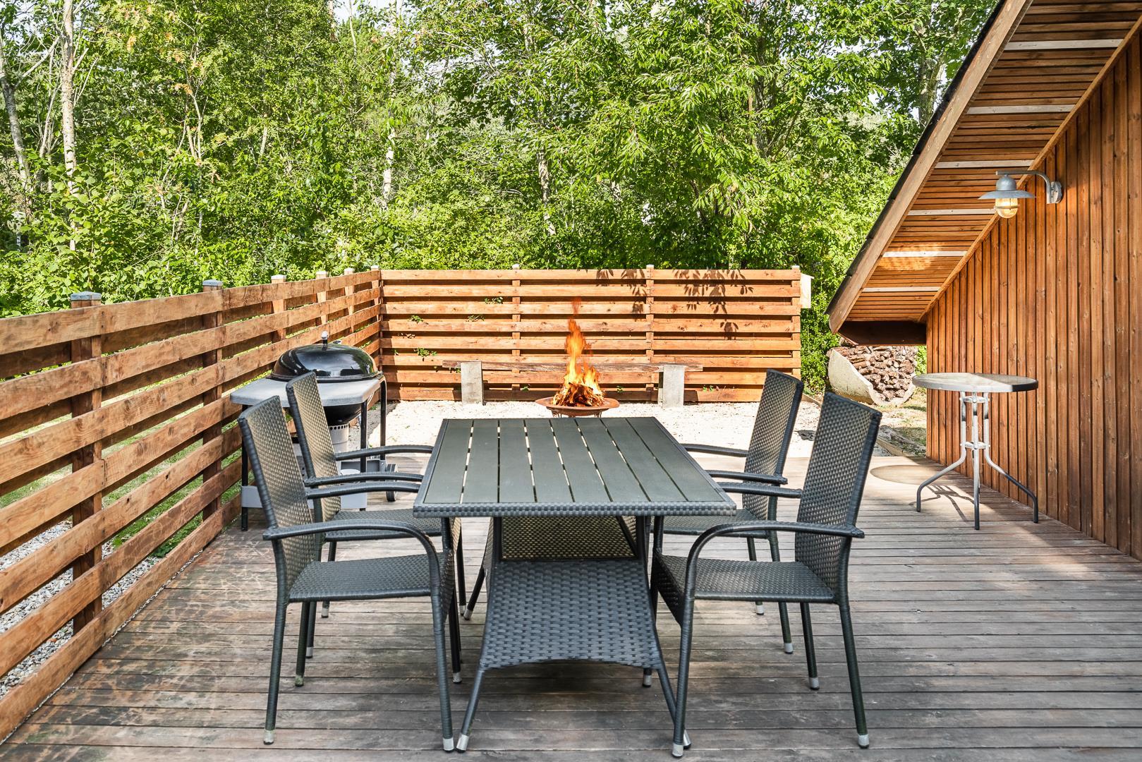 Die Terrasse ist der perfekte Ort für Frühstück im Freien, gemütliche Nachmittage oder entspannte Abende nach einem Ausflug ans Meer. Ob Sonne tanken oder einfach die Ruhe genießen – der Außenbereich ergänzt den Komfort des Ferienhauses optimal. Auch für den Urlaub mit Hund in Jegum Ferieland ist das Grundstück gut geeignet, da viel Platz für Bewegung und kurze Spaziergänge direkt ab dem Ferienhaus vorhanden ist.