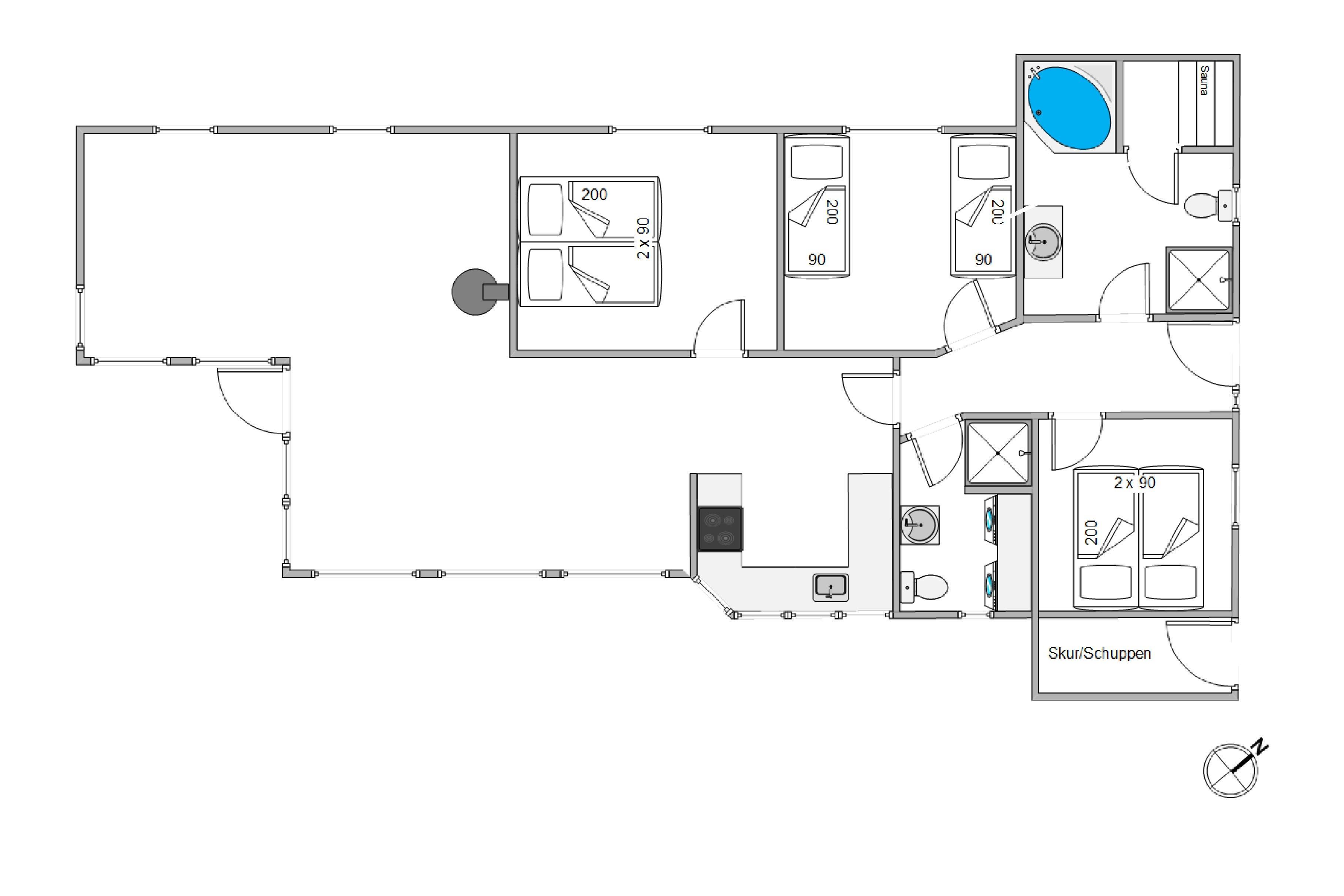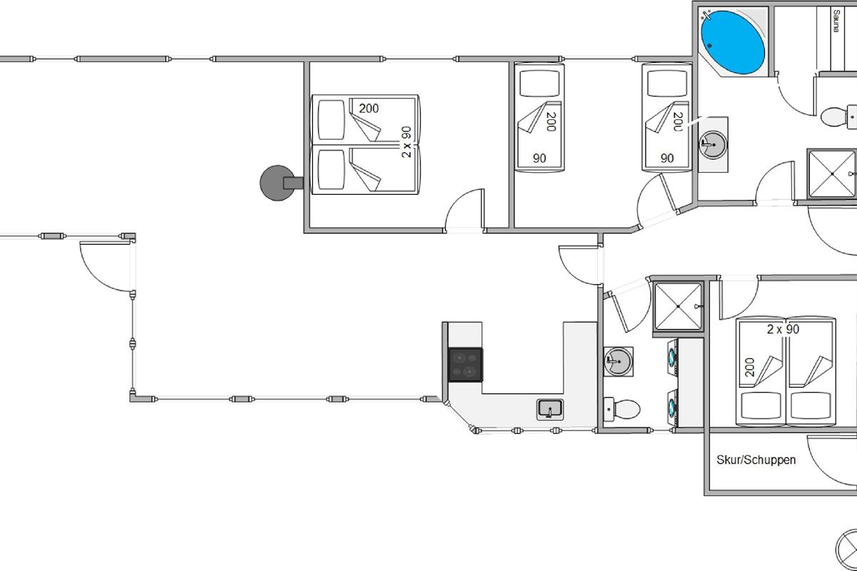 The holiday home at Sydskrænten 23 features 3 comfortable bedrooms. One bedroom has a cosy double bed, while the other two bedrooms each have 2 single beds. The 2 modern bathrooms offer all the amenities needed for a pleasant stay. One bathroom features underfloor heating for added comfort, while the whirlpool is perfect for relaxing after an eventful day.