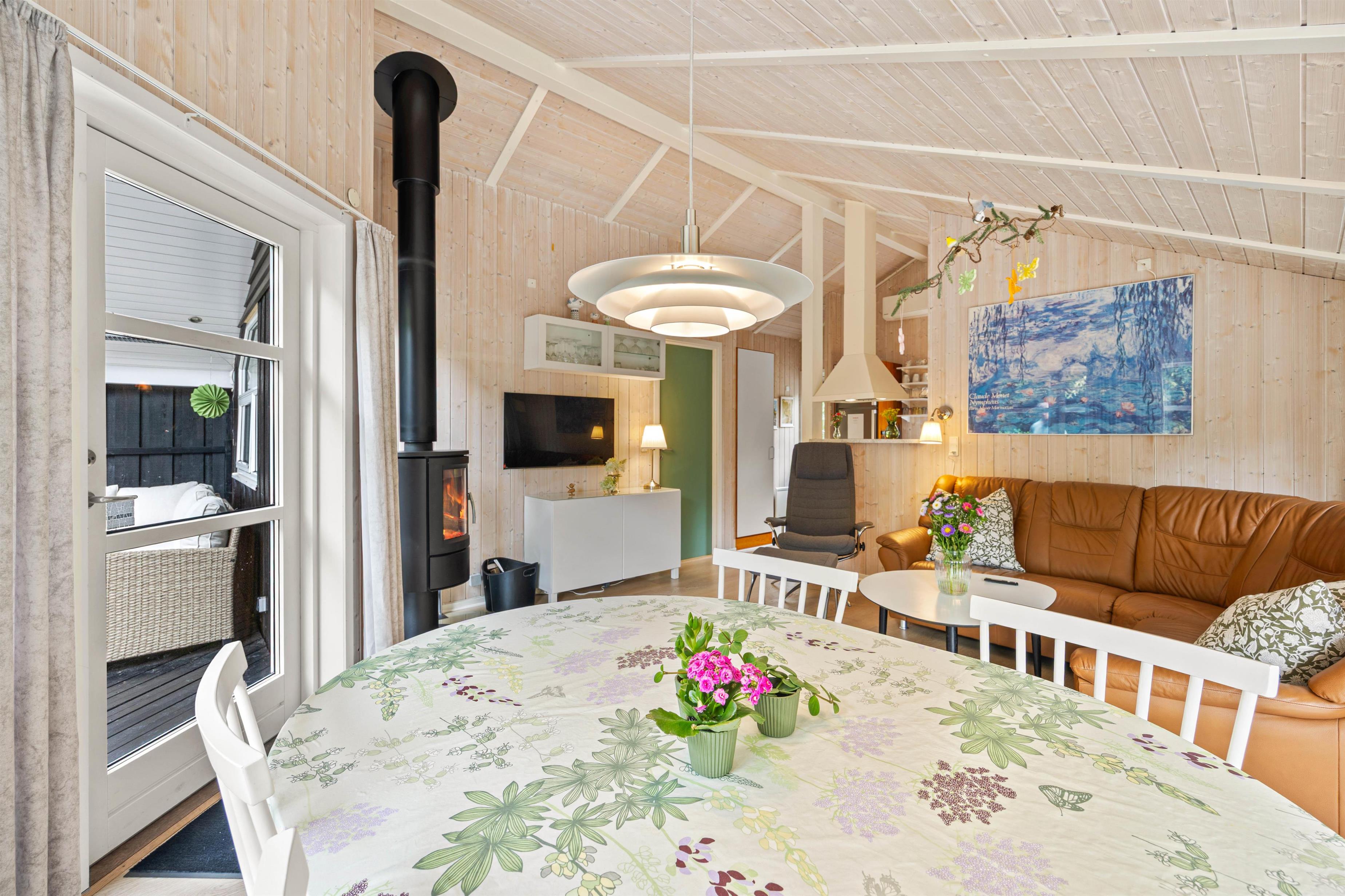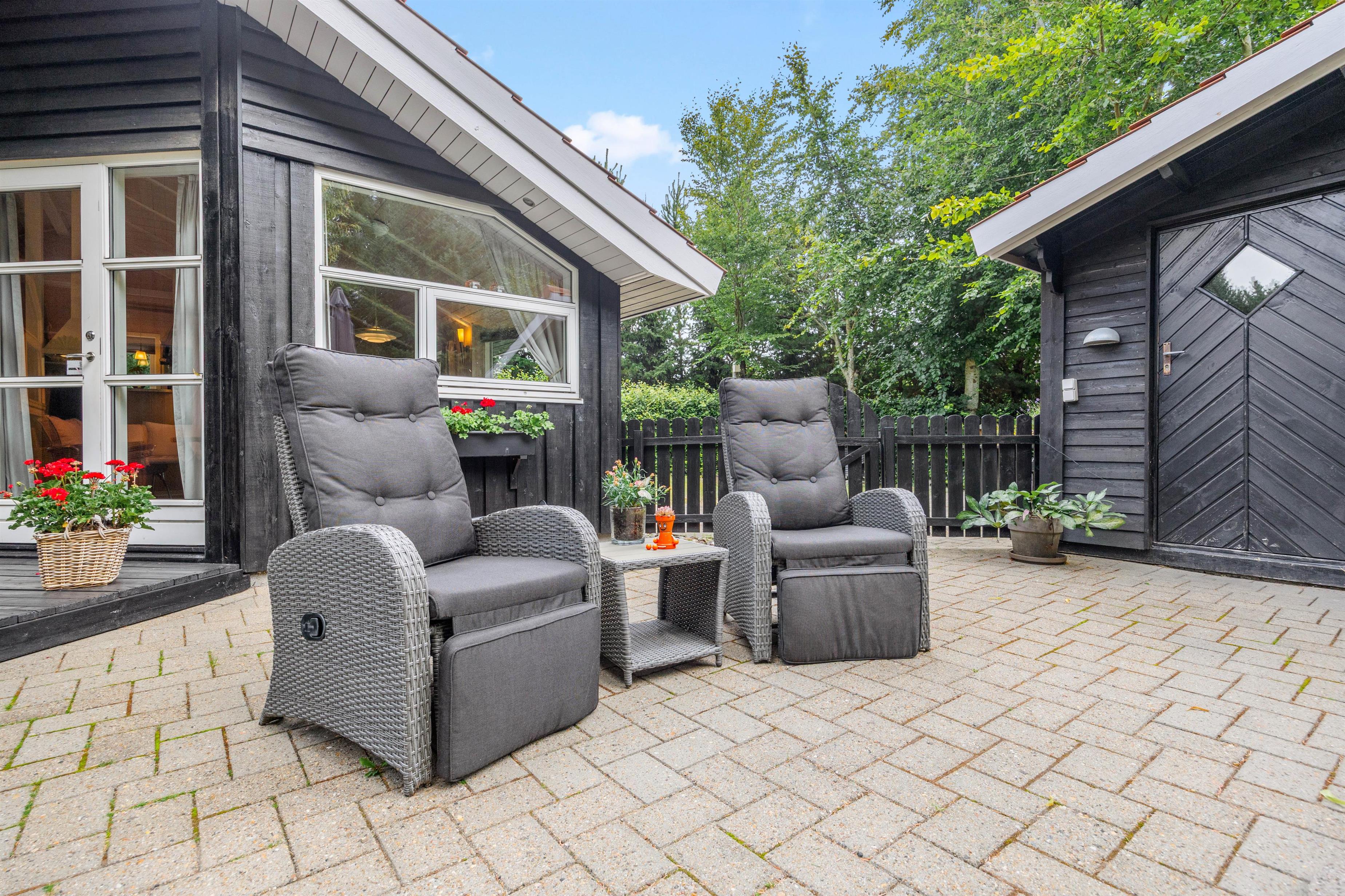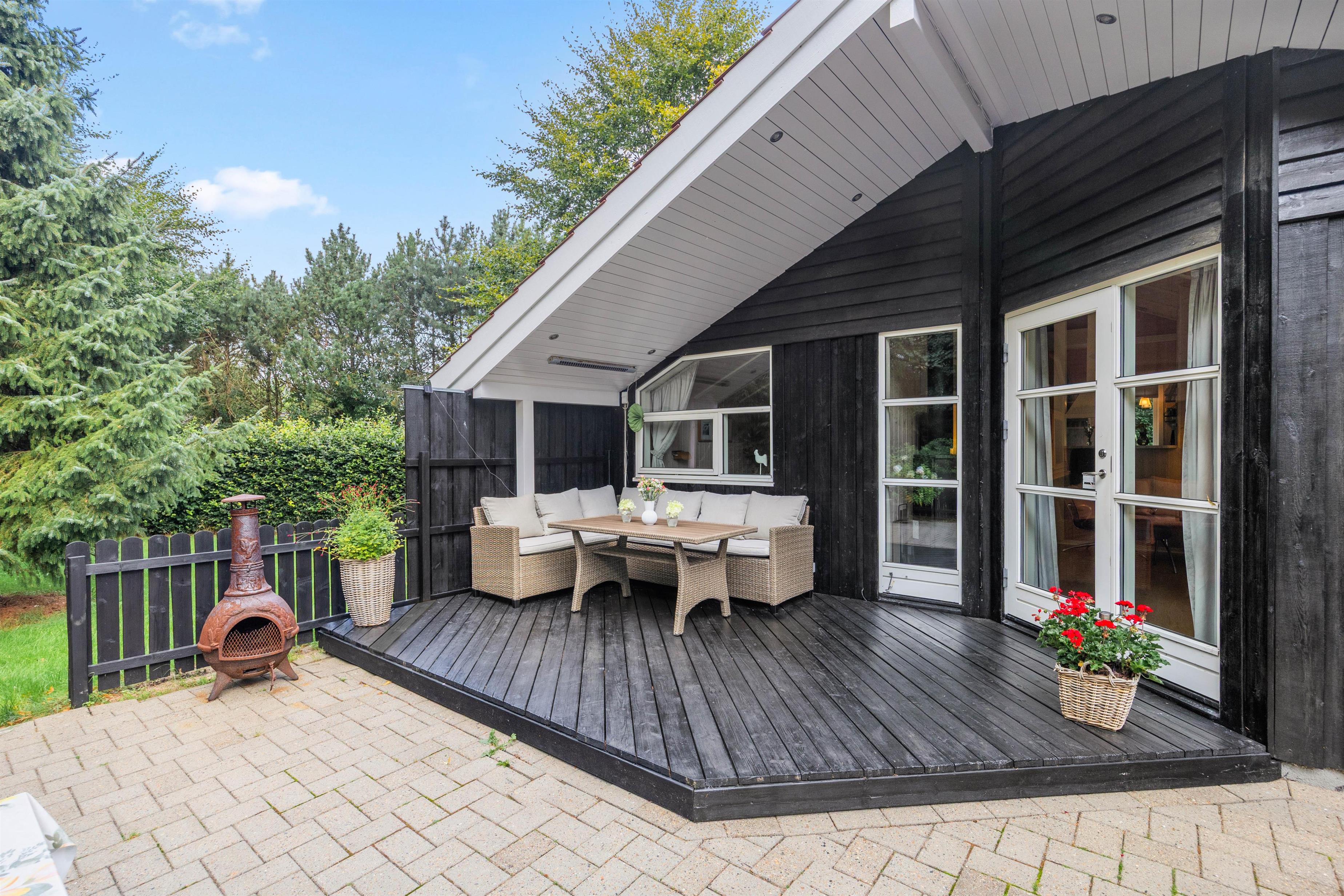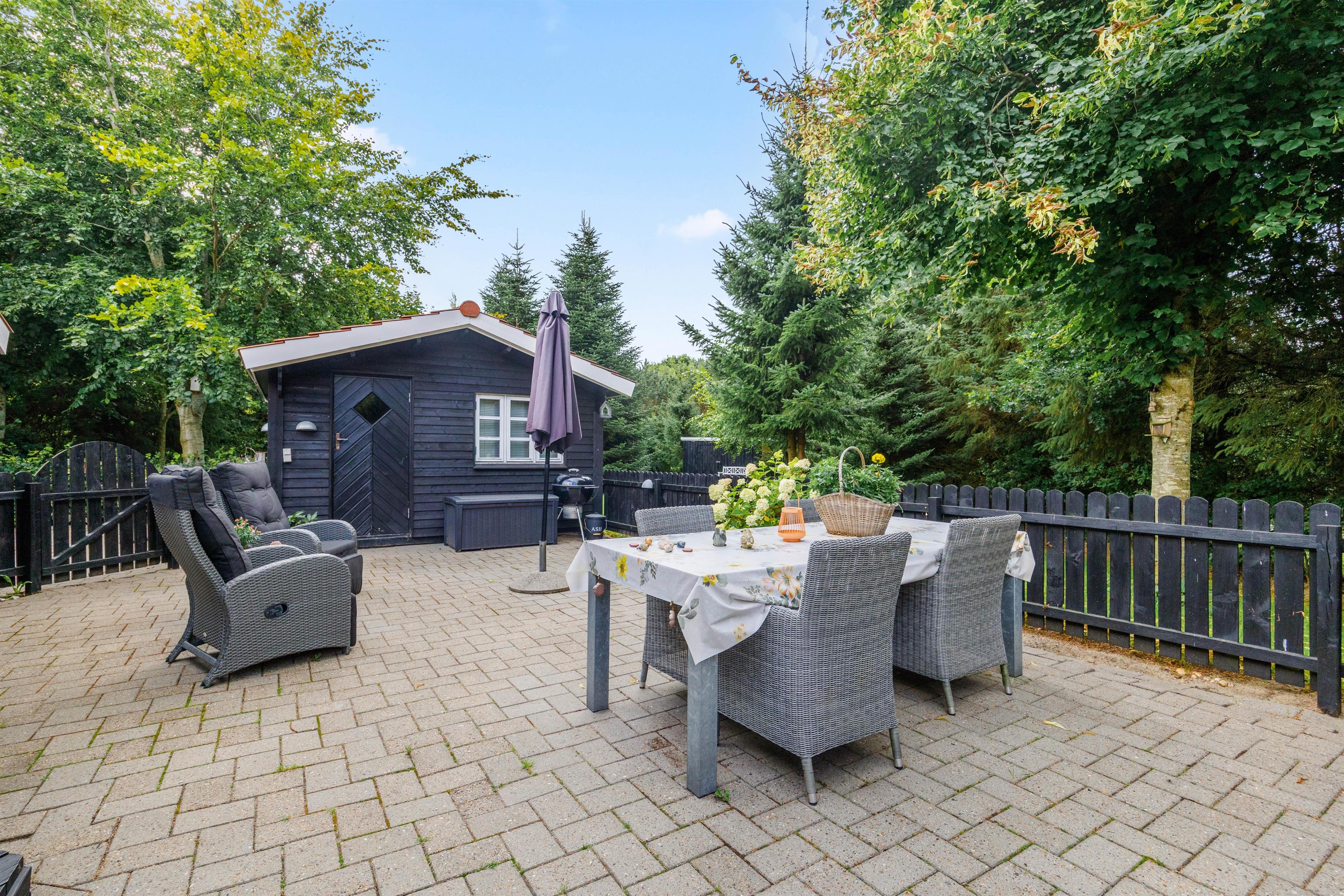 The holiday home at Blomstervangen 12 features a sheltered, enclosed and covered terrace, perfect for relaxing moments outdoors. Garden furniture and a barbecue are provided for al fresco dining. Children can enjoy the sandpit located on the natural lawn area, providing extra entertainment.
