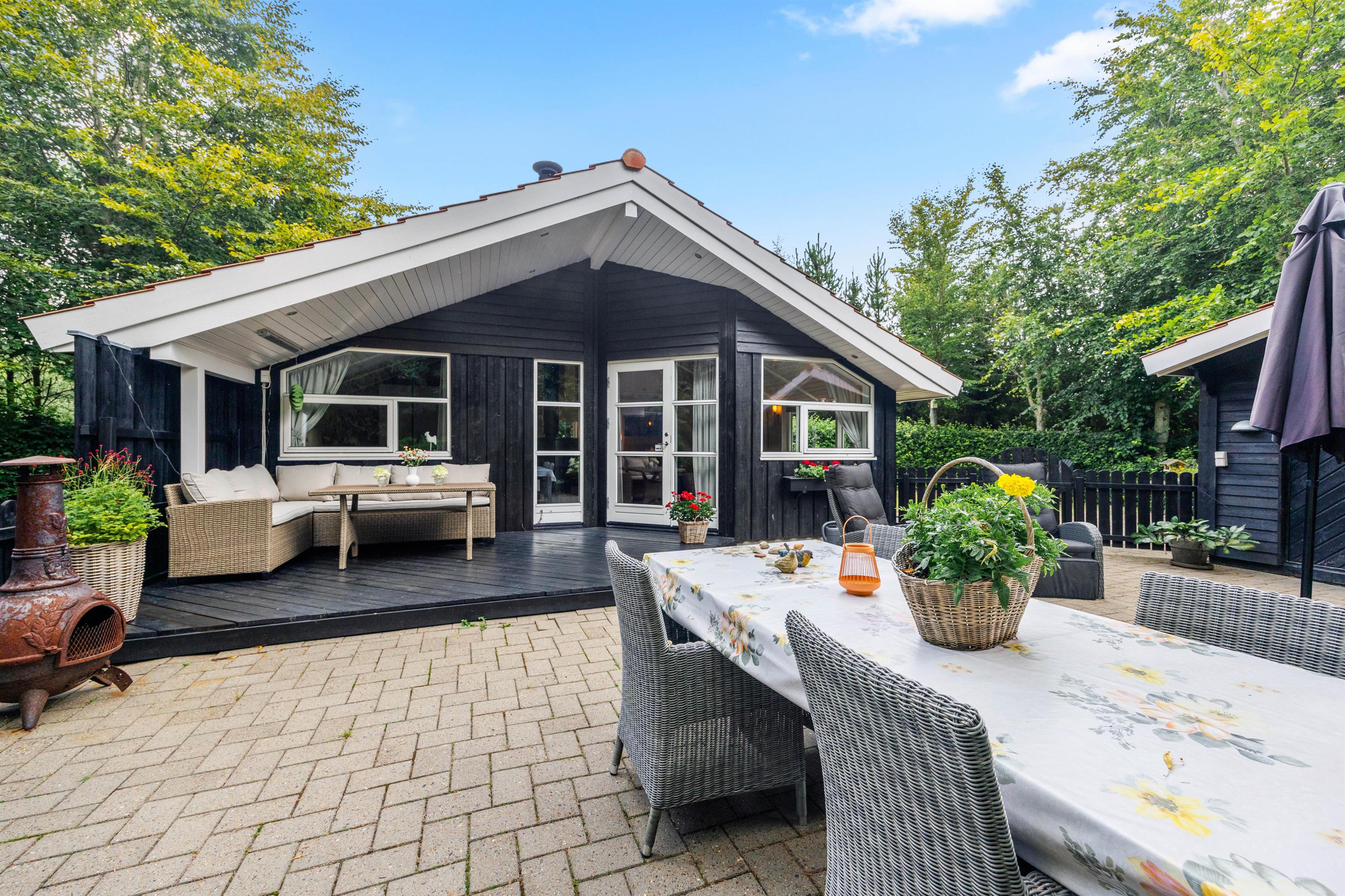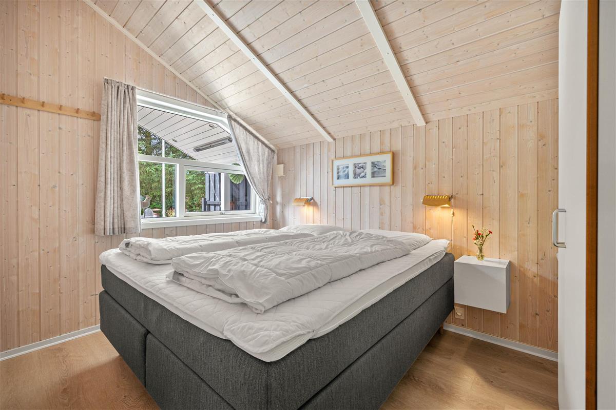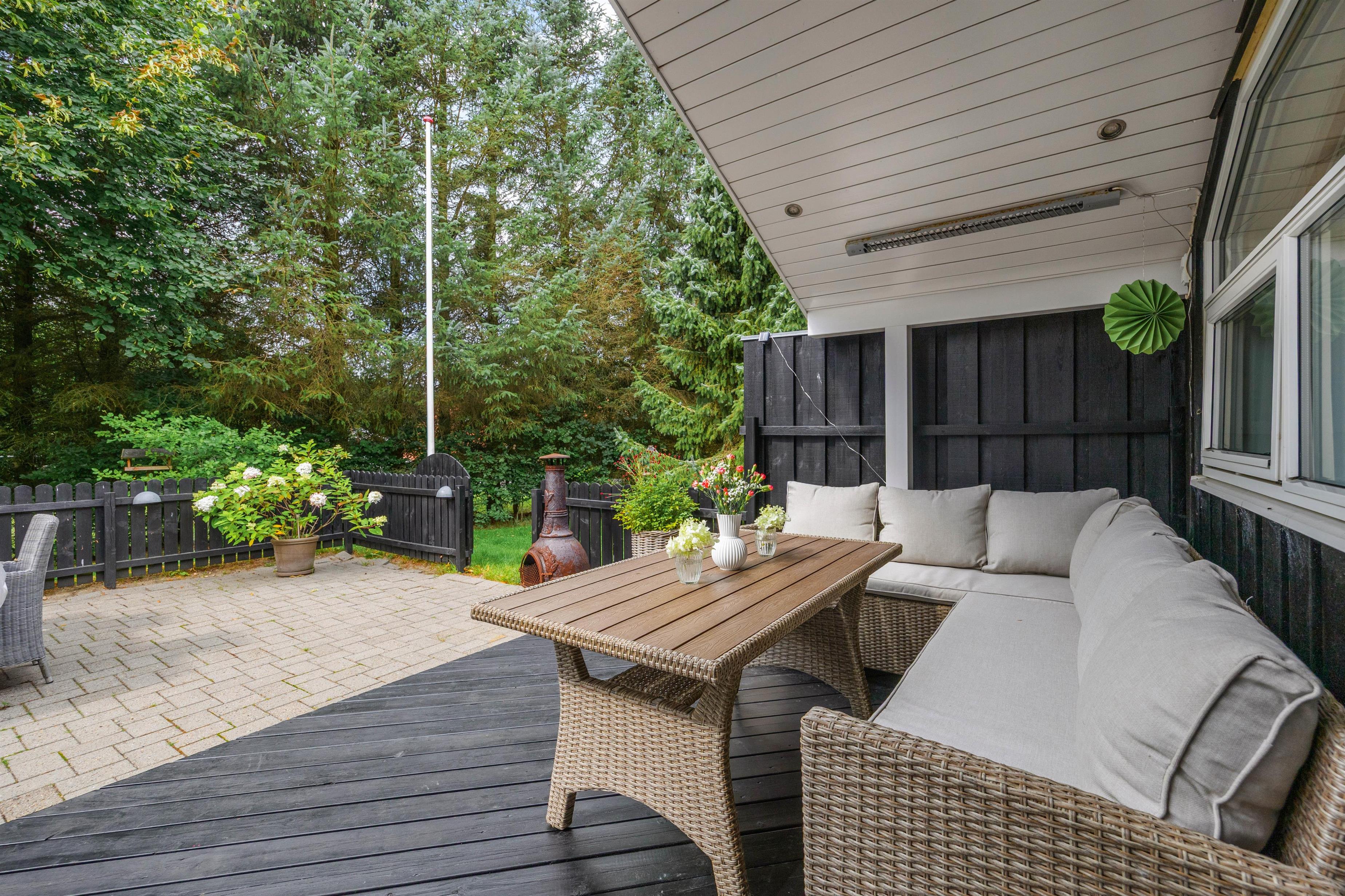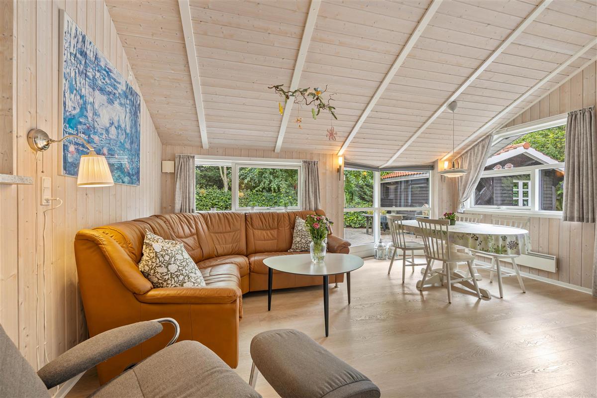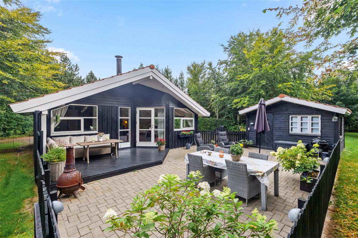 The holiday home at Blomstervangen 12 features a sheltered, enclosed and covered terrace, perfect for relaxing moments outdoors. Garden furniture and a barbecue are provided for al fresco dining. Children can enjoy the sandpit located on the natural lawn area, providing extra entertainment.