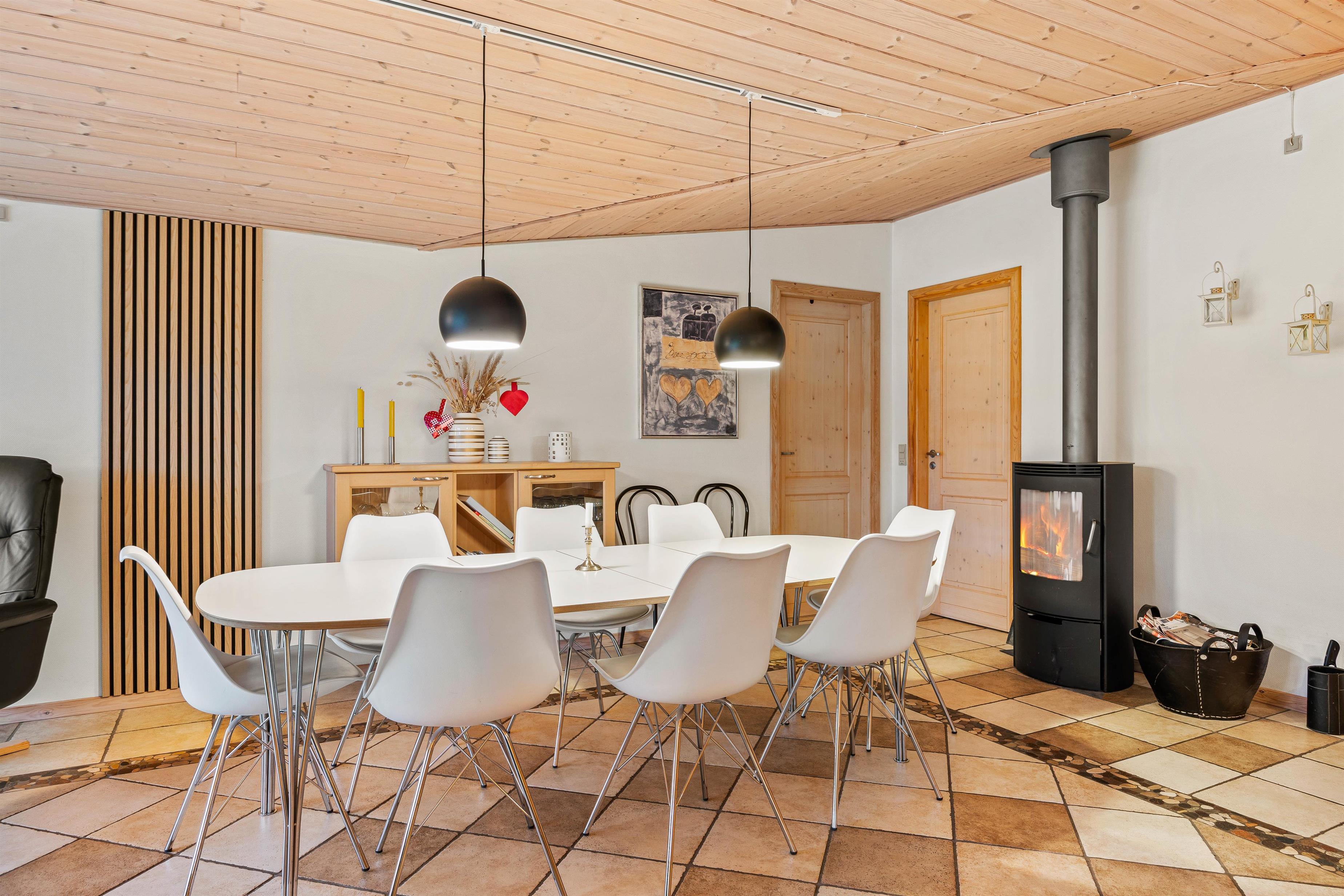 The living room is the perfect retreat after an eventful day, featuring a wood-burning stove for cosy evenings. The open-plan kitchen flows seamlessly into the dining area, perfect for sociable moments around the large dining table. Here you can prepare culinary creations with fresh ingredients from the nearby shop, while the dishwasher takes care of the cleaning up.