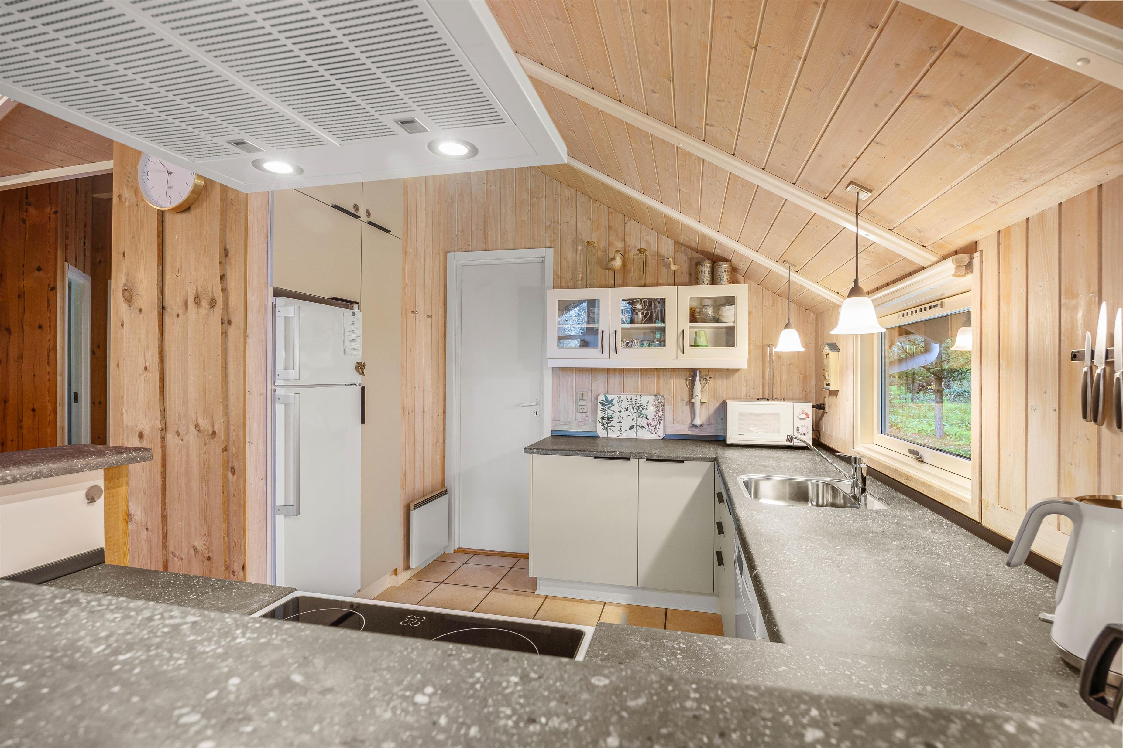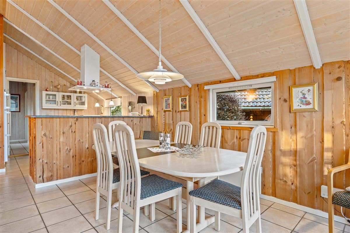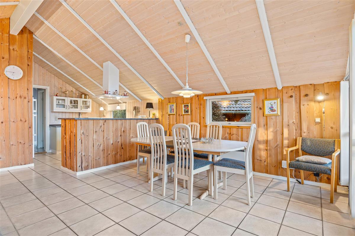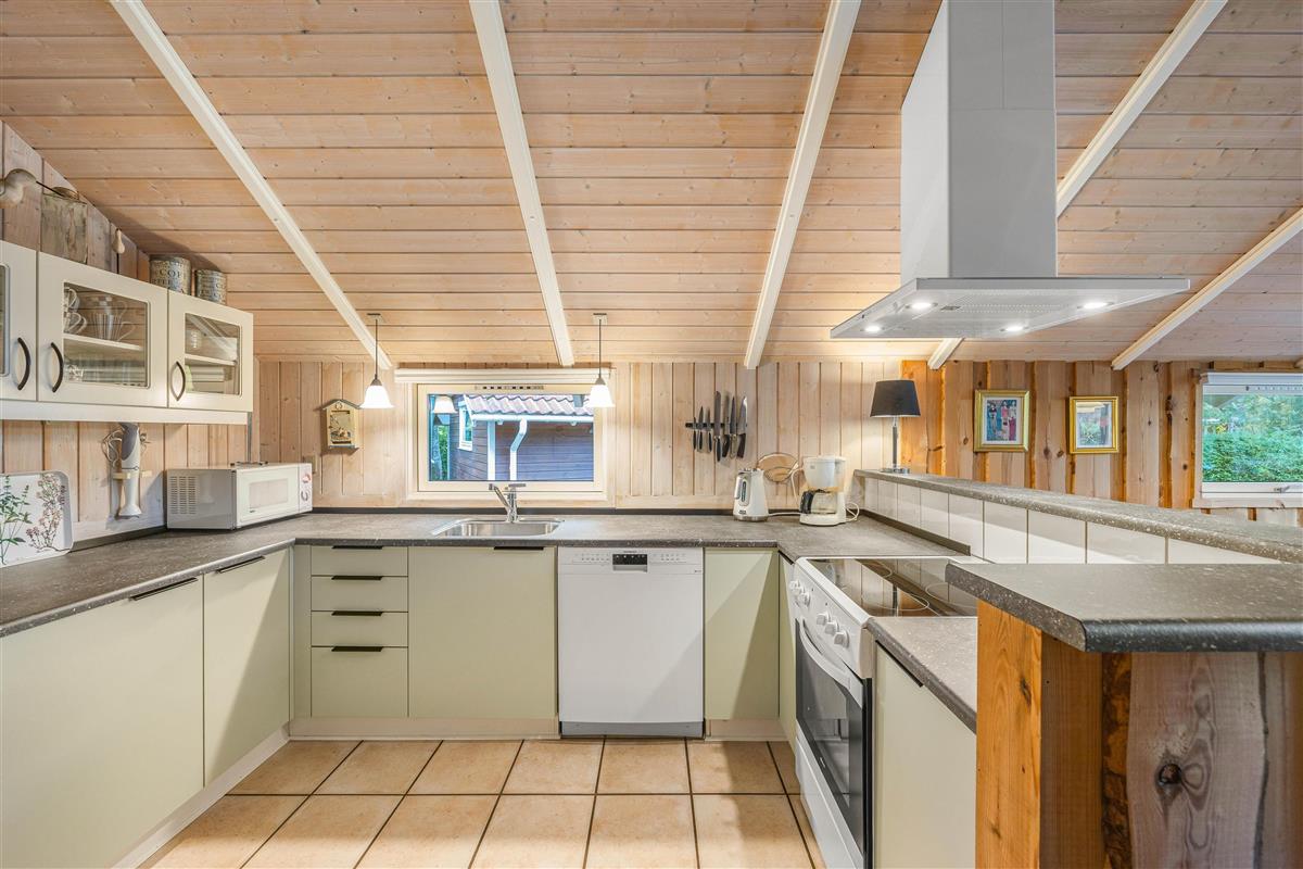 The holiday home at Blomstervangen 25 features an impressive open-plan design connecting the living room, kitchen and dining area. This layout allows you to move freely between spaces while maintaining connection and communication. The wood-burning stove in the living room provides comfortable warmth and a cosy atmosphere. Here you can play games together, watch exciting films or simply enjoy the peace and quiet. The dining area fits seamlessly into the space, offering ample room for shared meals. Whether it's a leisurely breakfast or light lunch, there's space for everyone. The adjoining kitchen is practically equipped with everything needed for preparing delicious meals, while the integrated dishwasher takes care of the cleaning up.