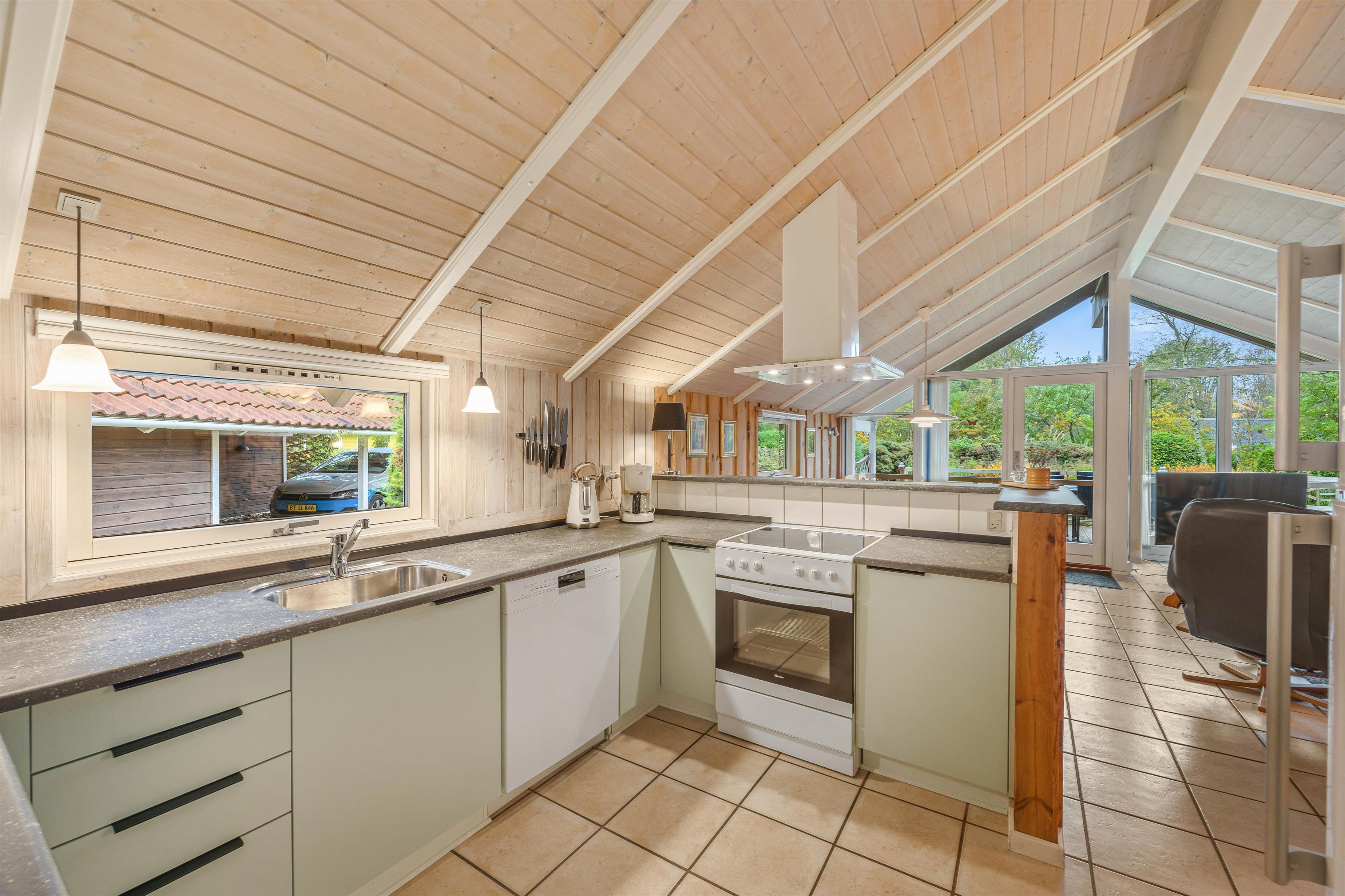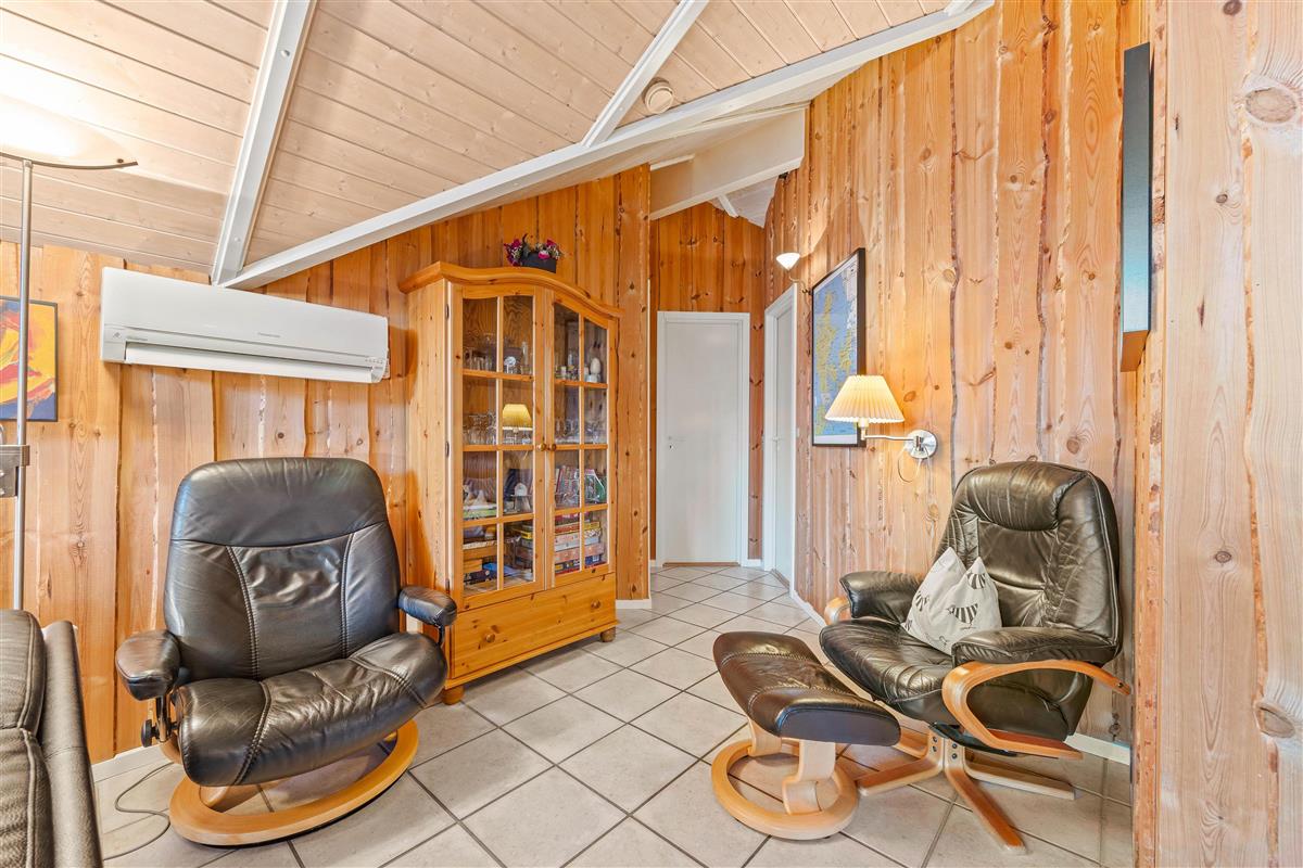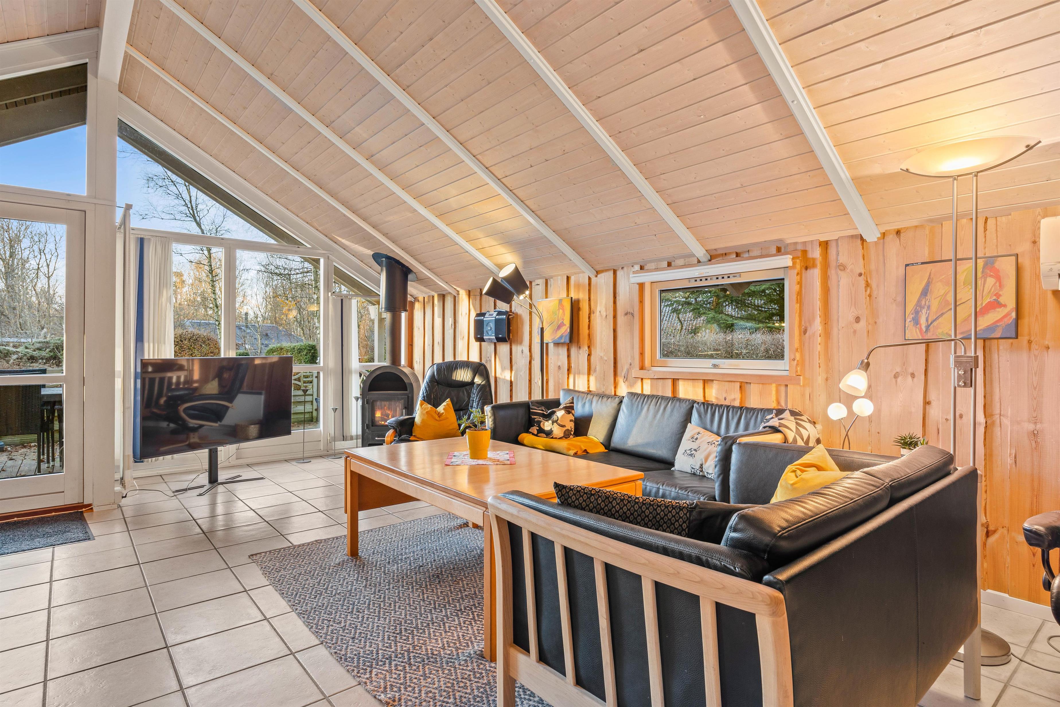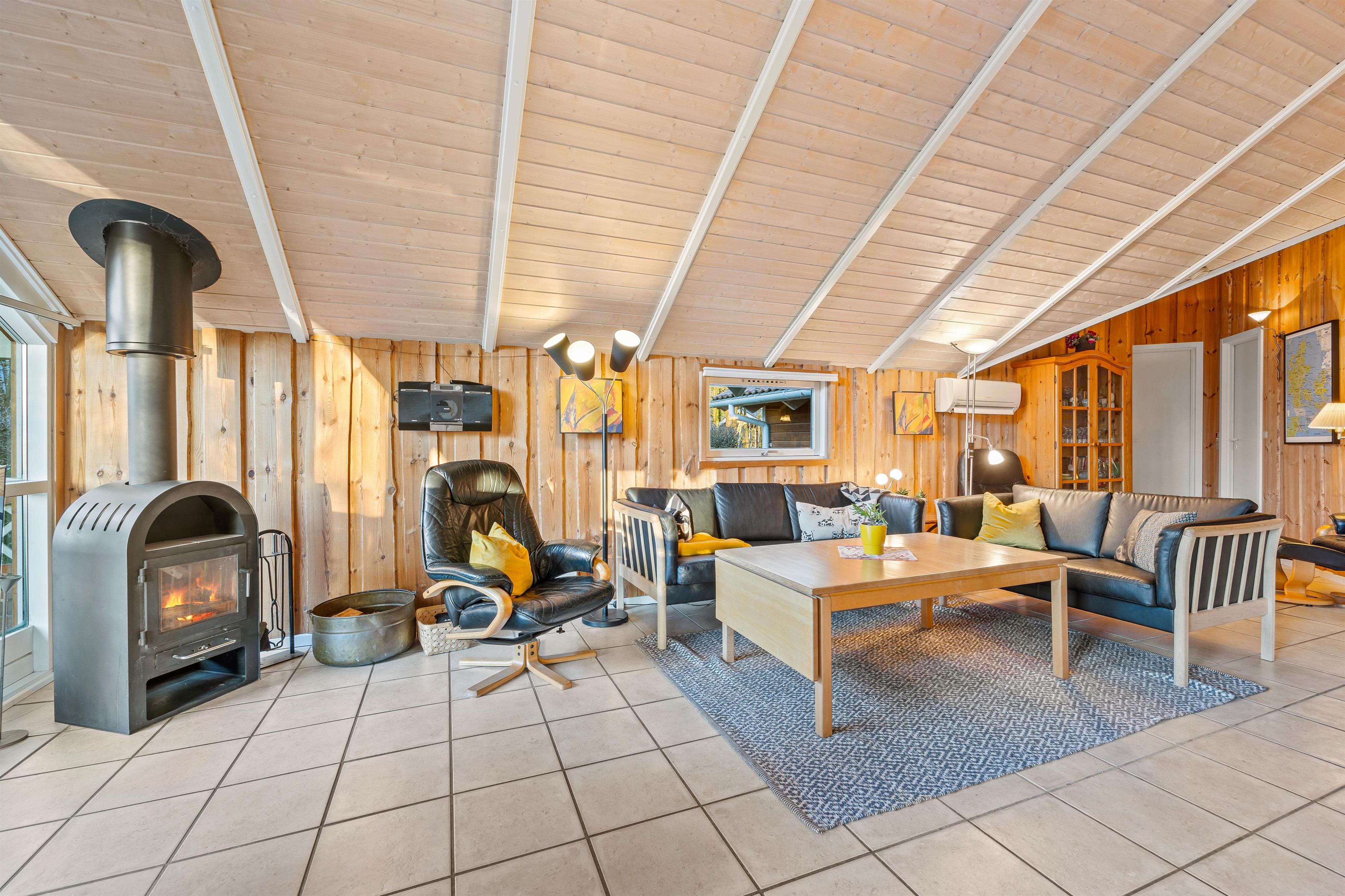 The holiday home at Blomstervangen 25 features an impressive open-plan design connecting the living room, kitchen and dining area. This layout allows you to move freely between spaces while maintaining connection and communication. The wood-burning stove in the living room provides comfortable warmth and a cosy atmosphere. Here you can play games together, watch exciting films or simply enjoy the peace and quiet. The dining area fits seamlessly into the space, offering ample room for shared meals. Whether it's a leisurely breakfast or light lunch, there's space for everyone. The adjoining kitchen is practically equipped with everything needed for preparing delicious meals, while the integrated dishwasher takes care of the cleaning up.