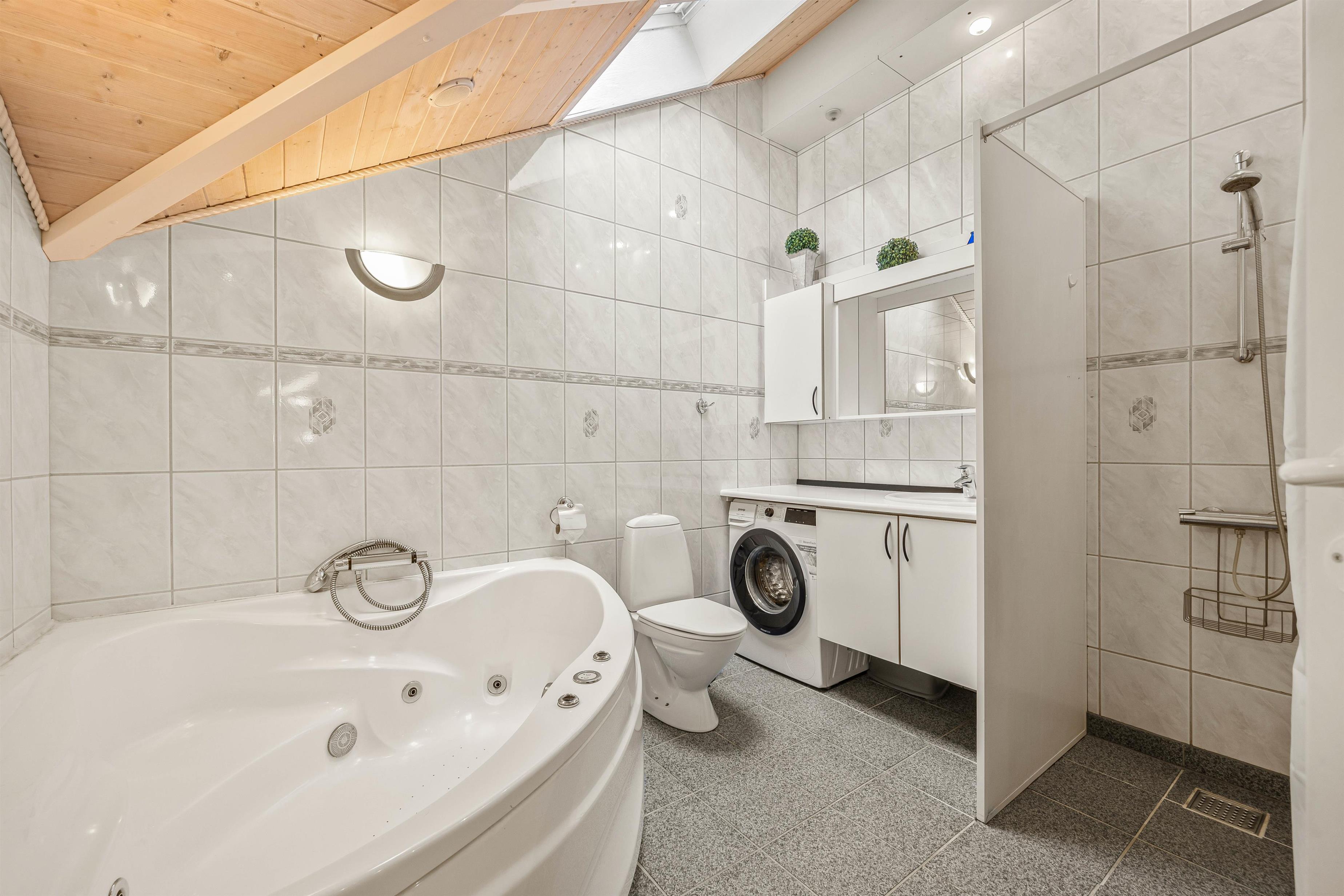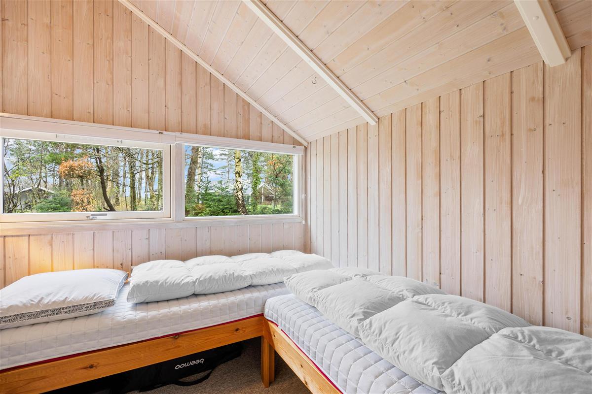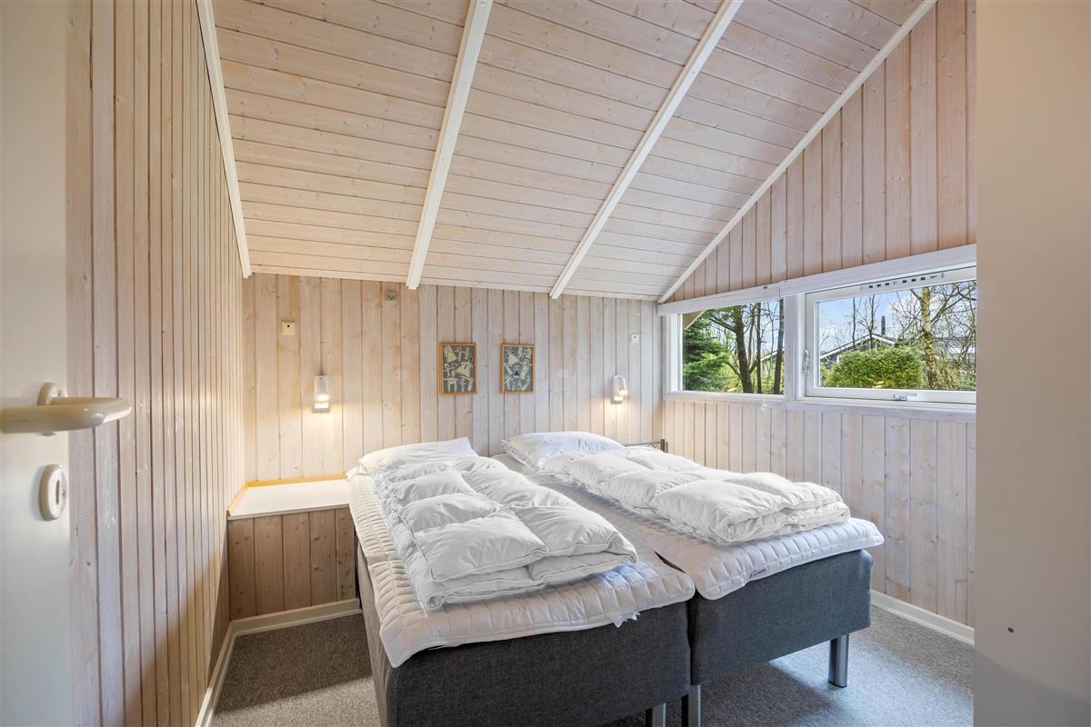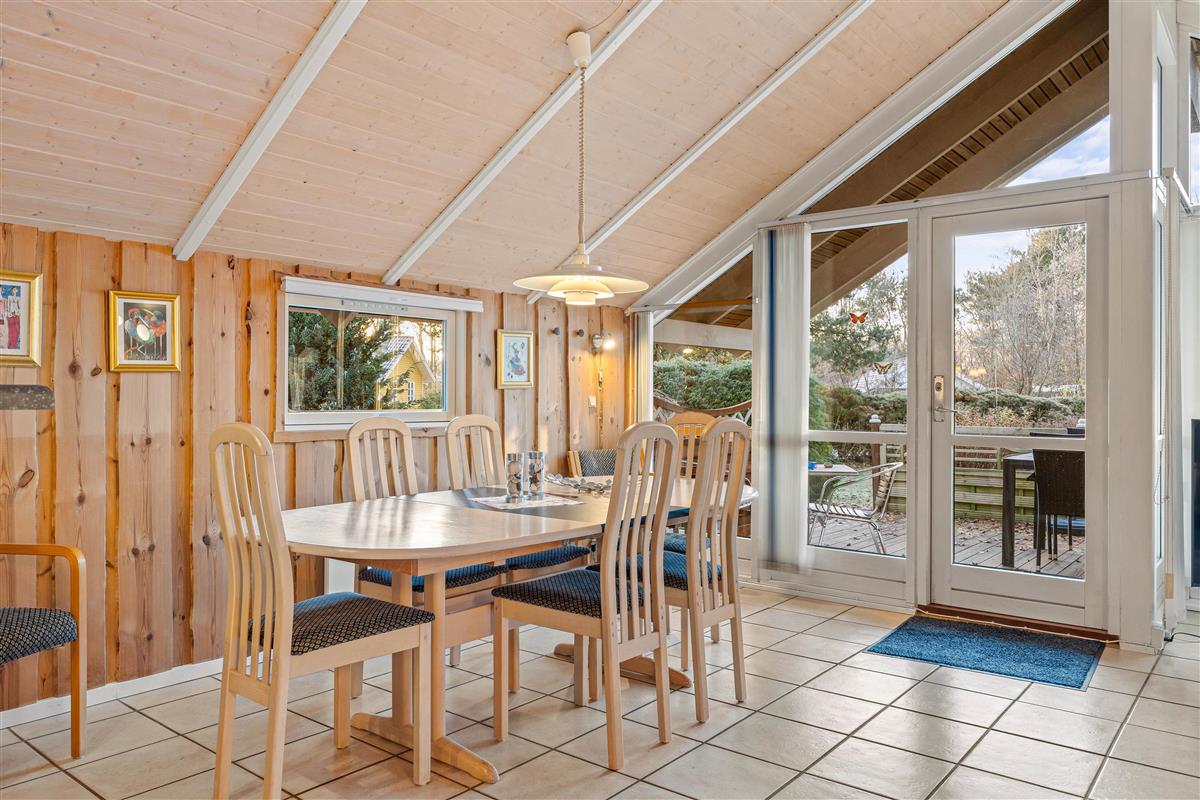 The holiday home at Blomstervangen 25 features an impressive open-plan design connecting the living room, kitchen and dining area. This layout allows you to move freely between spaces while maintaining connection and communication. The wood-burning stove in the living room provides comfortable warmth and a cosy atmosphere. Here you can play games together, watch exciting films or simply enjoy the peace and quiet. The dining area fits seamlessly into the space, offering ample room for shared meals. Whether it's a leisurely breakfast or light lunch, there's space for everyone. The adjoining kitchen is practically equipped with everything needed for preparing delicious meals, while the integrated dishwasher takes care of the cleaning up.