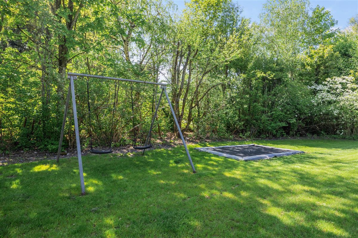 For younger family members, the outdoor area includes a swing and trampoline, guaranteeing hours of entertainment and physical activity. Children can play freely while adults relax on the garden furniture.