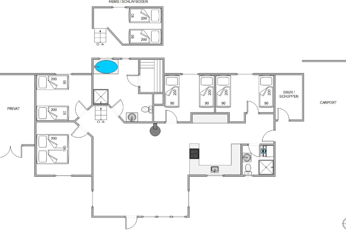 A total of 4 bedrooms ensure that everyone has their own retreat. 1 double bed in the master bedroom, plus 3 additional bedrooms each with 2 single beds – ideal for families or groups. In the loft, there are 2 more sleeping spaces for your children.