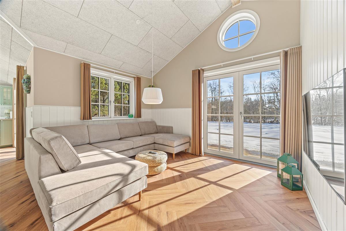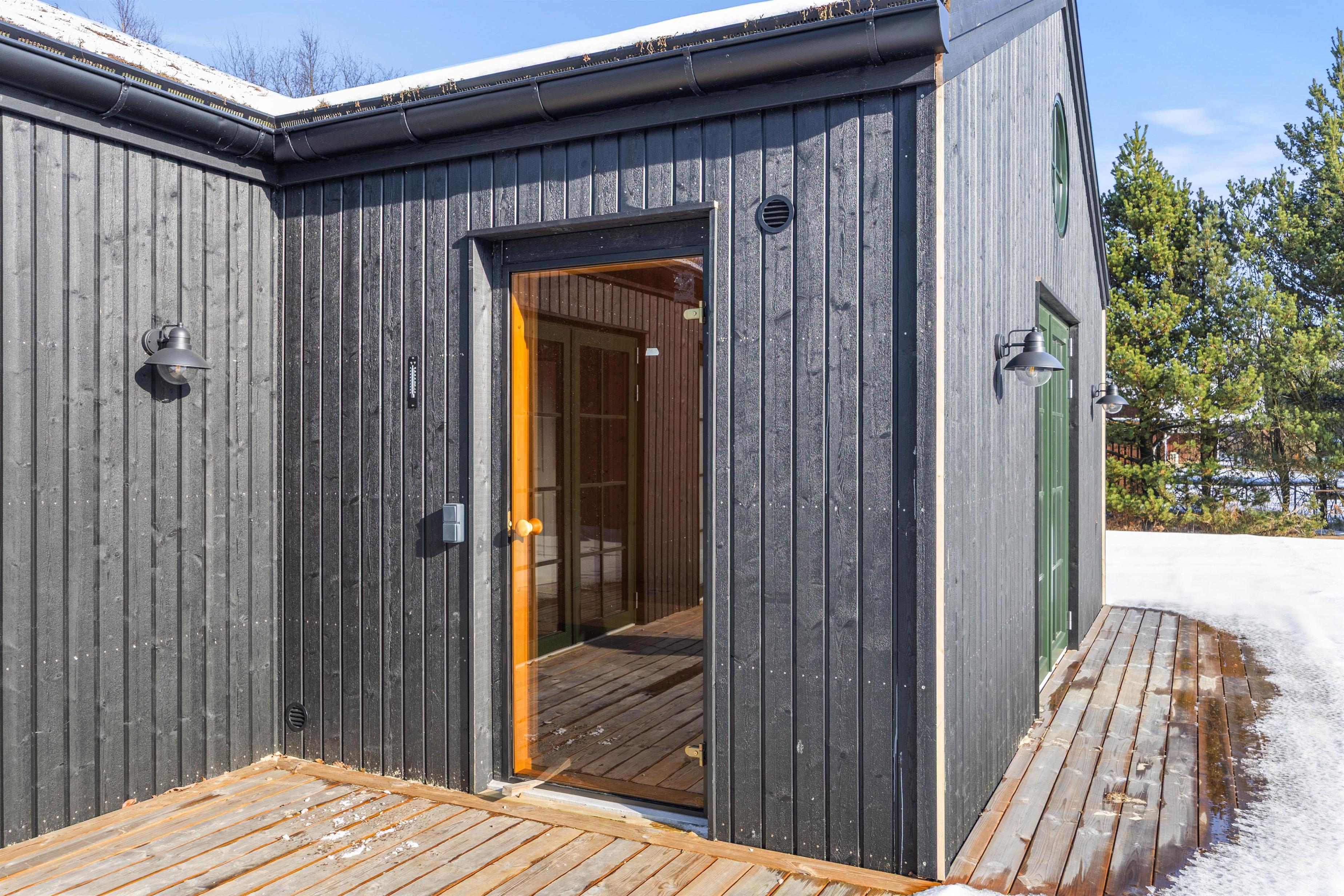 The outdoor areas of the summer house invite pure enjoyment under the open sky. On the 1,542 m² lawn, there is plenty of space for play and relaxation, while children can enjoy the sandbox or swing, and adults can unwind on the terrace. The terrace includes both open and sheltered areas, making it possible to enjoy the outdoors regardless of weather – and with the house’s gas grill, it’s perfect for enjoying meals together outside.