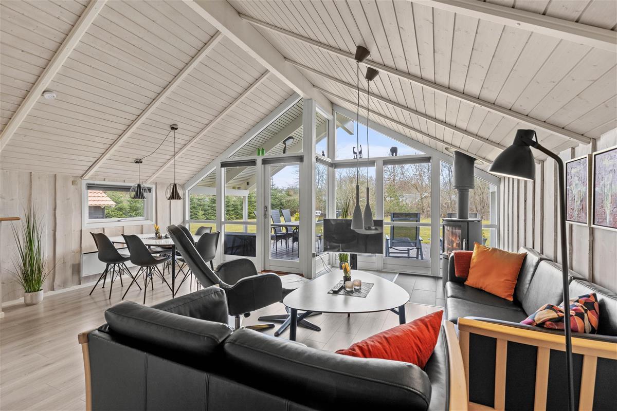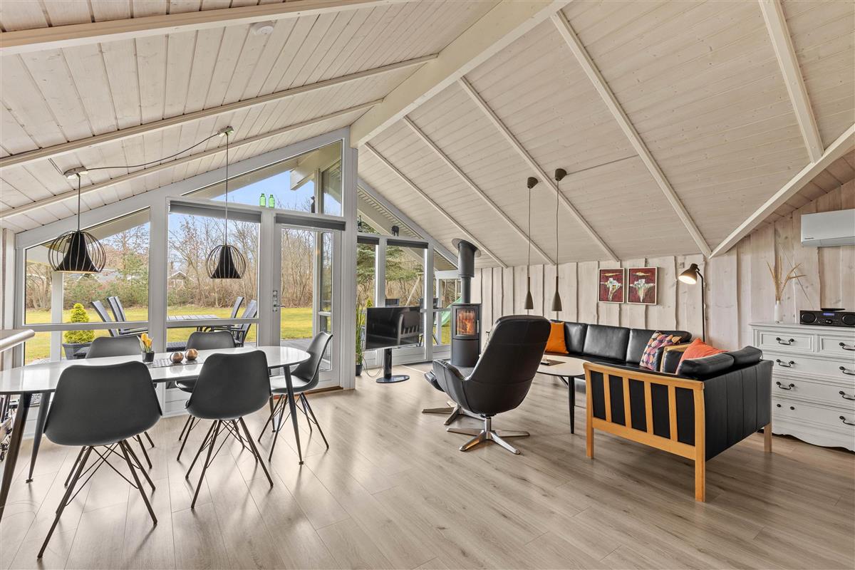 The living room forms the heart of the holiday home, featuring a wood-burning stove that creates a warm and welcoming atmosphere. Here you can spend relaxing time together, enjoying the cosy warmth of the fire while reading a book or watching films. The modern kitchen is equipped with everything needed for preparing delicious meals, and a dishwasher effortlessly handles the cleaning up afterwards. The dining area is harmoniously integrated into the open-plan living space, making cooking and dining together a special experience.