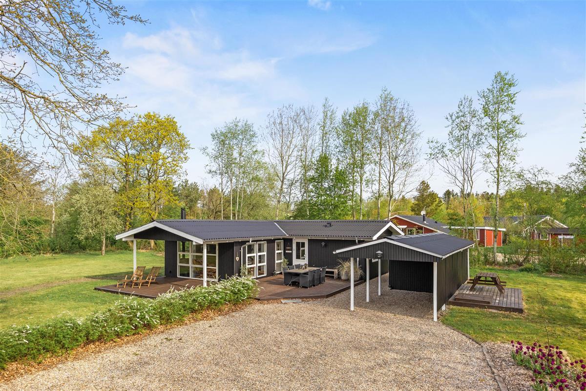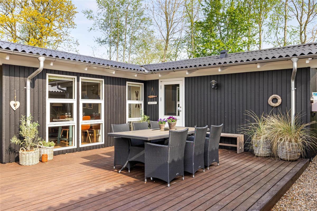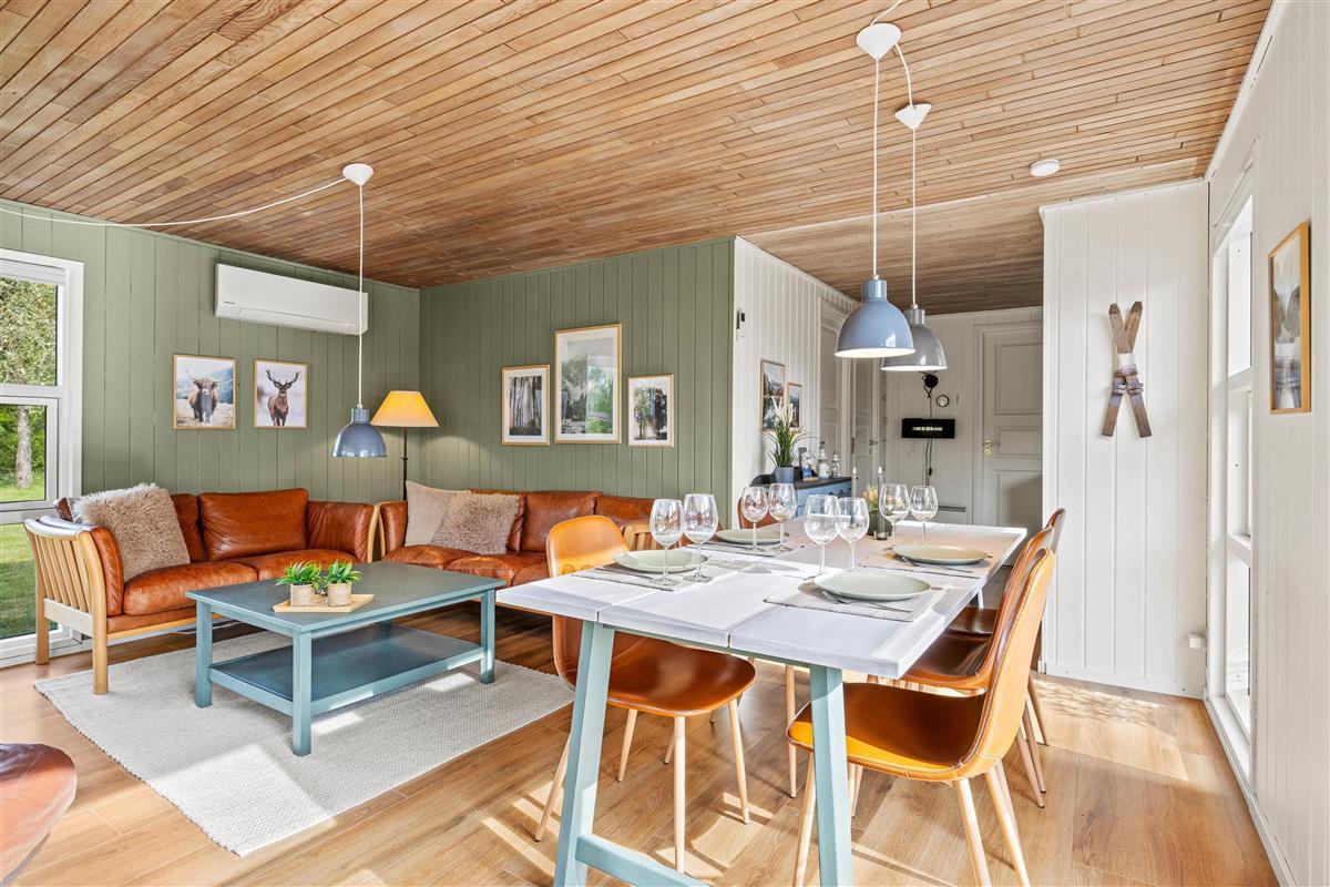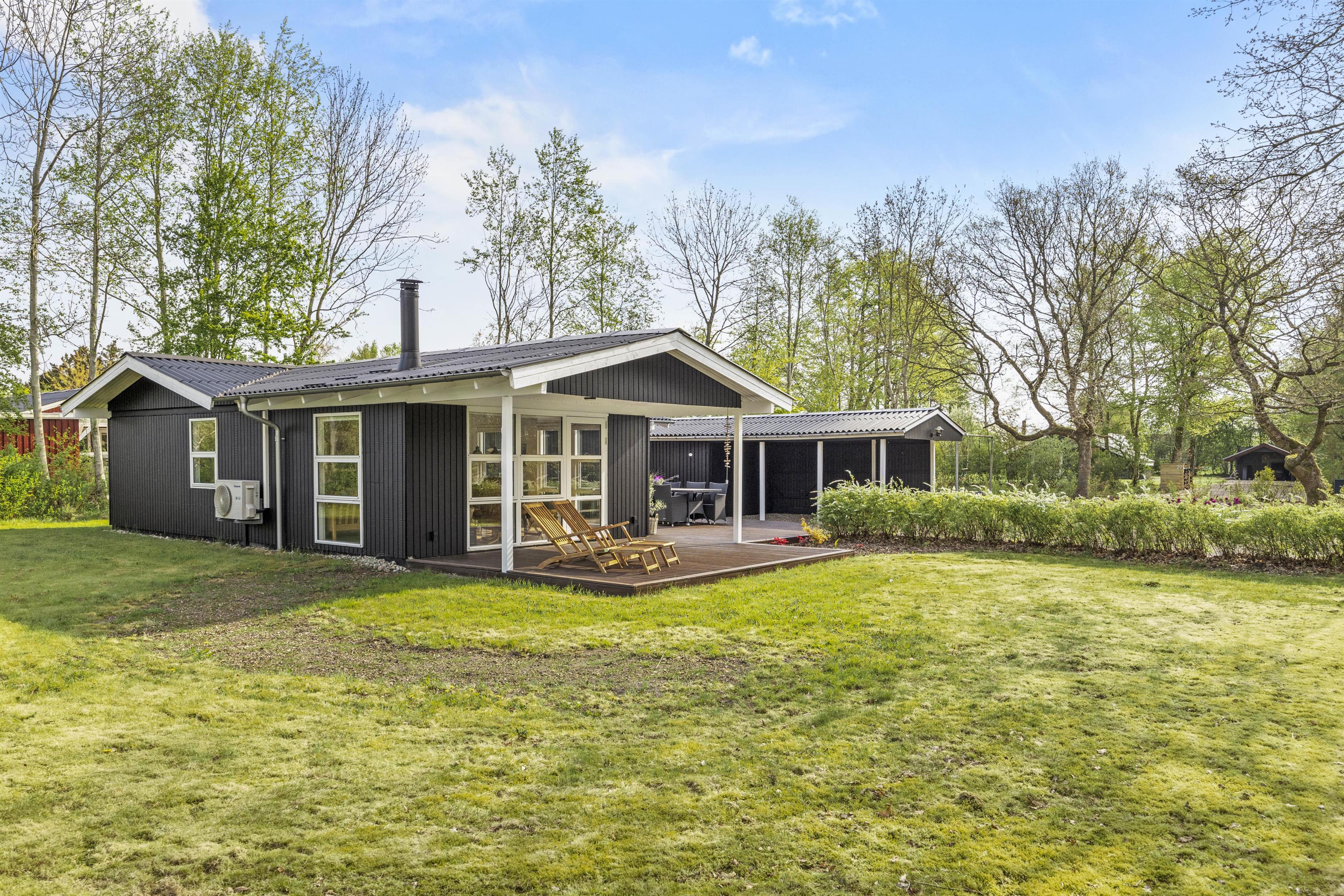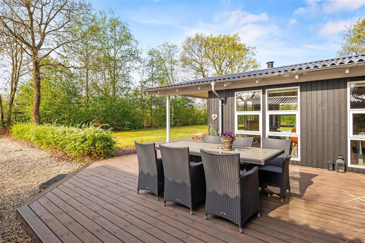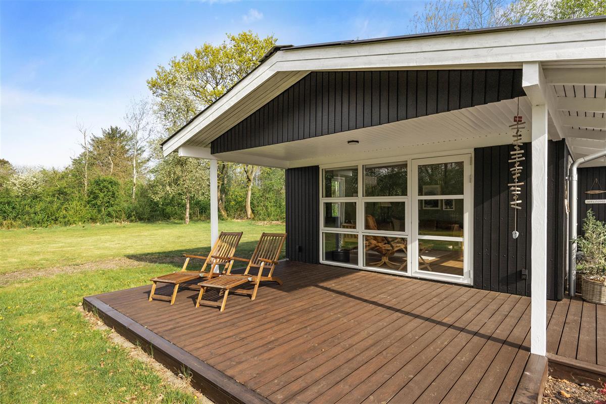 This cosy wooden holiday home at Rønnebærvangen 32 sits on a large lawn surrounded by bushes and trees. These provide natural wind protection and privacy, allowing you to sunbathe peacefully on the terrace or enjoy your coffee in the comfortable garden furniture.