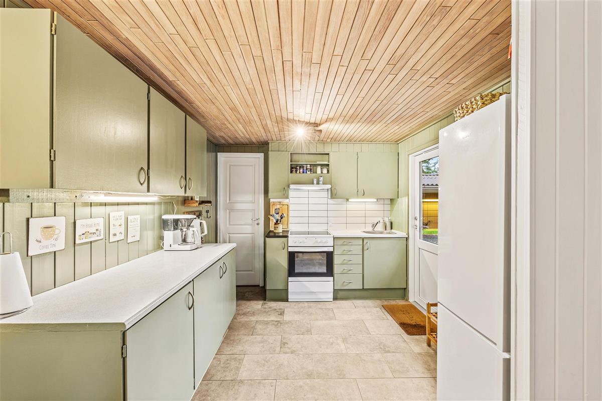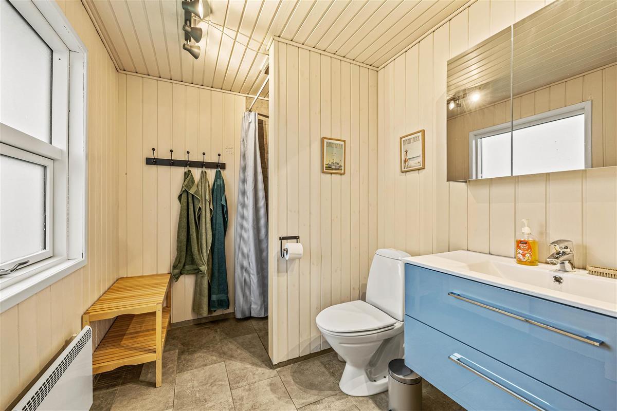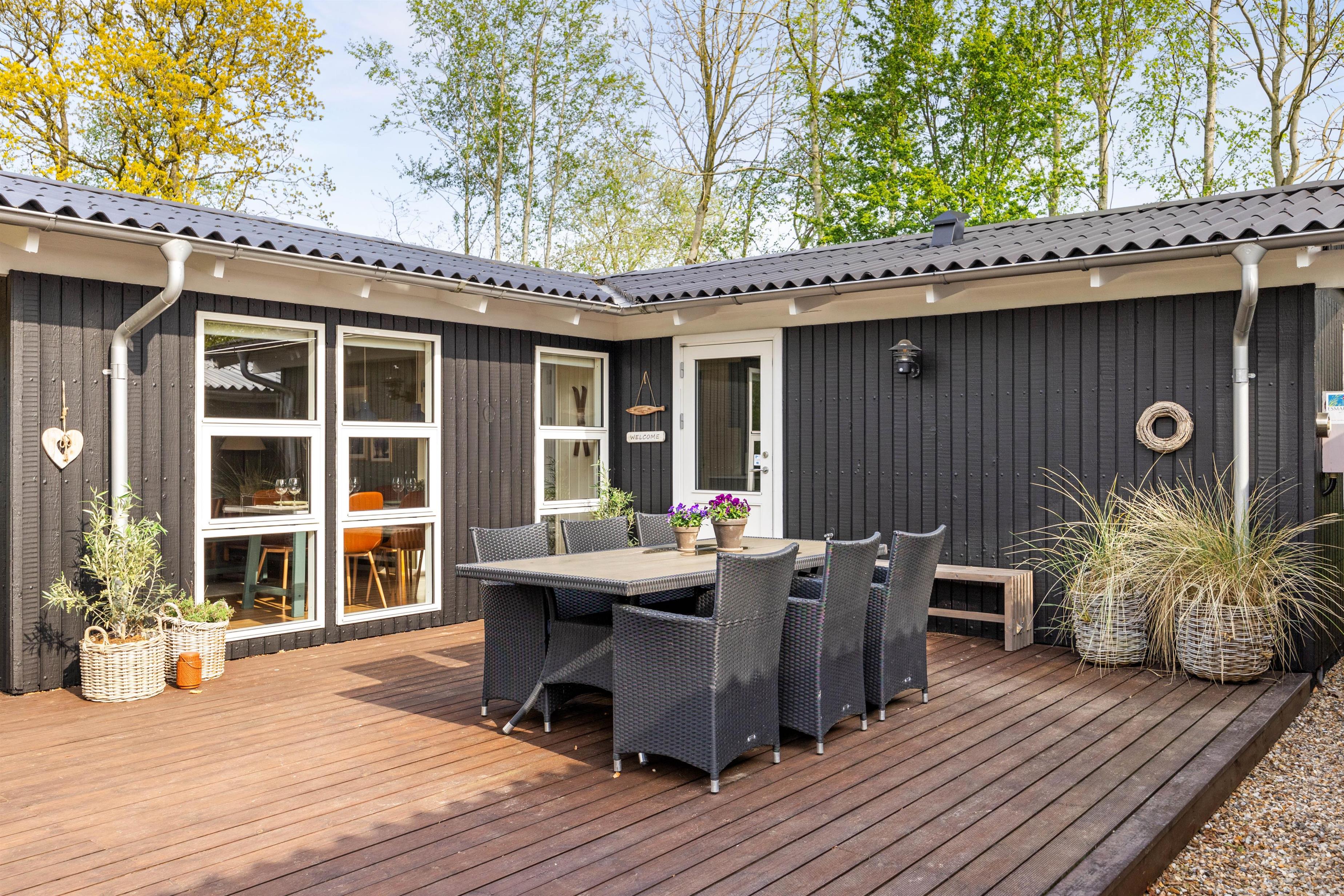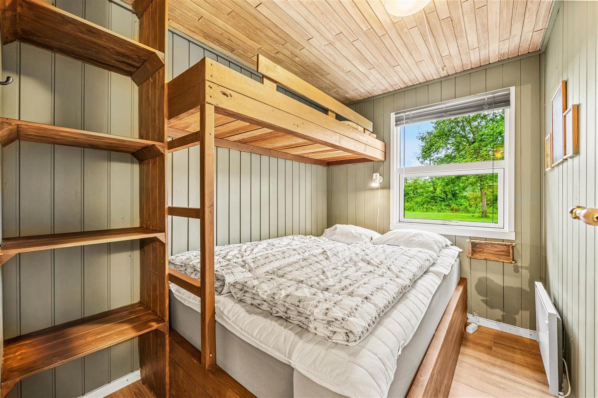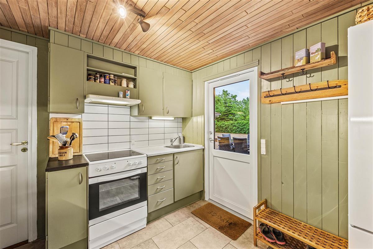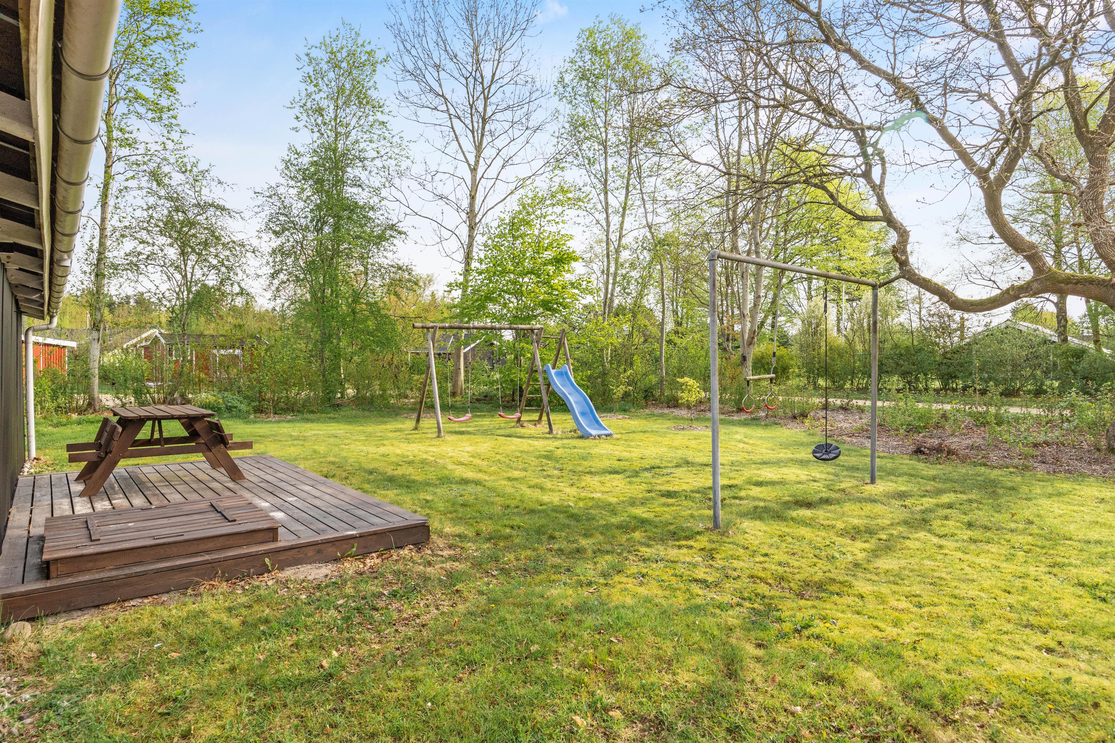 This cosy wooden holiday home at Rønnebærvangen 32 sits on a large lawn surrounded by bushes and trees. These provide natural wind protection and privacy, allowing you to sunbathe peacefully on the terrace or enjoy your coffee in the comfortable garden furniture.