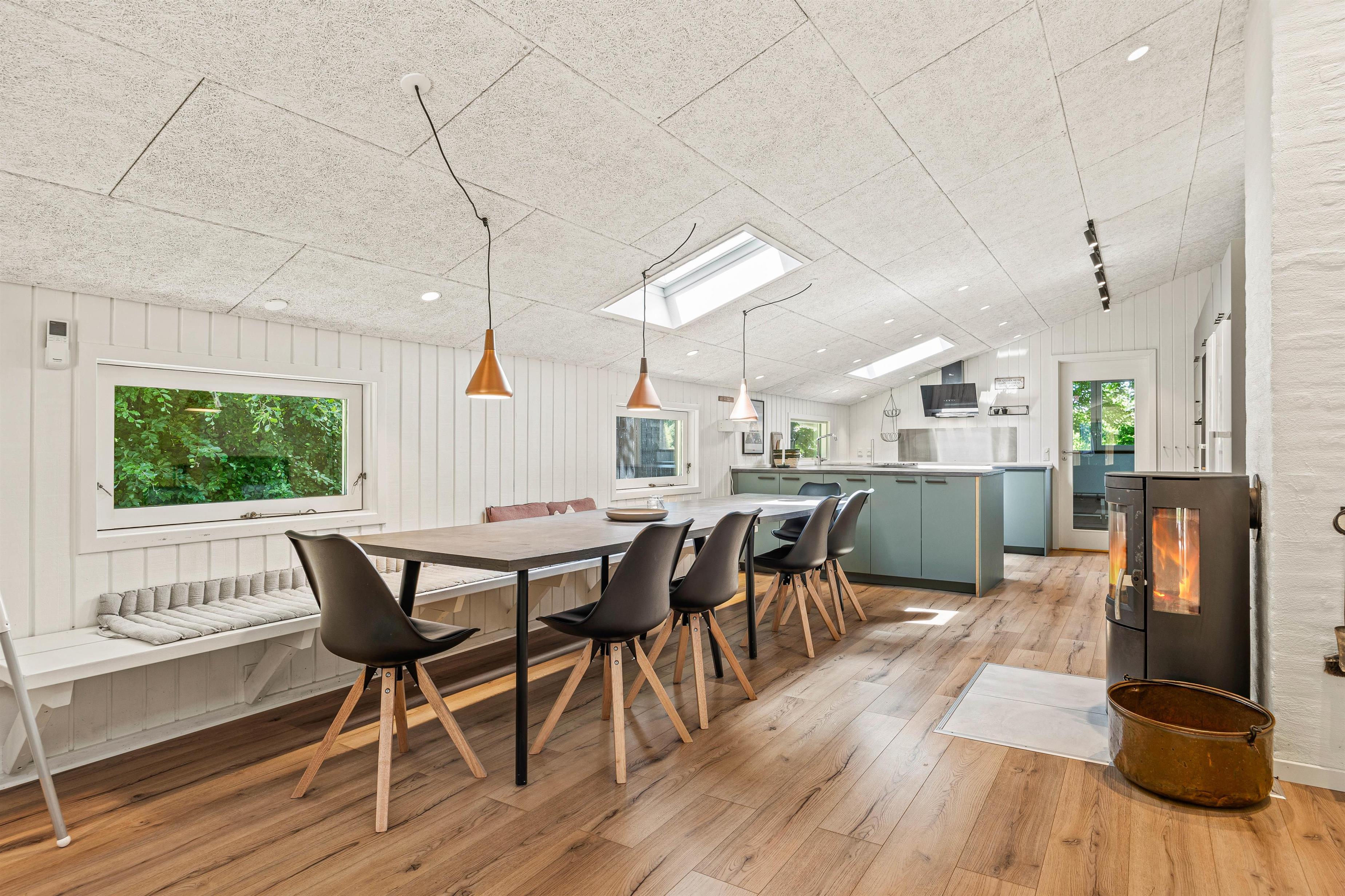 The heart of the living area features a cosy wood-burning stove, providing comfortable warmth on cooler days and creating an inviting atmosphere. Relax on the sofas and enjoy peaceful evenings with family or friends. The open-plan living, dining and kitchen area flows harmoniously, creating a welcoming atmosphere. A dishwasher ensures you can spend more time together rather than dealing with washing up.