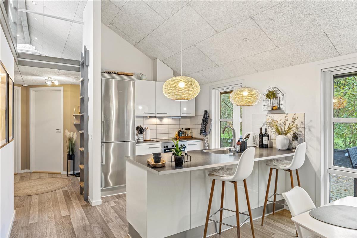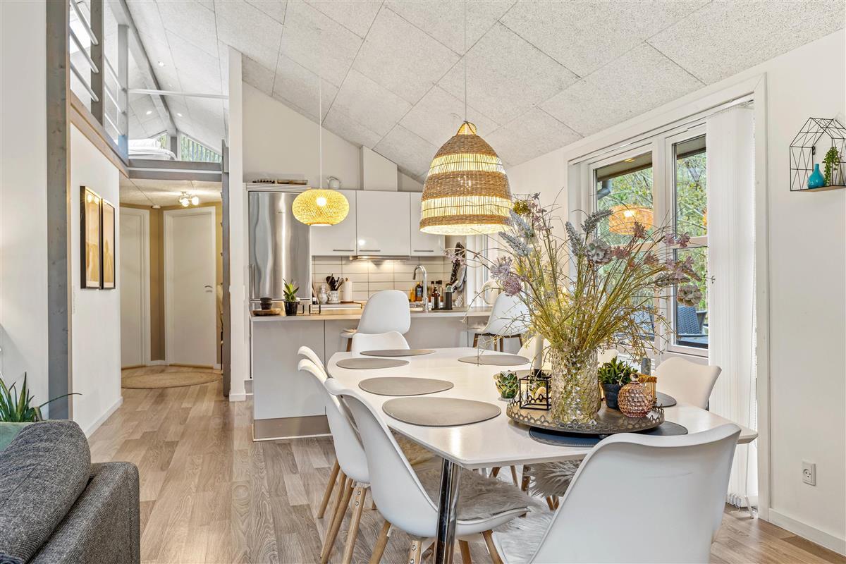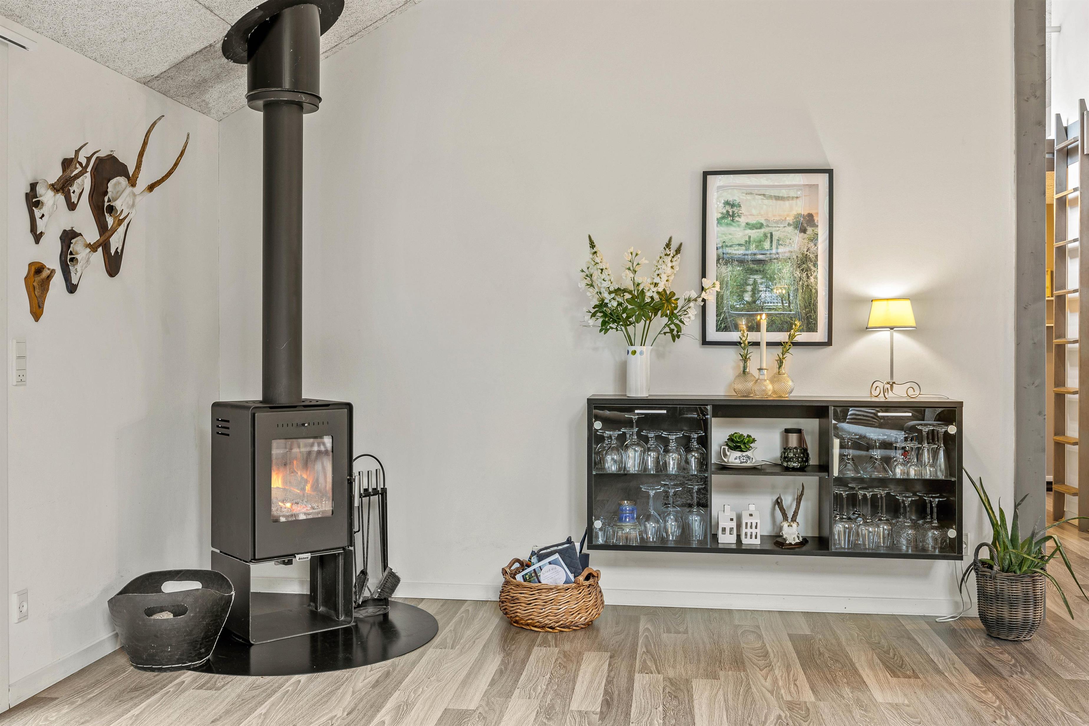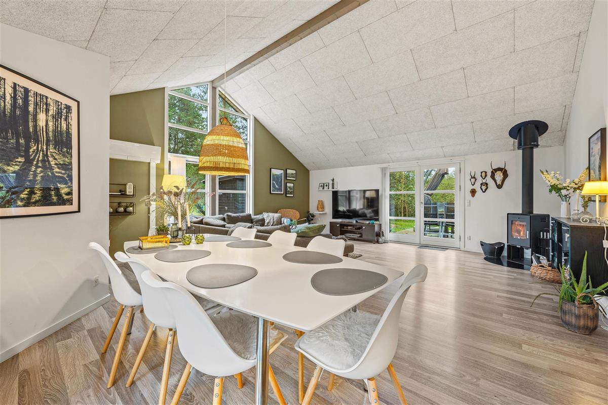 The living room at Blomstervangen 115 serves as the central gathering point for cosy evenings with family or friends. Featuring an inviting wood-burning stove, it creates a warm atmosphere during cooler months. The room is bright and welcoming, thanks to large windows that let in plenty of natural light. From here, you have access to the terrace areas, seamlessly connecting the indoor space with nature. A notable feature is the open-plan kitchen, which flows naturally into the living area. This layout allows you to remain part of the conversation while cooking and spending time together. The dishwasher ensures quick and effortless clean-up after meals.