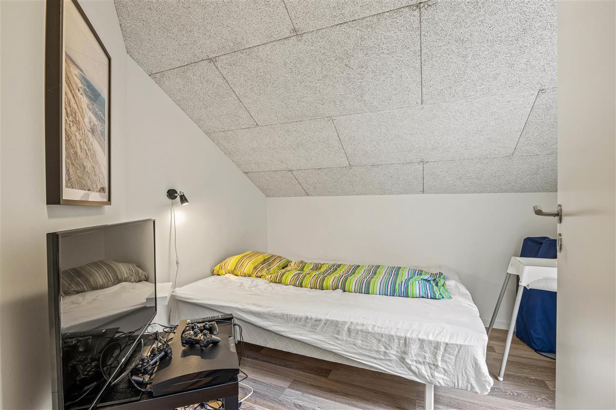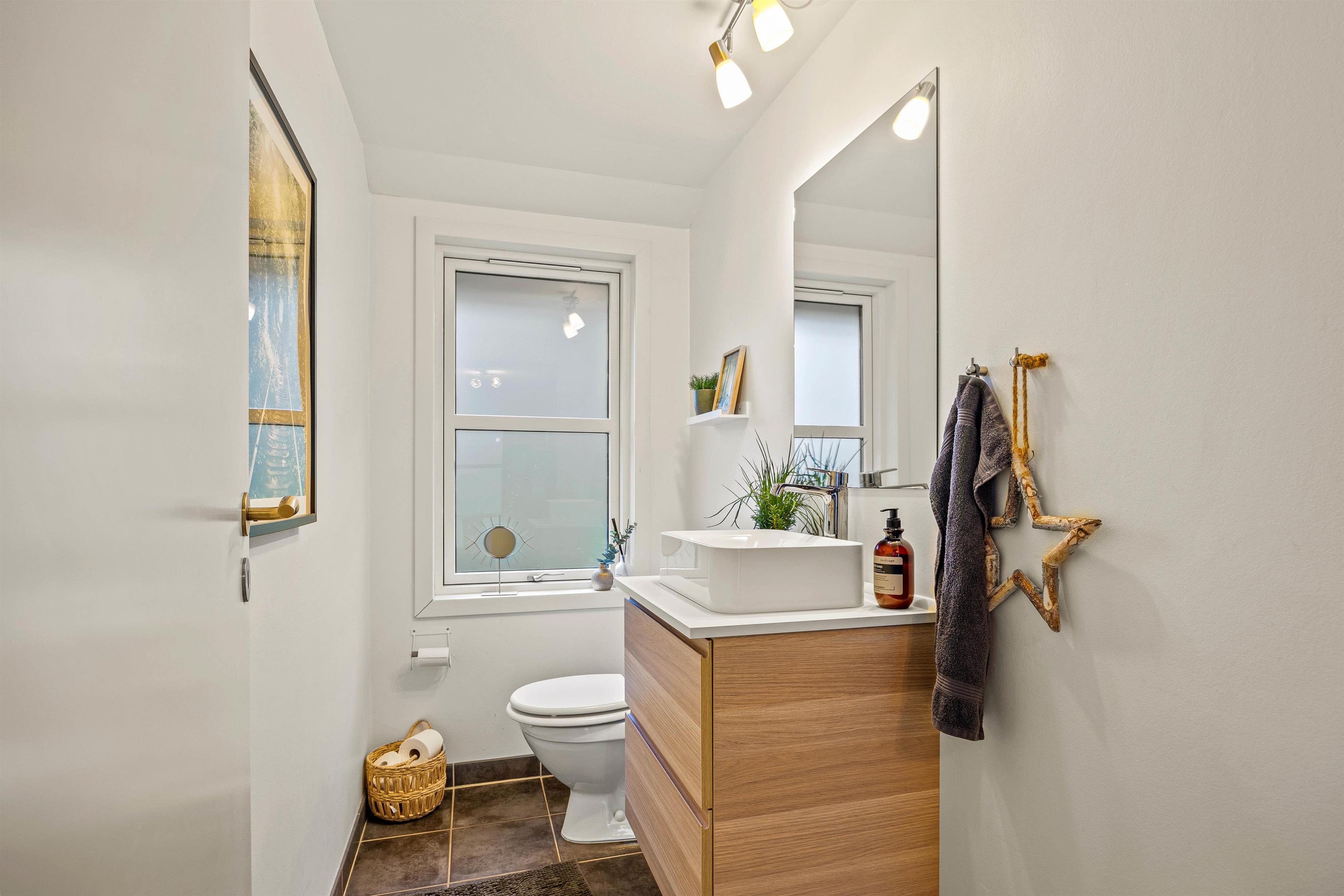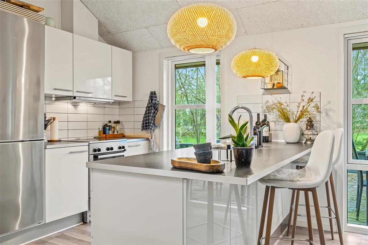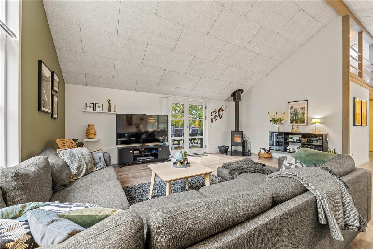 The living room at Blomstervangen 115 serves as the central gathering point for cosy evenings with family or friends. Featuring an inviting wood-burning stove, it creates a warm atmosphere during cooler months. The room is bright and welcoming, thanks to large windows that let in plenty of natural light. From here, you have access to the terrace areas, seamlessly connecting the indoor space with nature. A notable feature is the open-plan kitchen, which flows naturally into the living area. This layout allows you to remain part of the conversation while cooking and spending time together. The dishwasher ensures quick and effortless clean-up after meals.