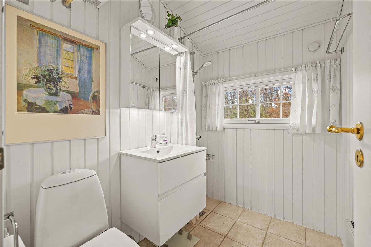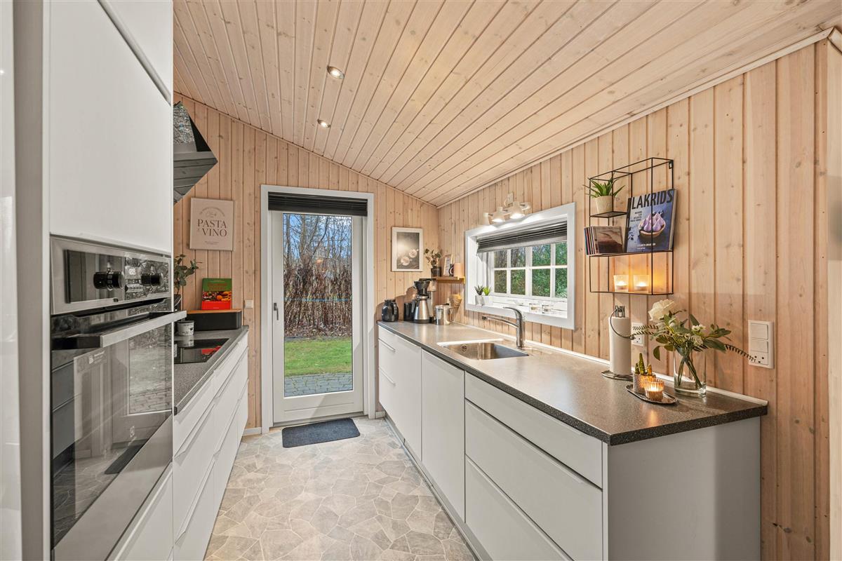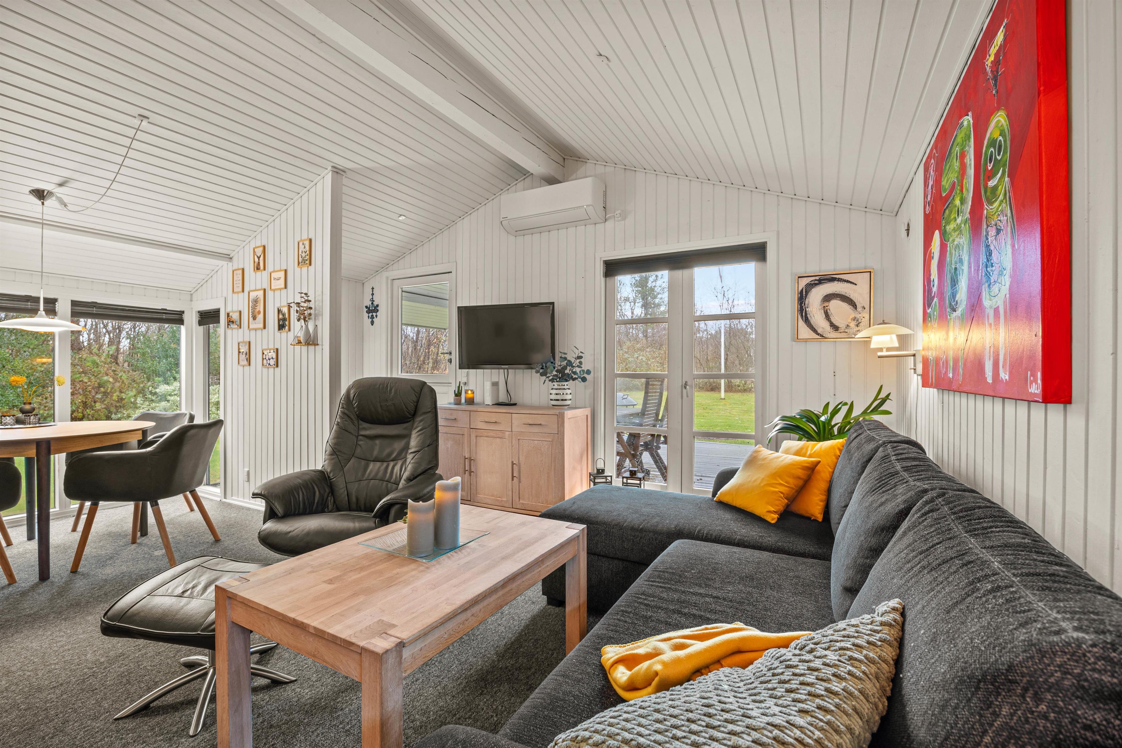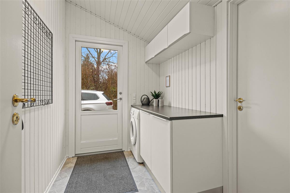 You enter the beautiful holiday home through the utility room, where there is space for coats and shoes as well as the house's washing machine. From here, you enter the cosily furnished living room with comfortable seating, TV and wood-burning stove.