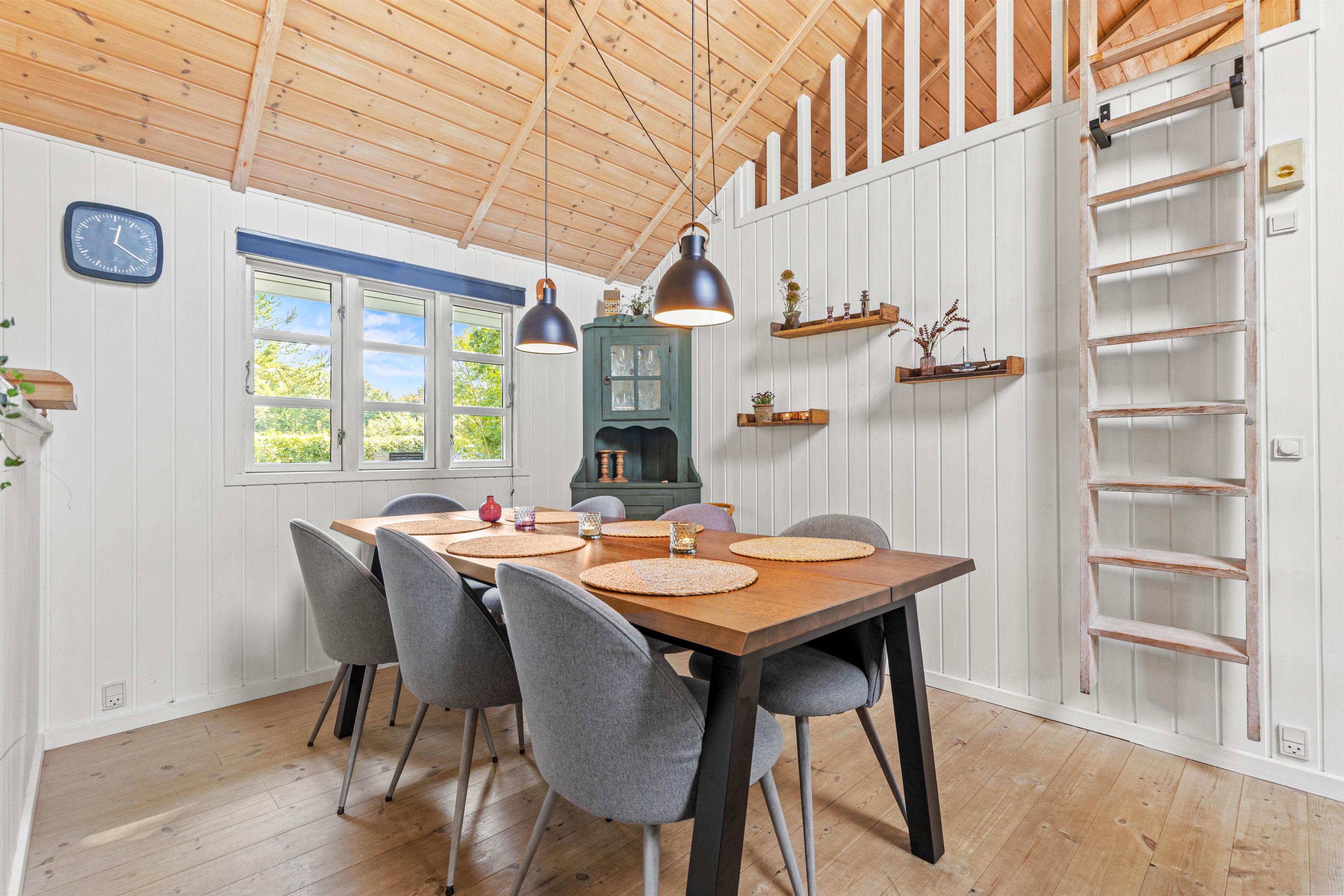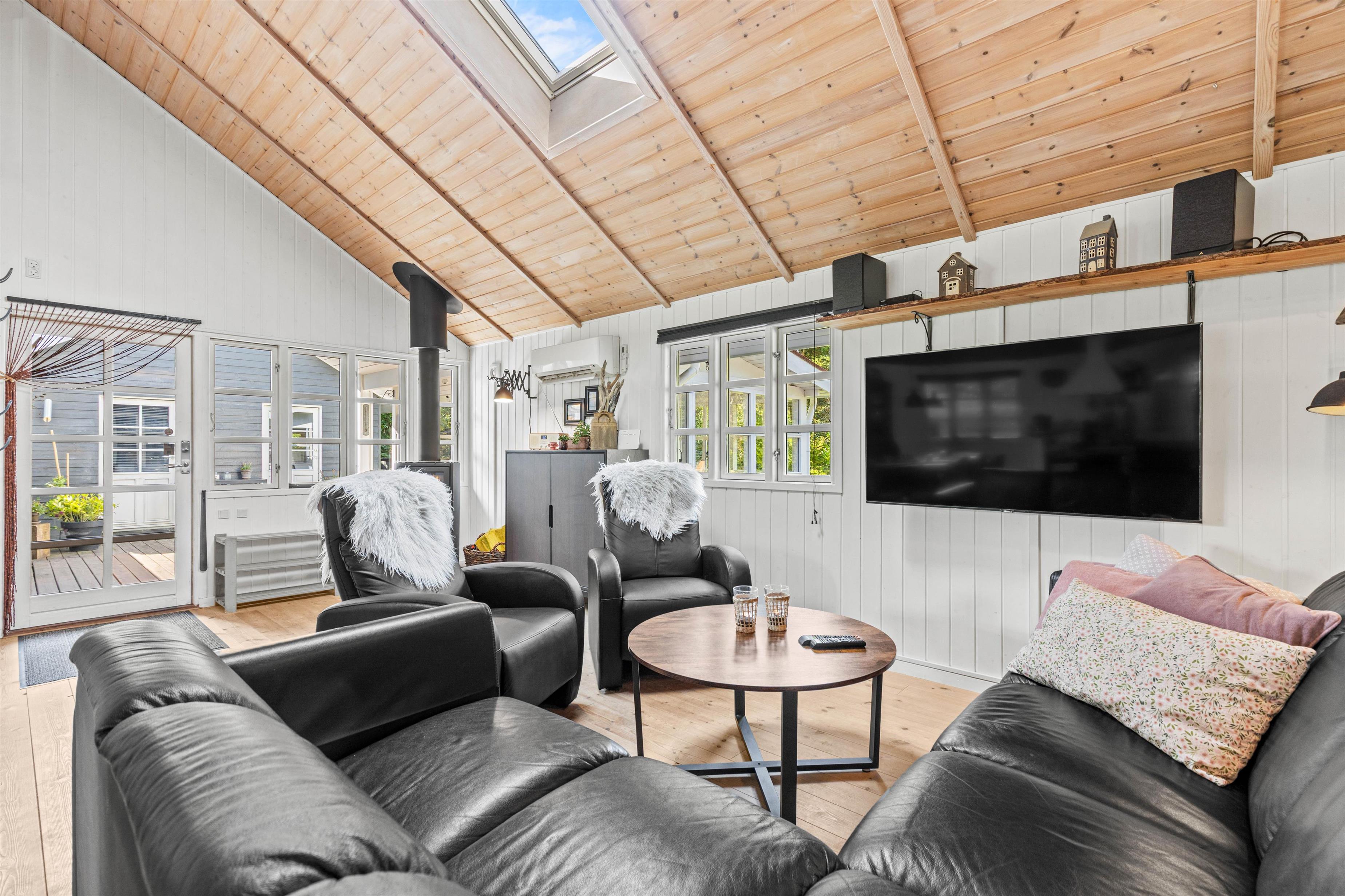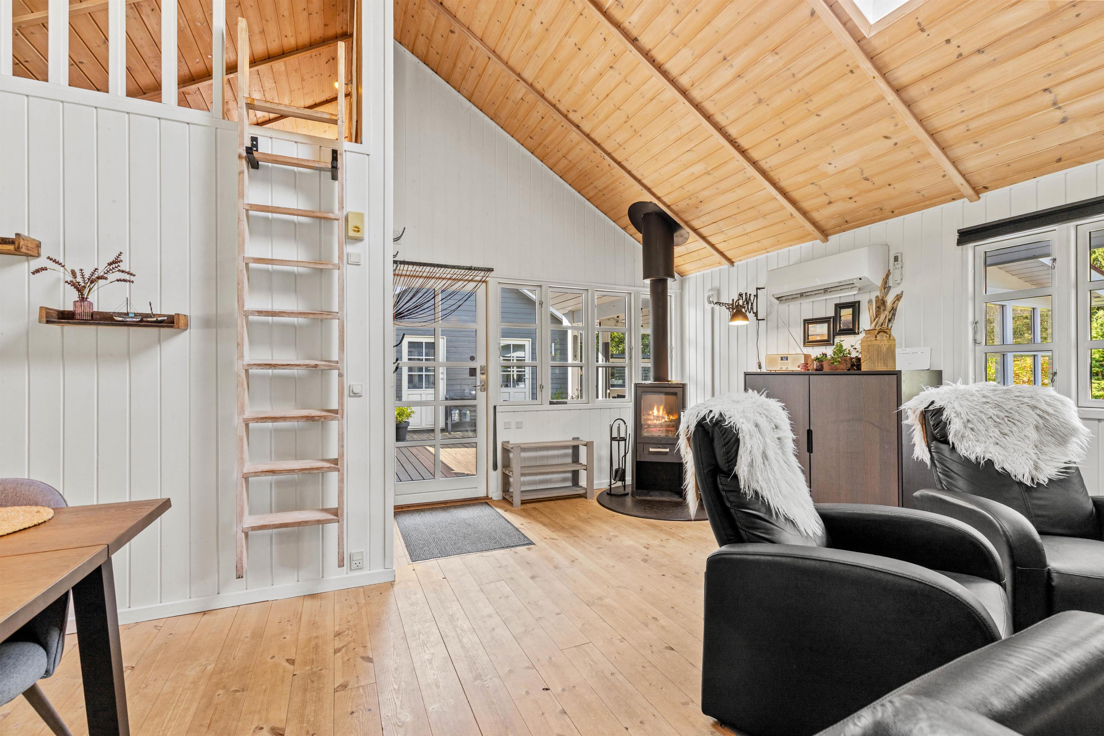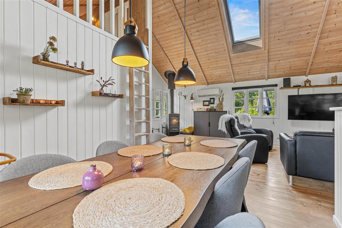 The living room is the perfect spot for sociable evenings with family or friends. The wood-burning stove provides welcoming warmth and creates a cosy atmosphere, especially on cooler days. The modern kitchen invites you to prepare delicious meals, with the integrated dishwasher making cleanup effortless. The open-plan kitchen design ensures you stay connected with your loved ones while cooking. Enjoy your home-cooked meals together while planning your next adventures in Jegum Ferieland.