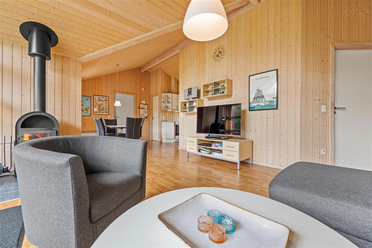 The living room offers a welcoming atmosphere, enhanced by a wood-burning stove where you can relax and enjoy the comforting warmth. Modern entertainment equipment ensures you'll never be bored, perfect for family film nights. The kitchen features a dishwasher making cleanup effortless, allowing more quality time with your loved ones. The kitchen area is fully equipped with all necessary appliances and utensils for preparing delicious meals. A dining area adjoins the kitchen, ideal for sociable mealtimes in a convivial setting.