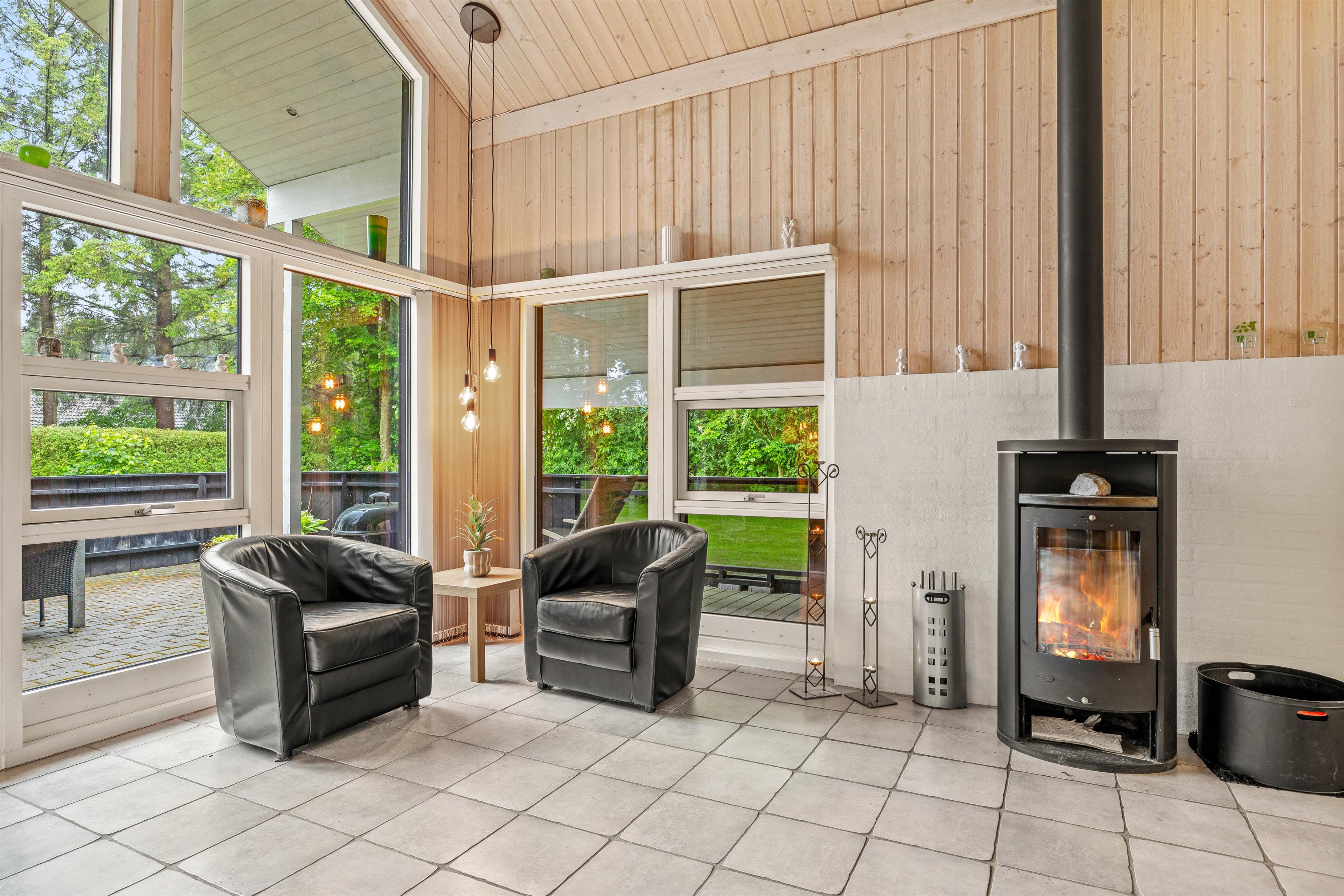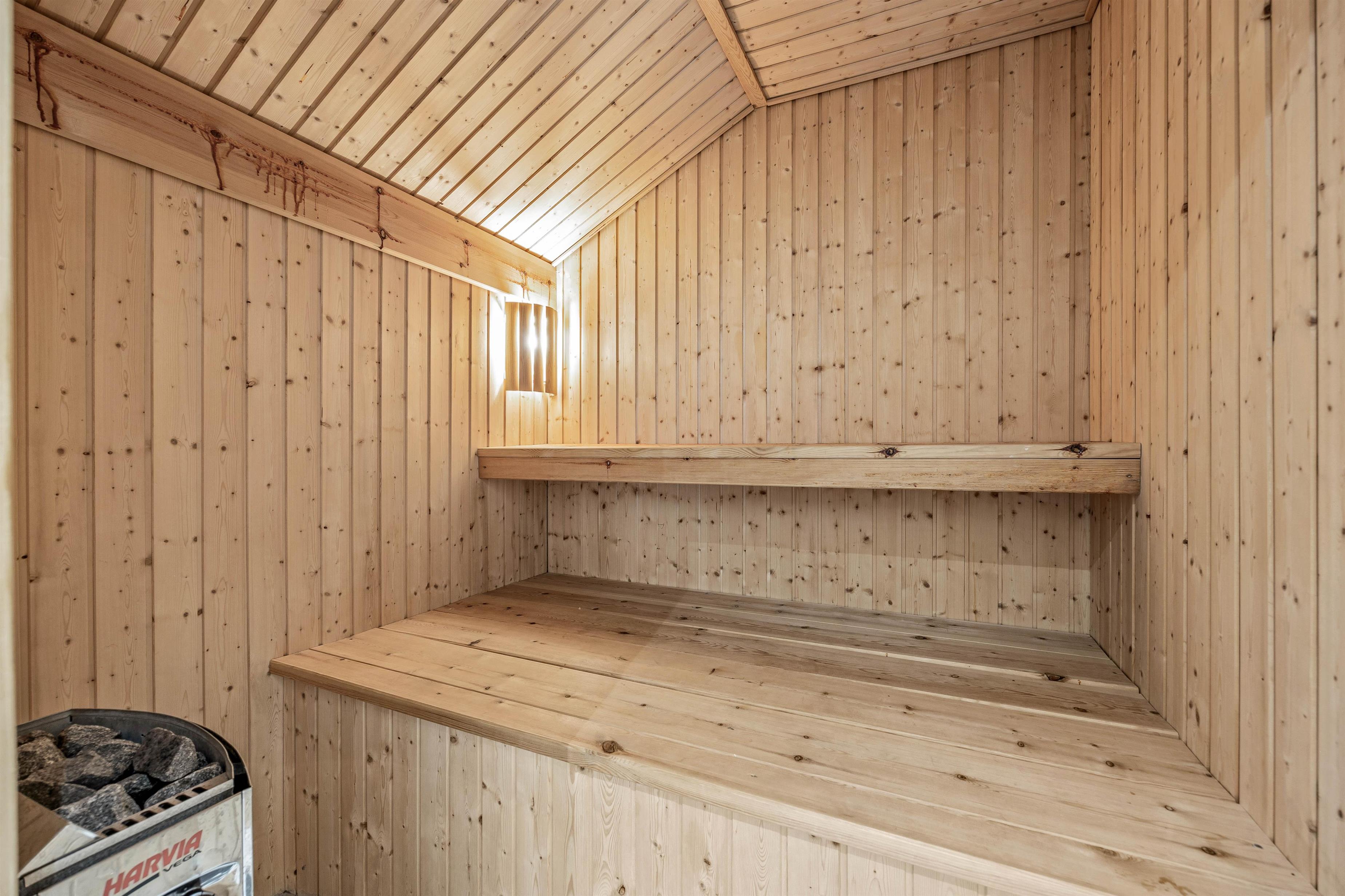 Comfortable amenities including wood-burning stove, whirlpool and sauna