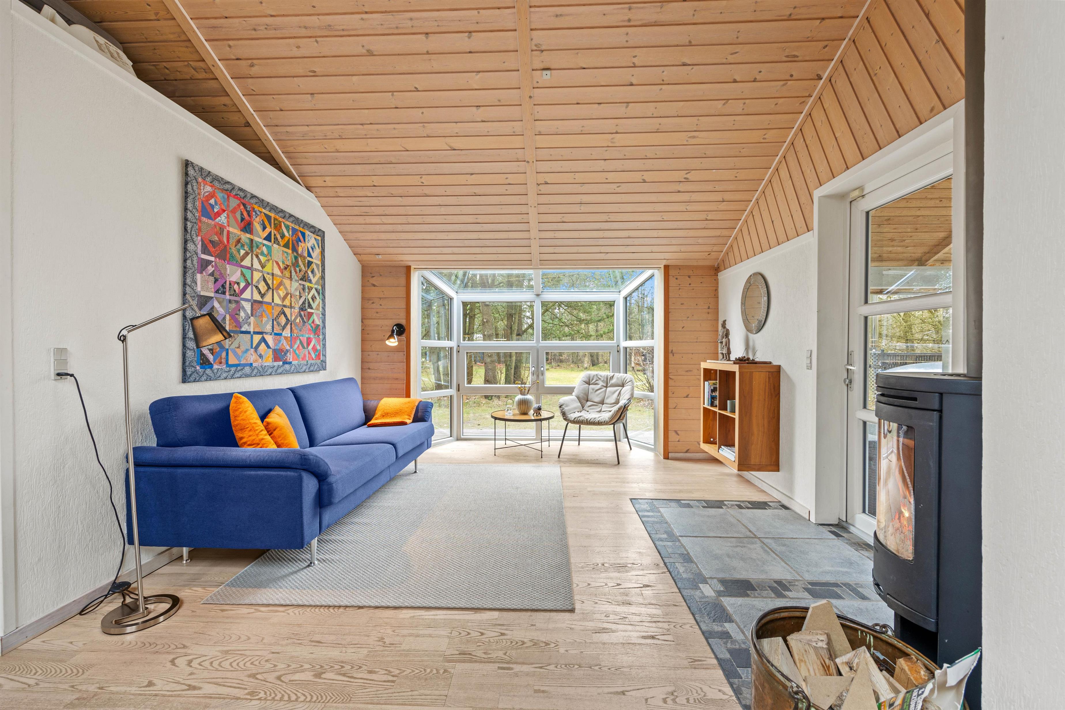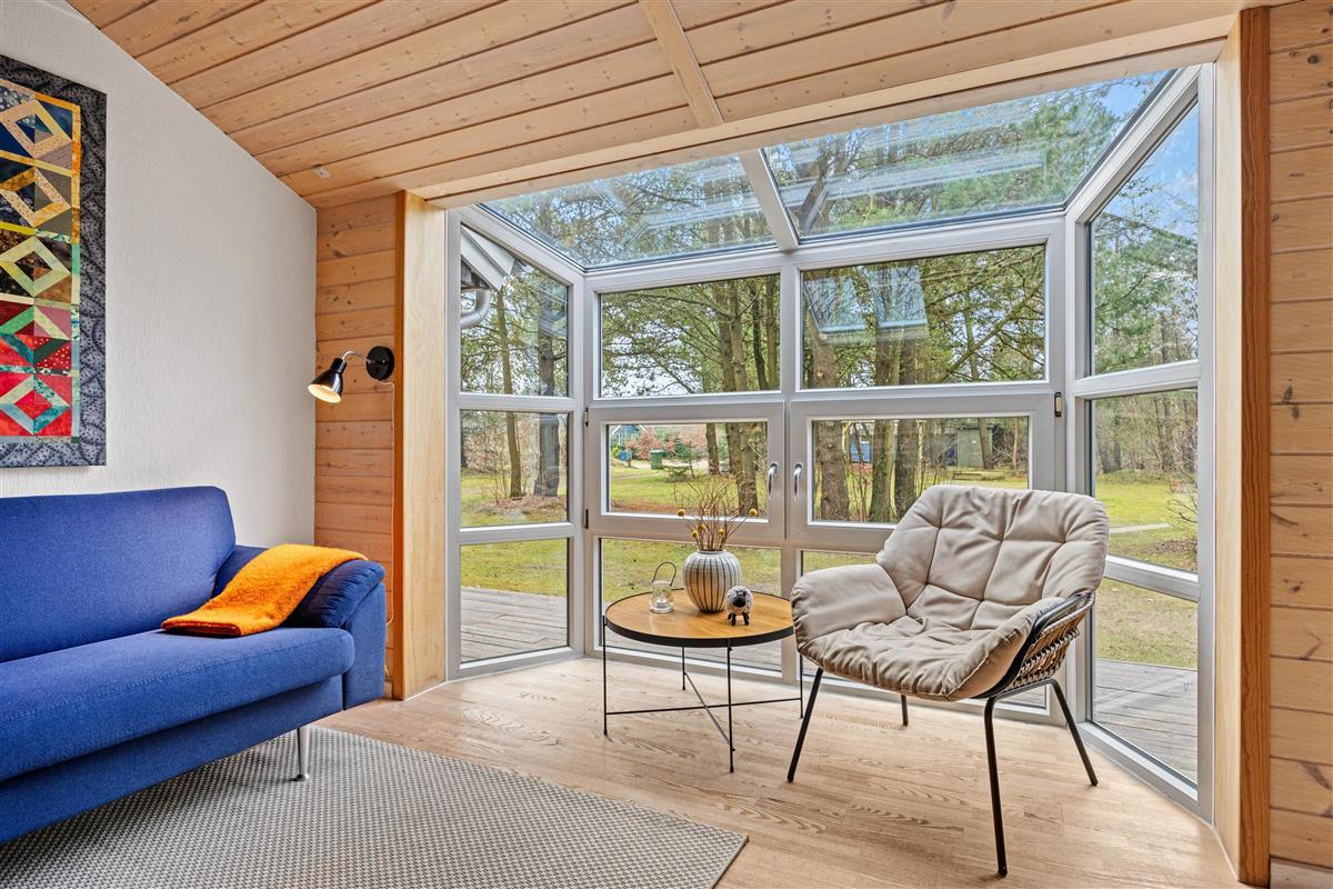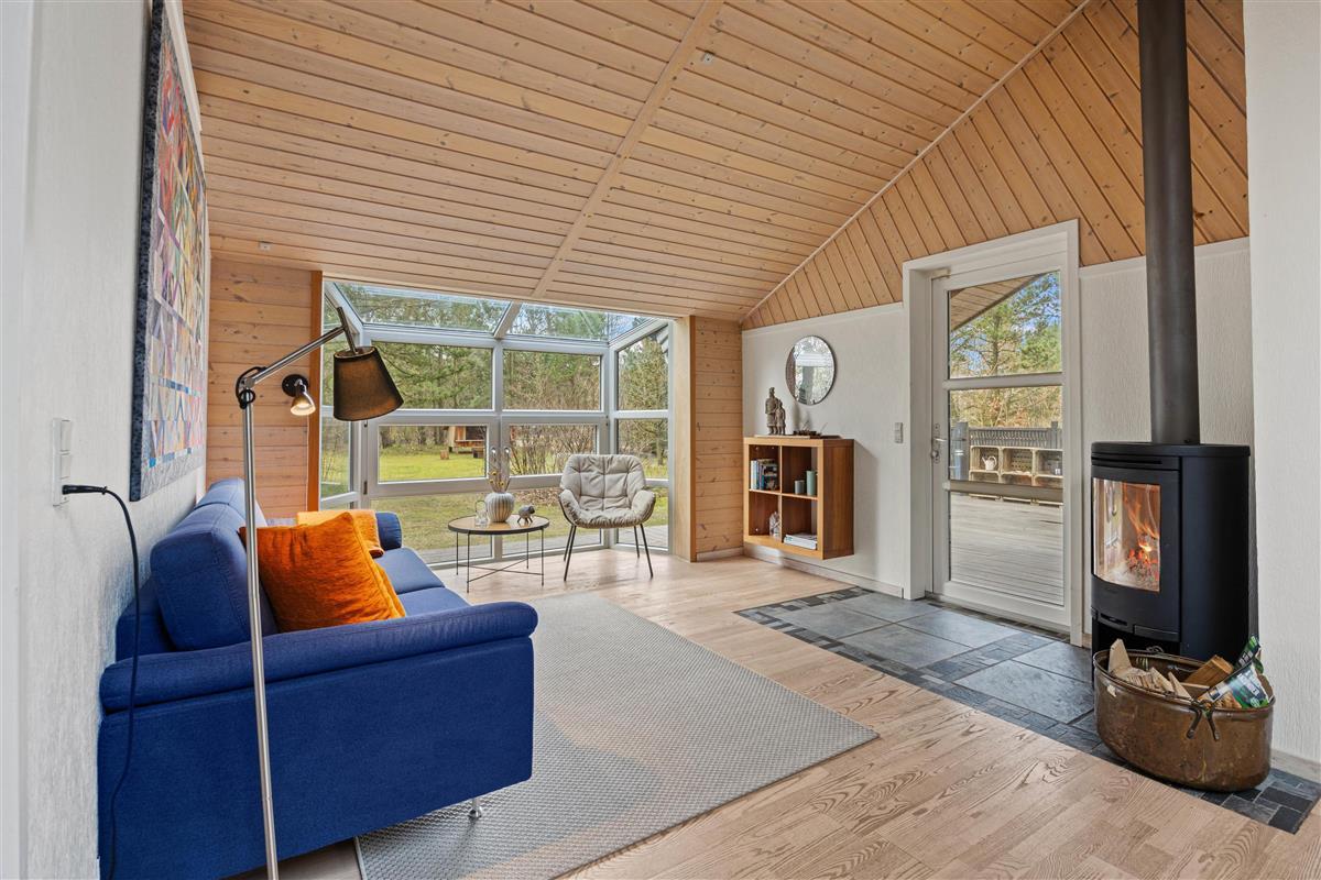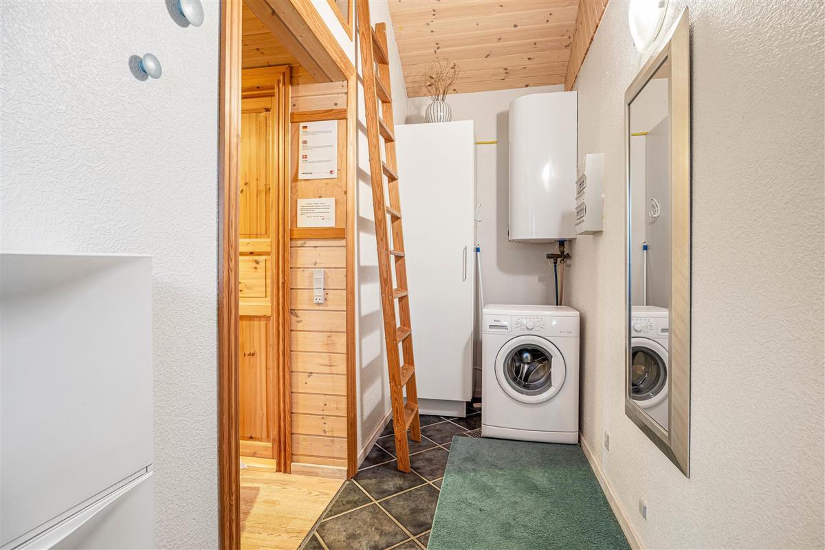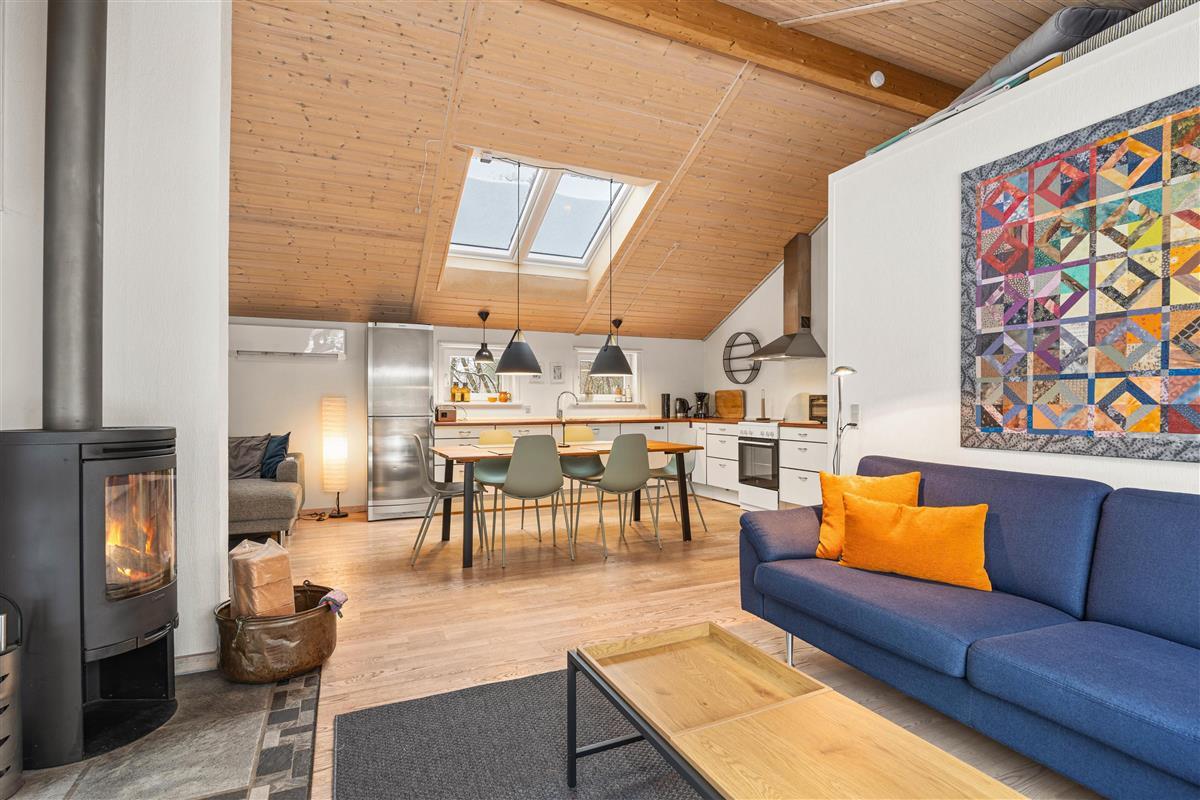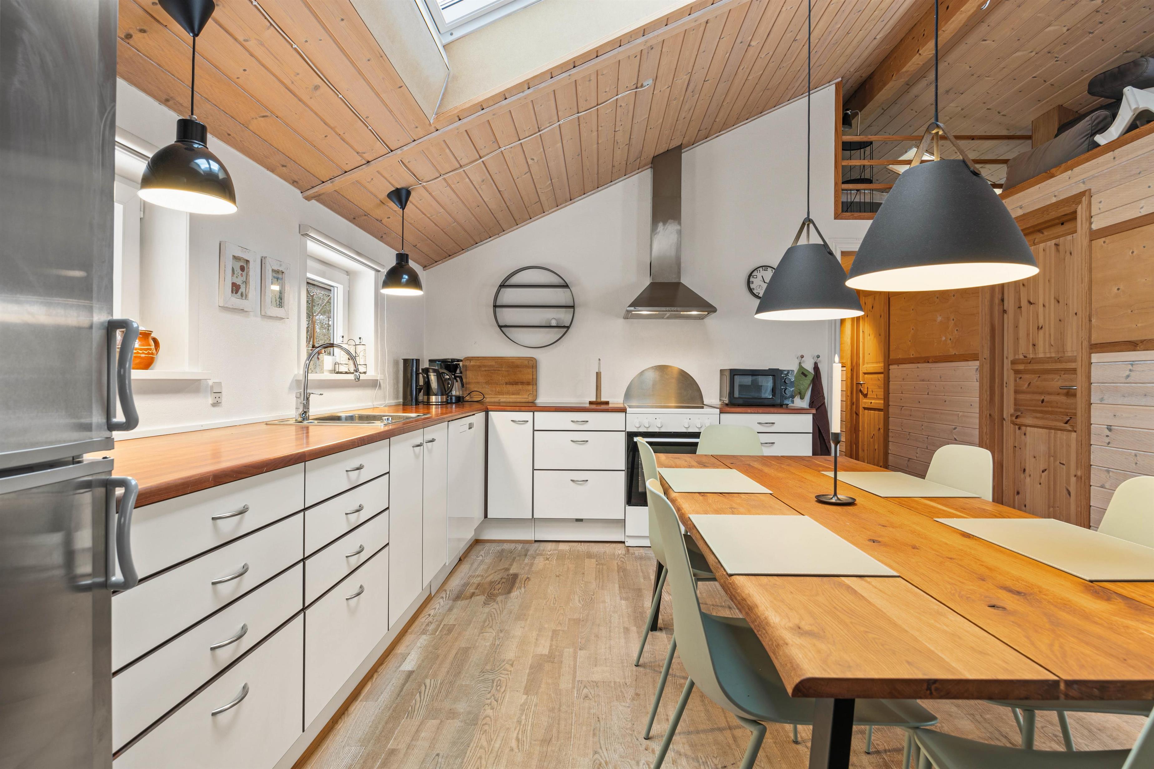 The wood-burning stove in the living room provides cosy warmth and creates a comfortable atmosphere perfect for relaxing evenings. Make yourself comfortable on the sofa with family or friends, watch a film together, or simply enjoy the views of nature through the large windows. The kitchen is practically equipped to meet all your culinary needs. A dishwasher makes cleaning up easier, and the kitchen dining area allows for shared meals and memorable moments together. The kitchen offers ample space for cooking and socialising with multiple people.