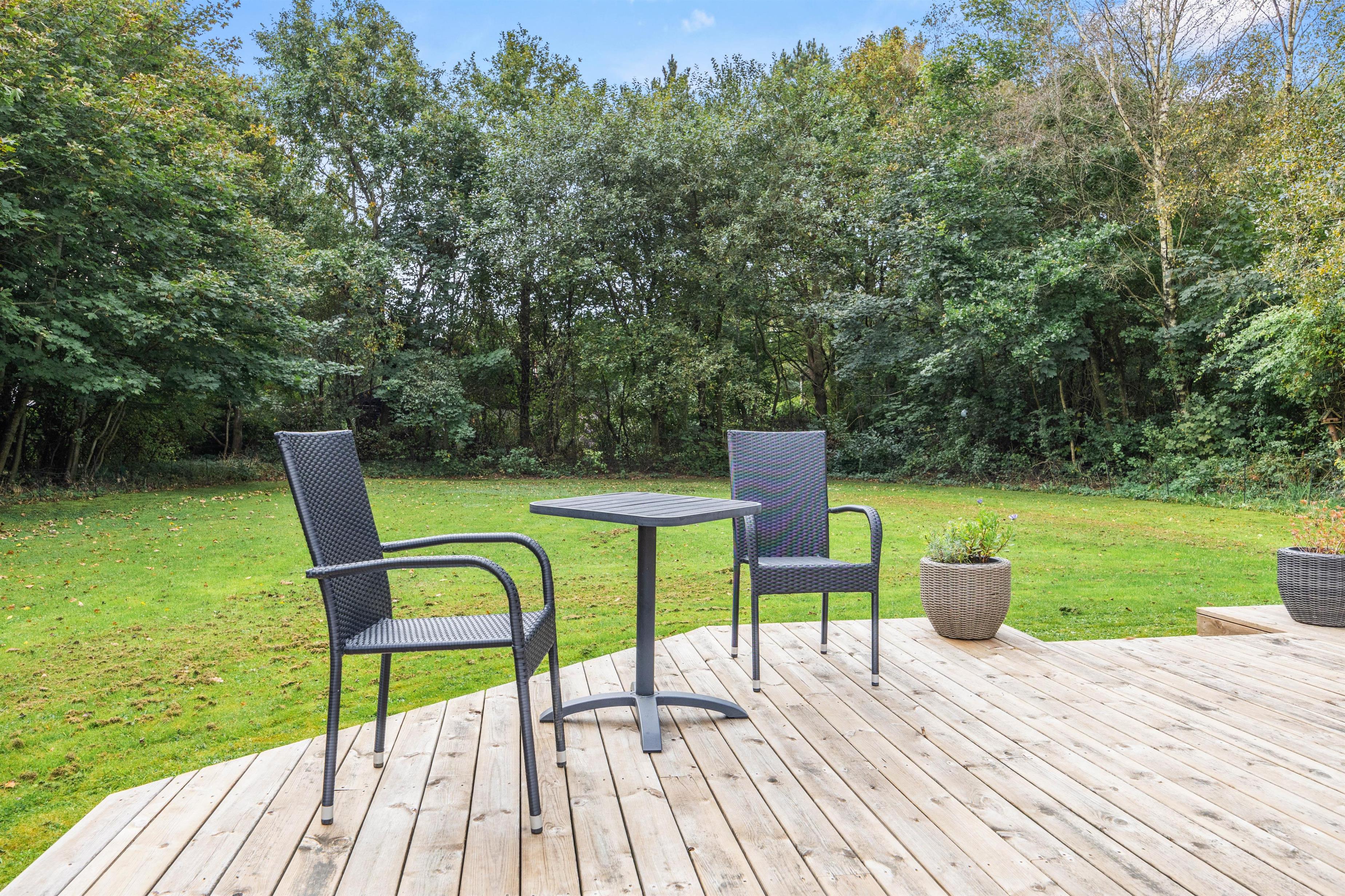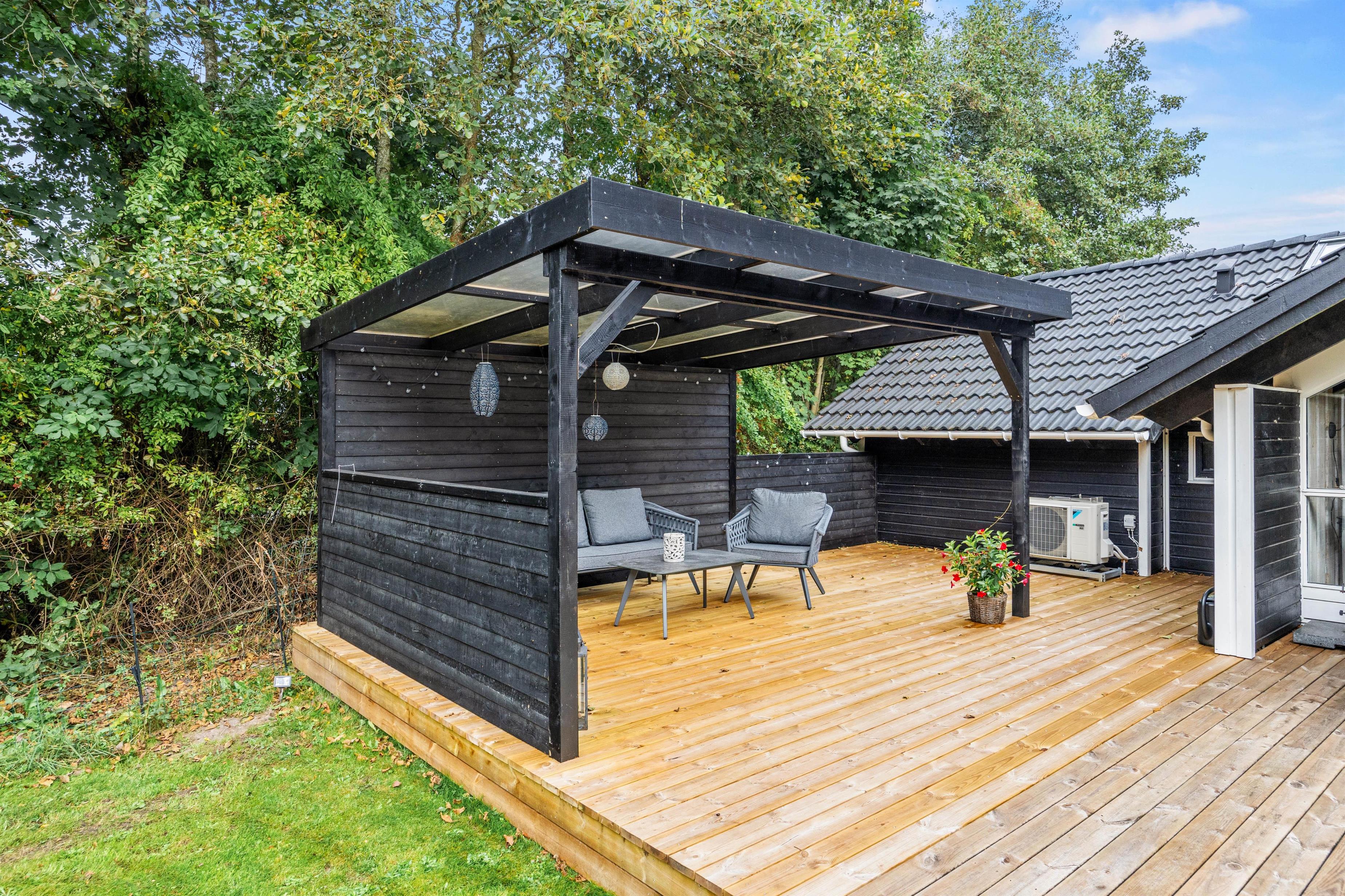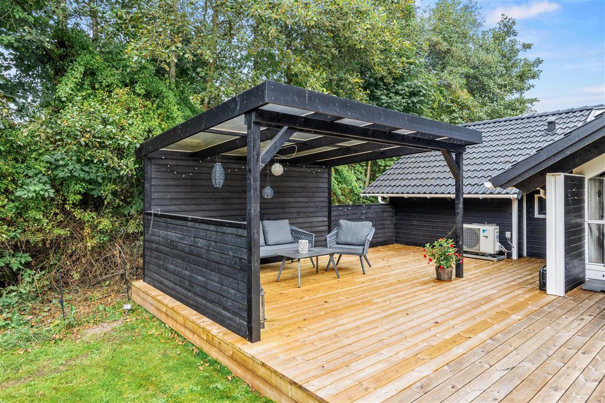 The open terrace at Enebærvangen 18 is perfect for sunny days and offers plenty of space for socialising. Here you can relax during a lovely barbecue evening while enjoying the fresh air. The partially covered terrace provides additional space to retreat and enjoy peace and quiet, protected from the elements. The lawn, newly fenced in 2024, is ideal for families with children and dog owners. Your children can play safely while your dog can move freely without causing worry.