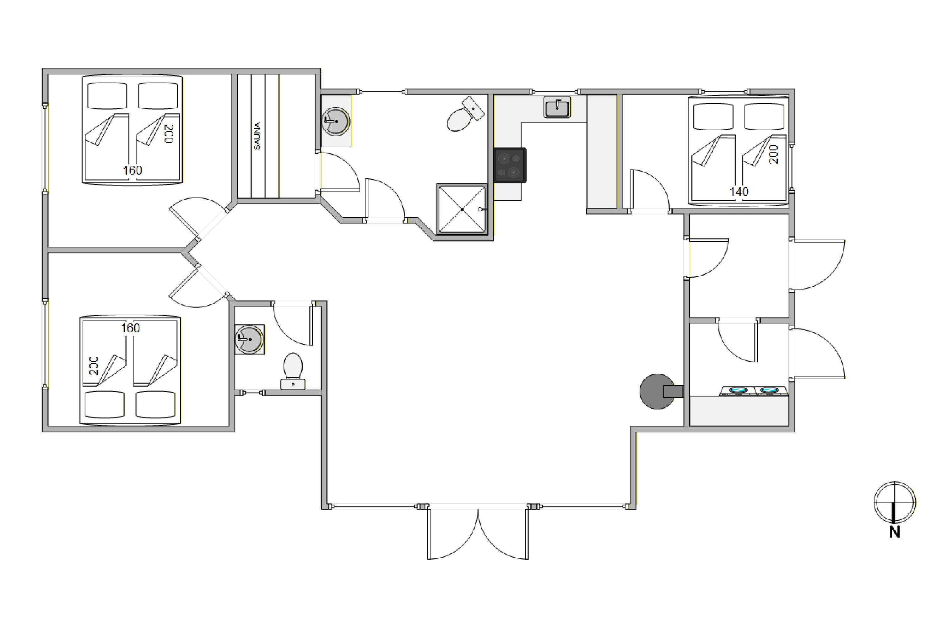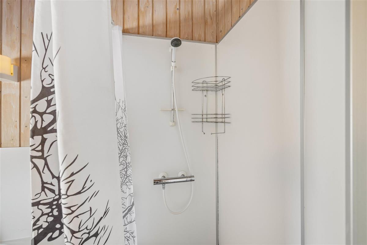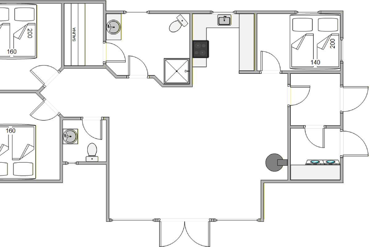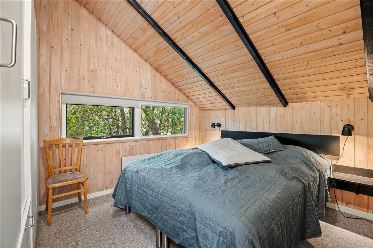 The holiday home at Enebærvangen 18 features three bedrooms, each furnished with a double bed. The bathroom's underfloor heating ensures warm feet at all times, while the sauna offer additional relaxation options. A guest toilet helps avoid morning queues, and a washing machine and tumble dryer easily handle laundry needs during longer stays. An air-to-air heat pump maintains a comfortable room temperature throughout the year.