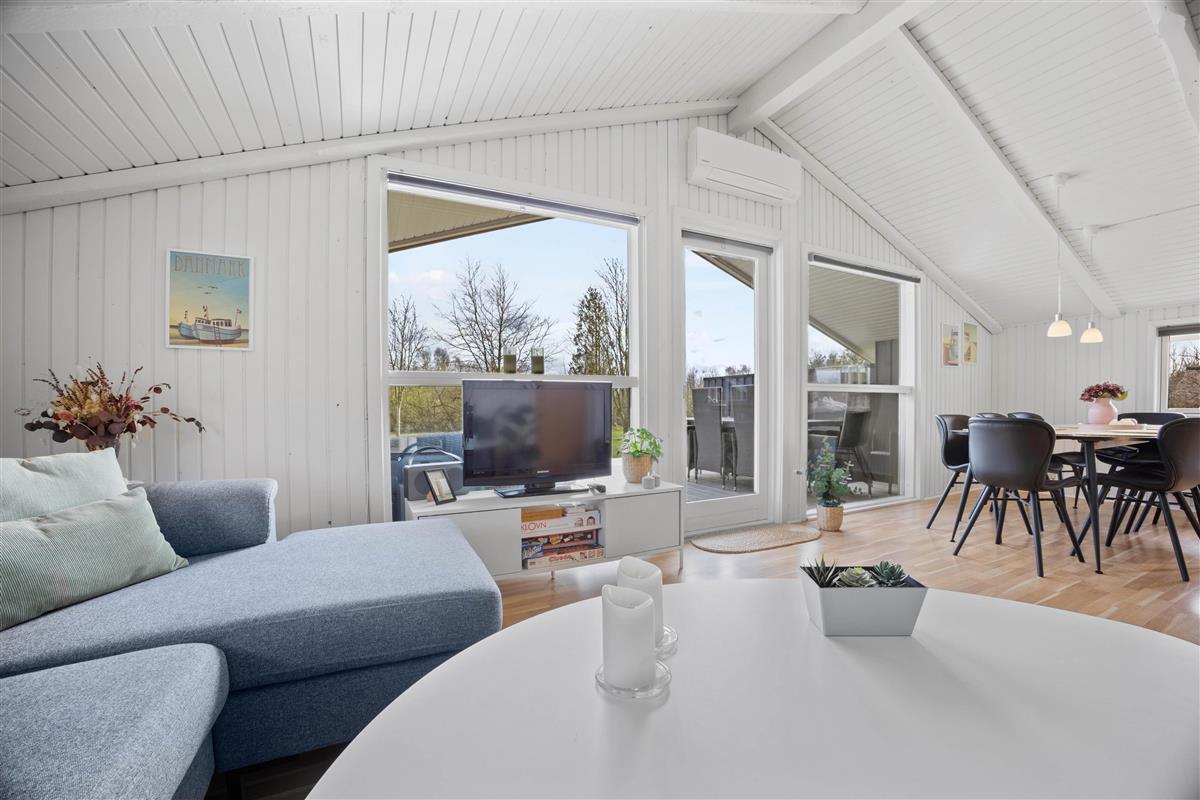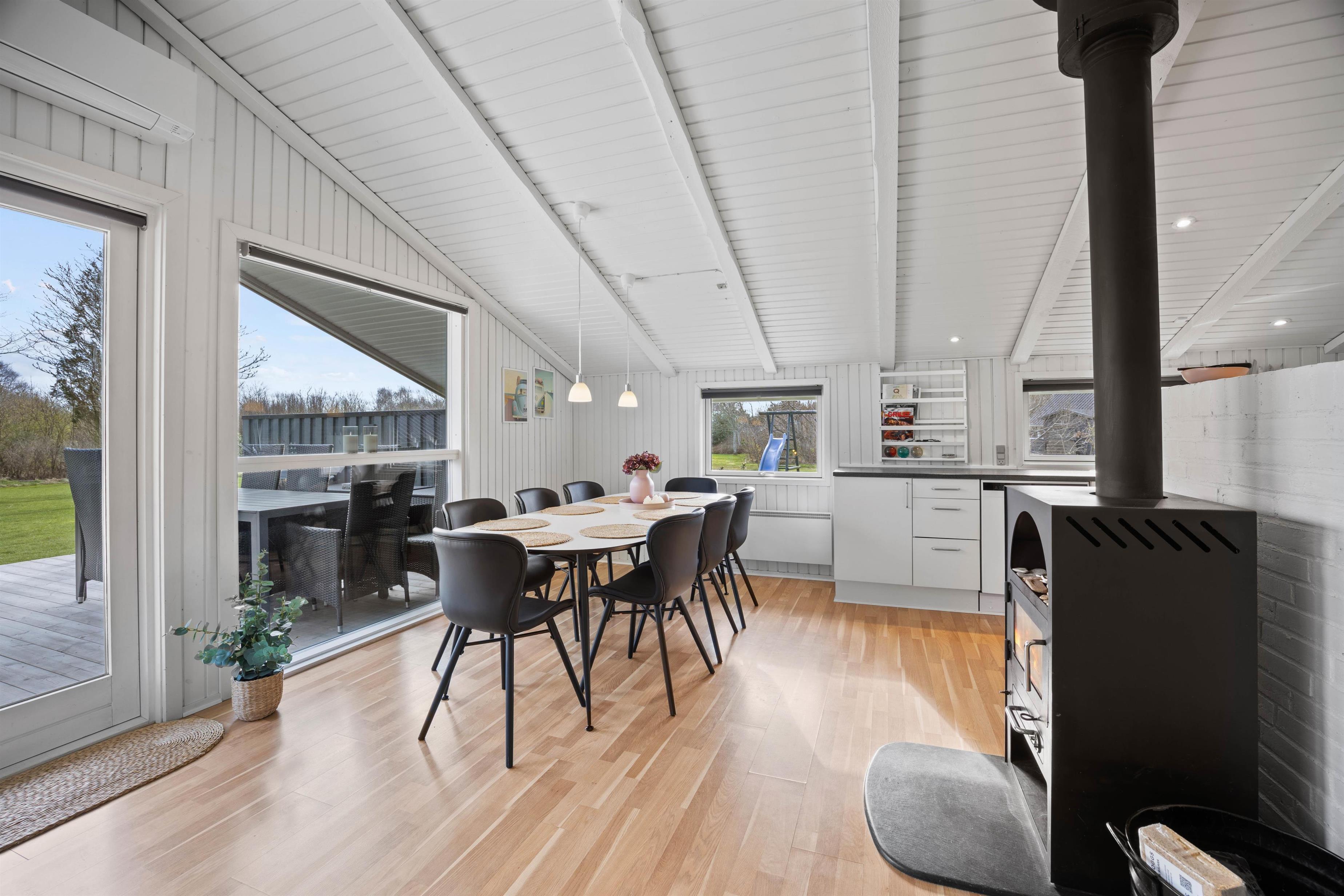 The 82 square metre holiday home accommodates up to 6 people. Renovated in 2021, it combines modern design with Scandinavian flair to create a welcoming atmosphere. At the heart of the holiday home is the living room, featuring a wood-burning stove that provides cosy warmth on cooler days and creates a comfortable ambiance. Additionally, an energy-efficient heat pump ensures pleasant temperatures year-round. Google Chromecast is available for relaxing film evenings. The modern kitchen makes cooking a pleasure, complete with a dishwasher to make your stay easier. The dining area, directly adjacent to the kitchen, is perfect for shared meals and sociable gatherings.