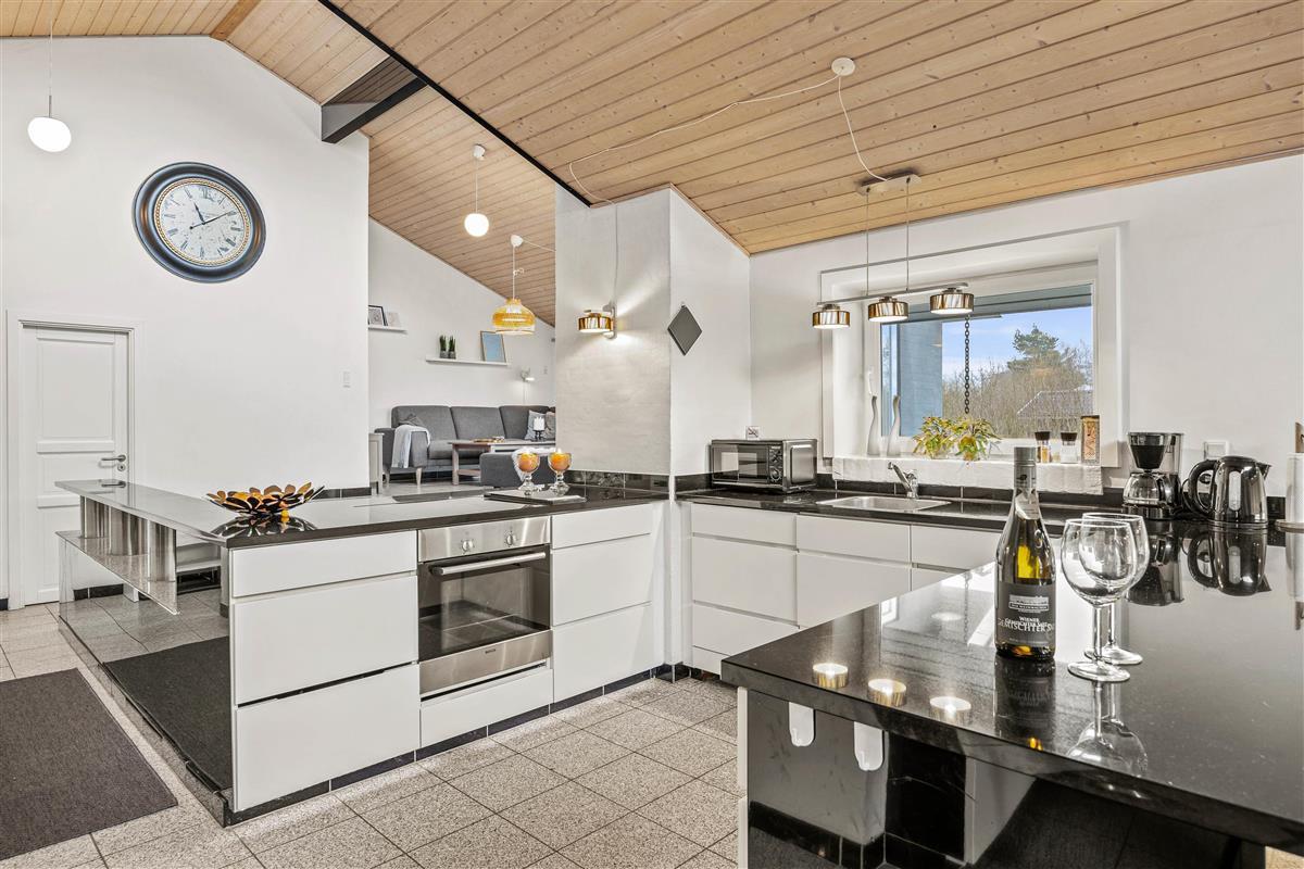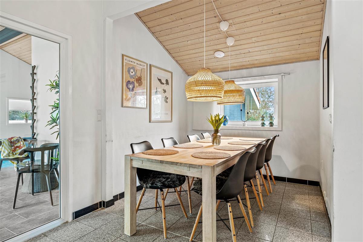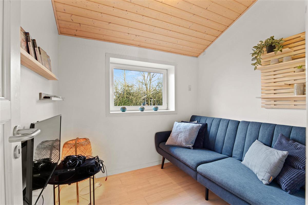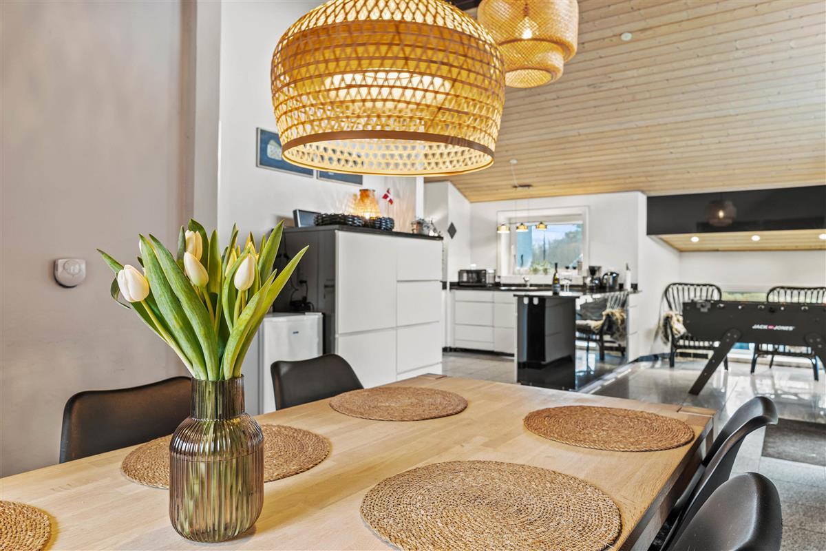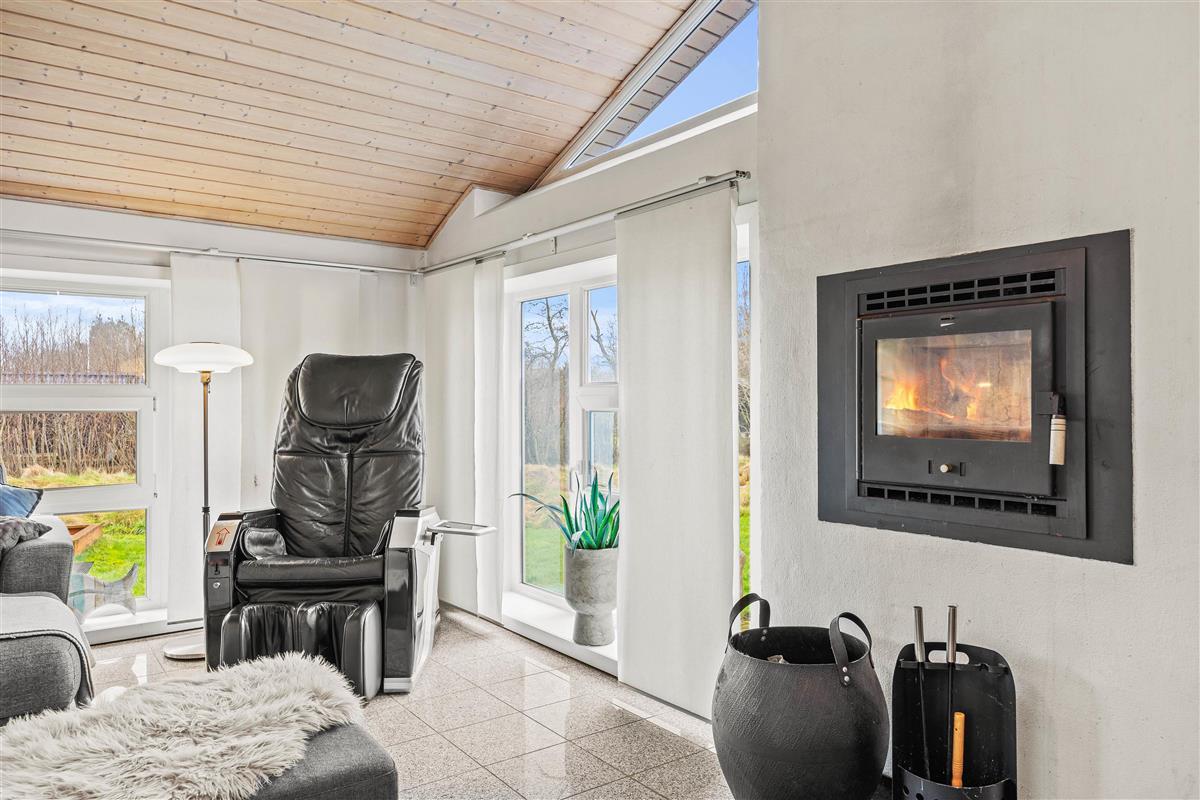 The open-plan kitchen and living area is perfect for socialising. The modern kitchen features a dishwasher to make your stay easier. Try out your favourite recipes and enjoy them together at the large dining table. The wood-burning stove in the living area creates a cosy atmosphere. Whether reading a book, playing games with the family or relaxing in front of the television, you can enjoy quality time together here. Please note that the use of the massage chair costs 10 dk per session.