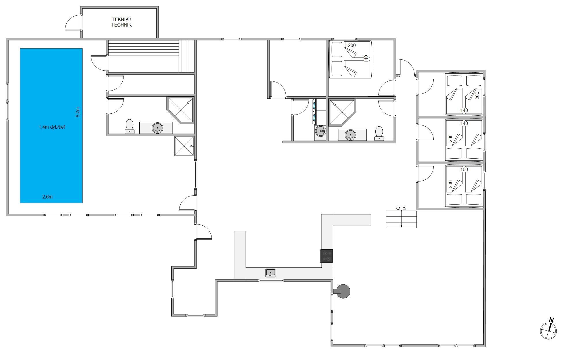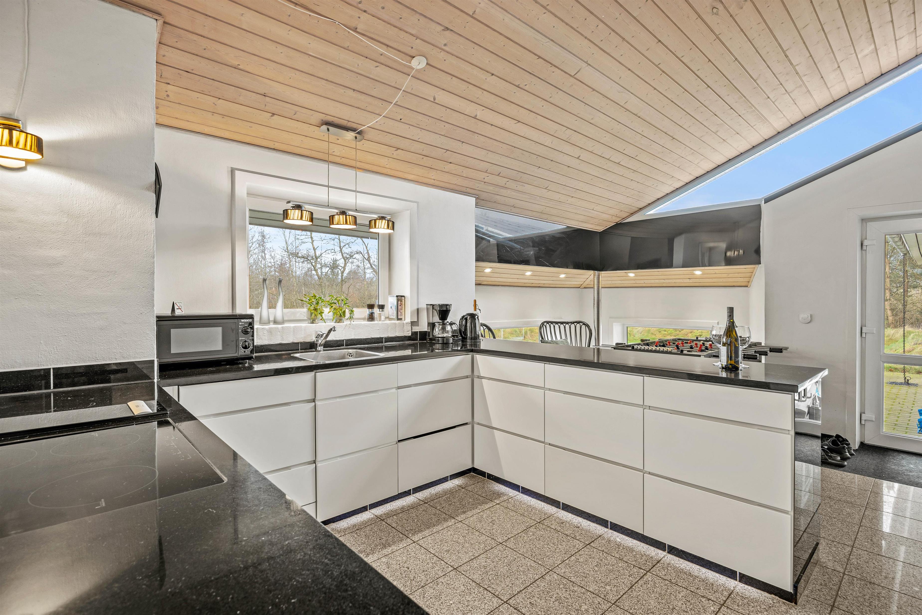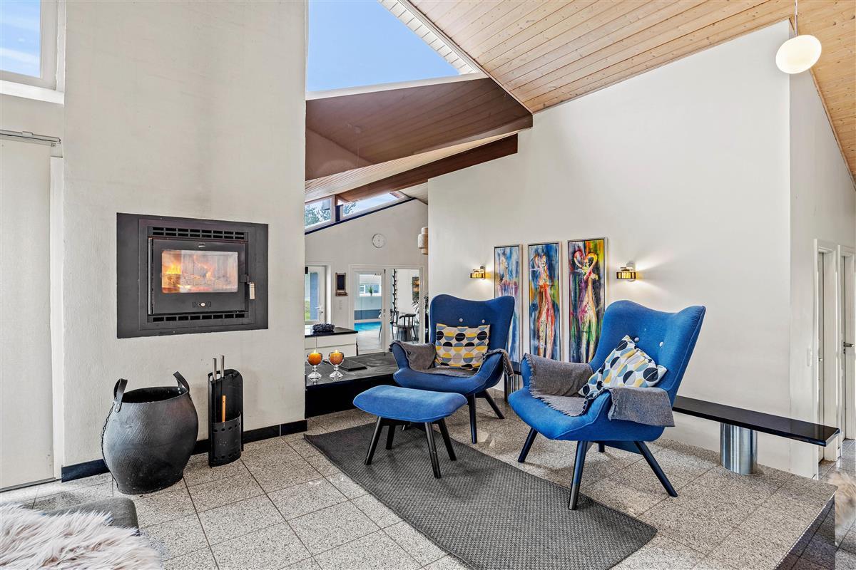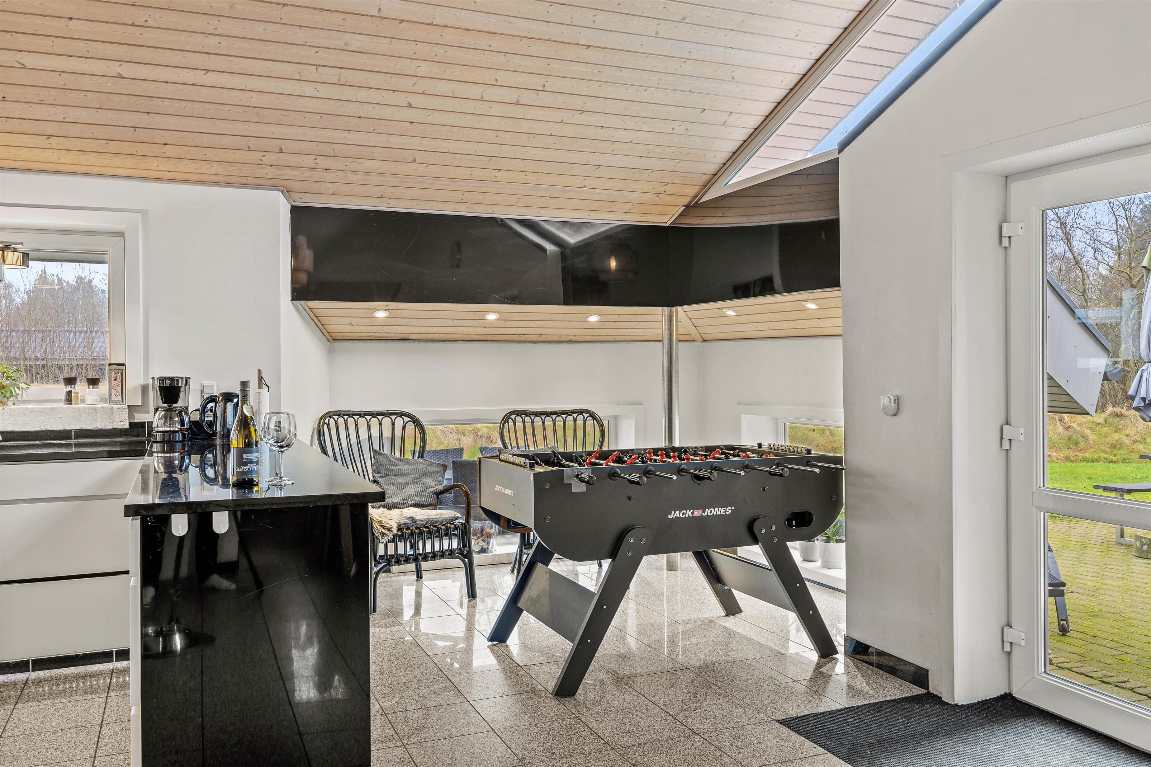 The open-plan kitchen and living area is perfect for socialising. The modern kitchen features a dishwasher to make your stay easier. Try out your favourite recipes and enjoy them together at the large dining table. The wood-burning stove in the living area creates a cosy atmosphere. Whether reading a book, playing games with the family or relaxing in front of the television, you can enjoy quality time together here. Please note that the use of the massage chair costs 10 dk per session.