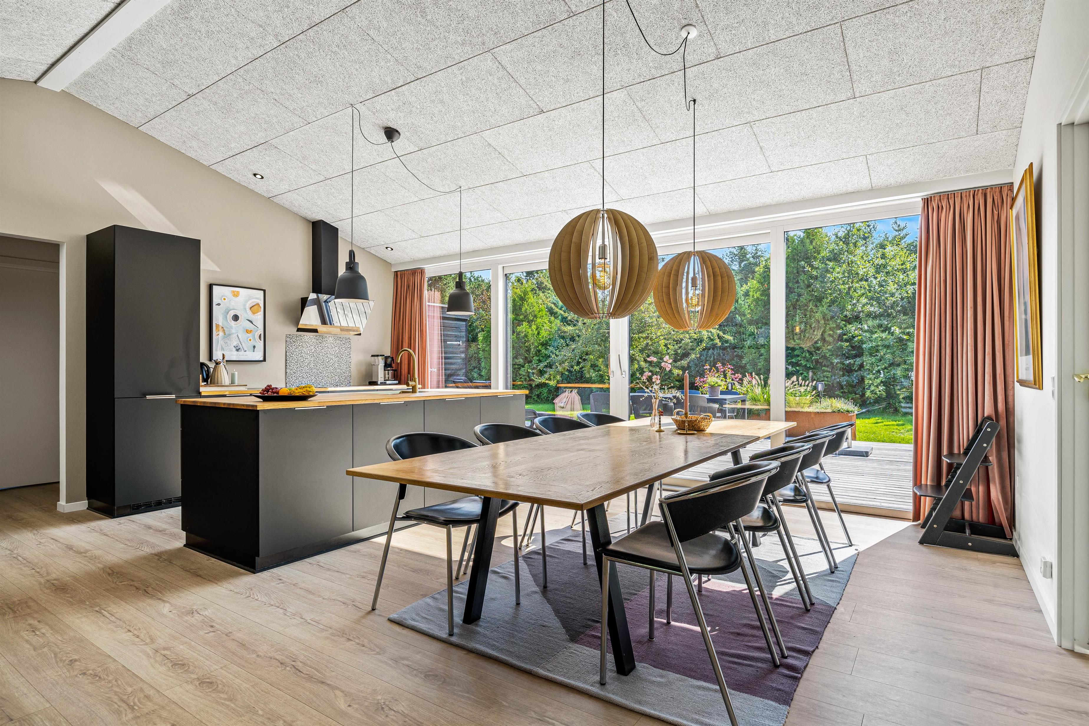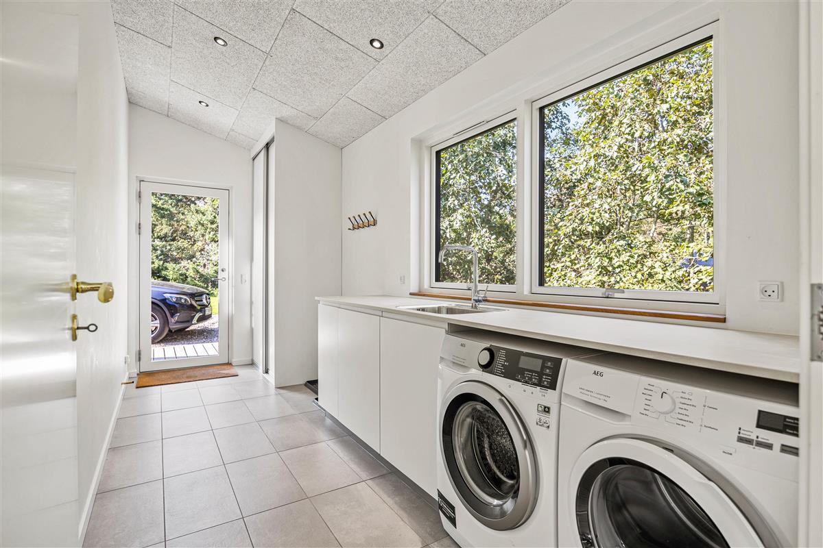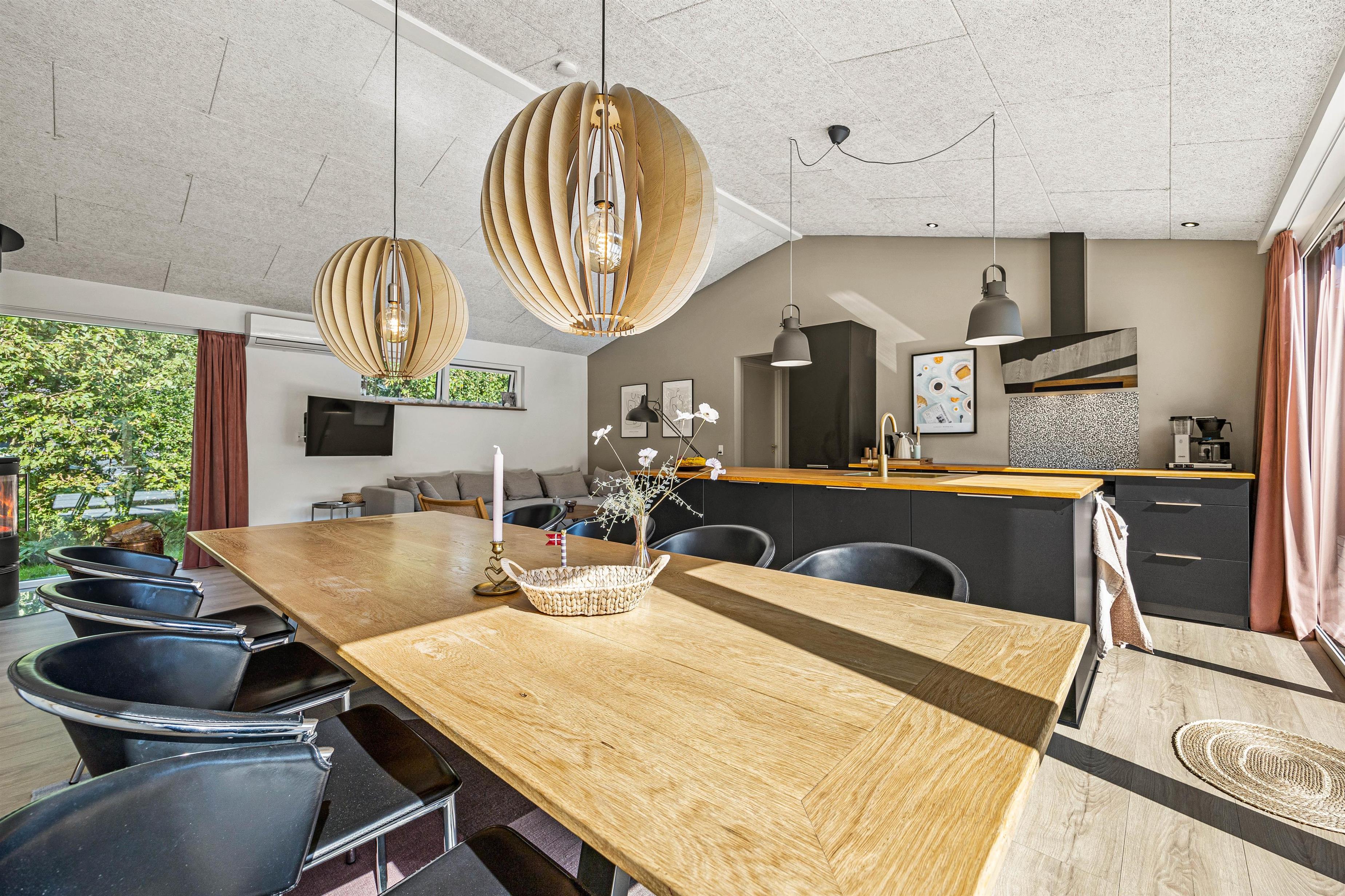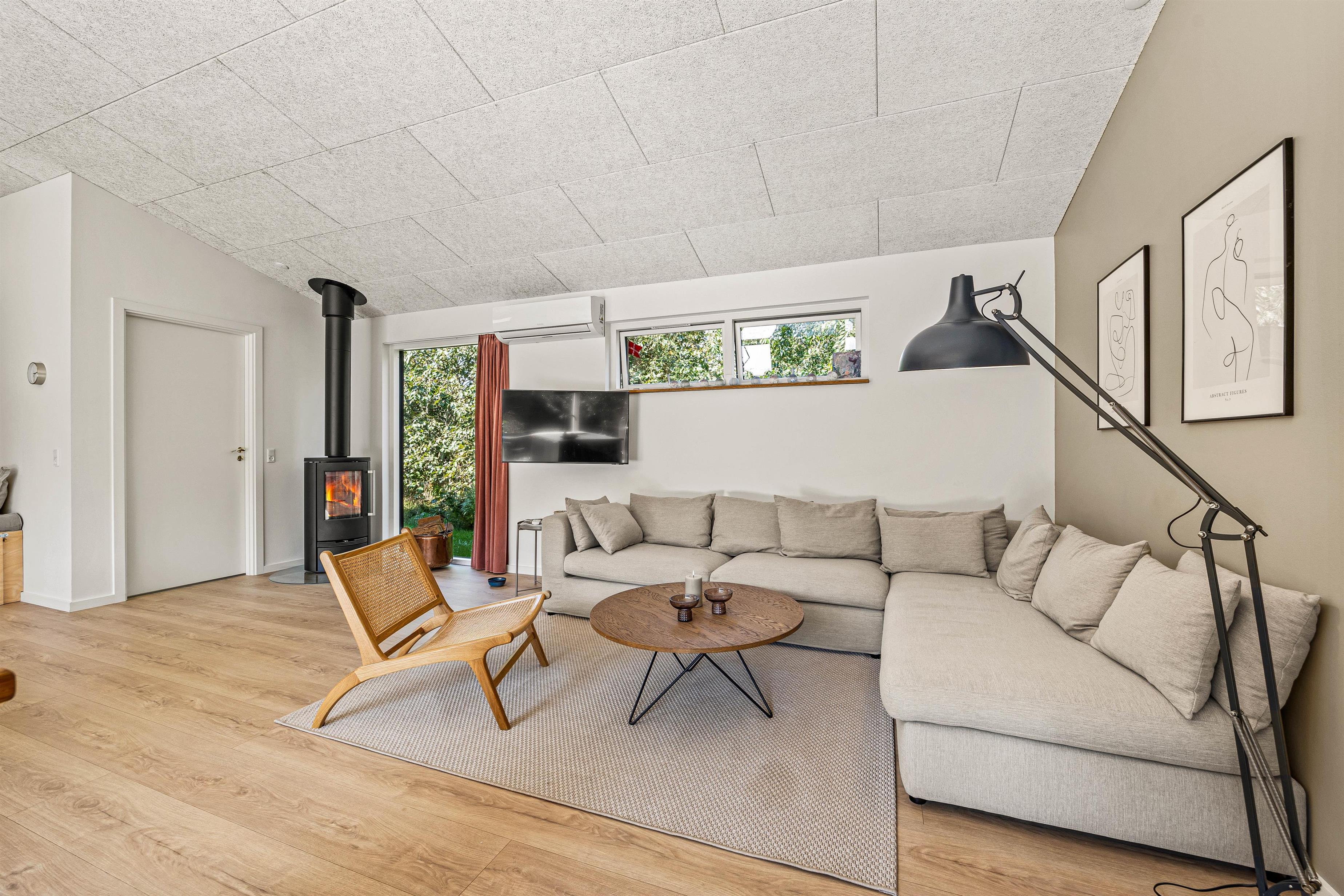 Conveniences including a washing machine, tumble dryer, dishwasher, and modern heat pump ensure comfort throughout the year, even at full occupancy. The modern heating system maintains pleasant temperatures, complemented by a wood-burning stove in the living room. This creates a particularly cosy atmosphere on cooler days, providing that perfect holiday feeling with authentic Scandinavian hygge.