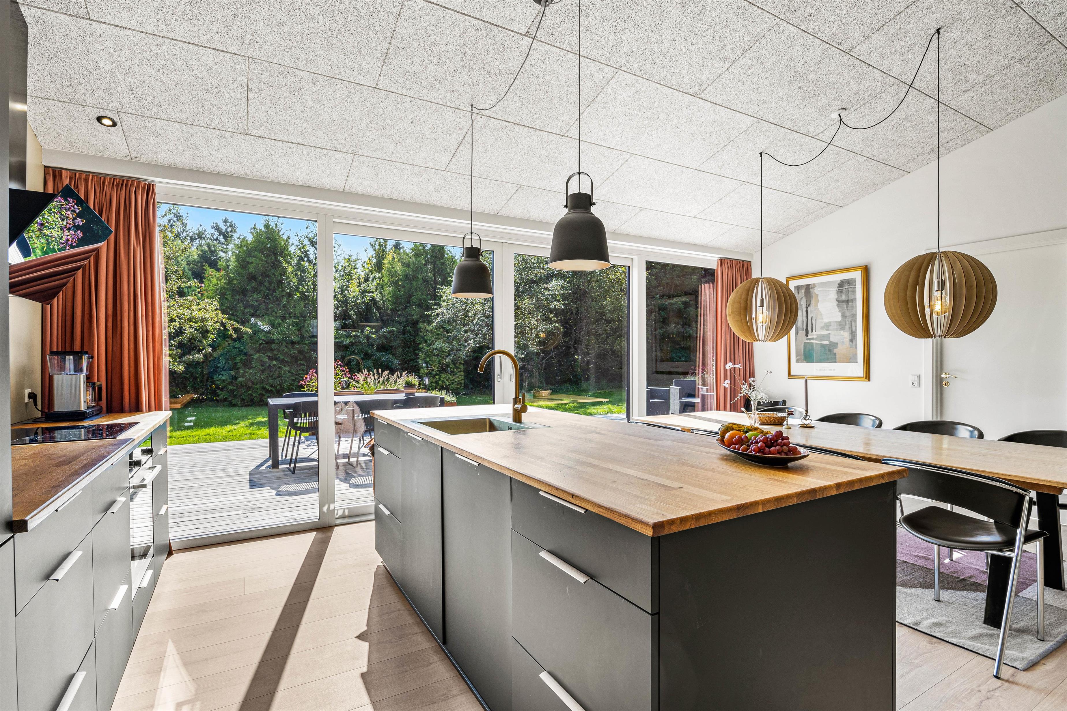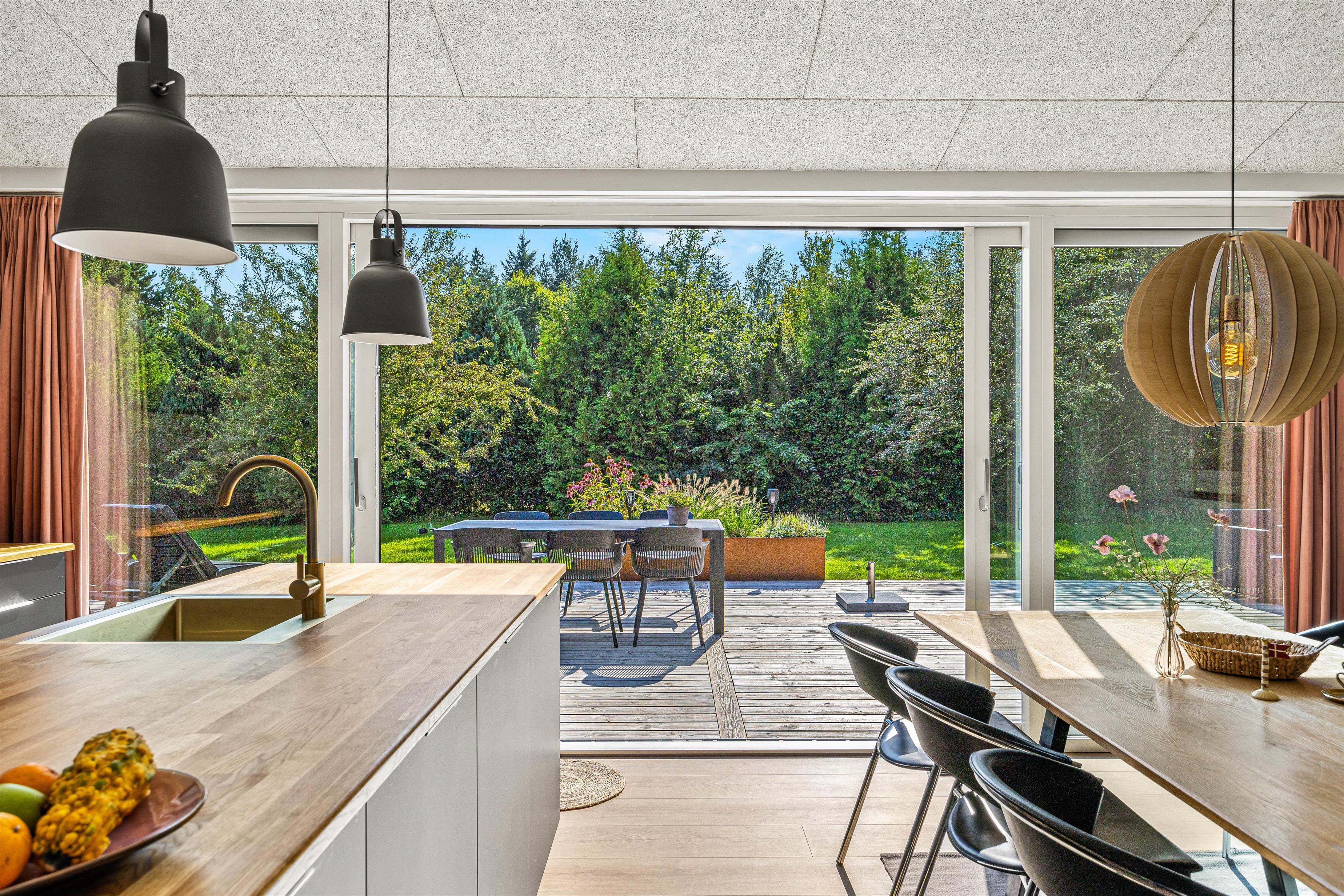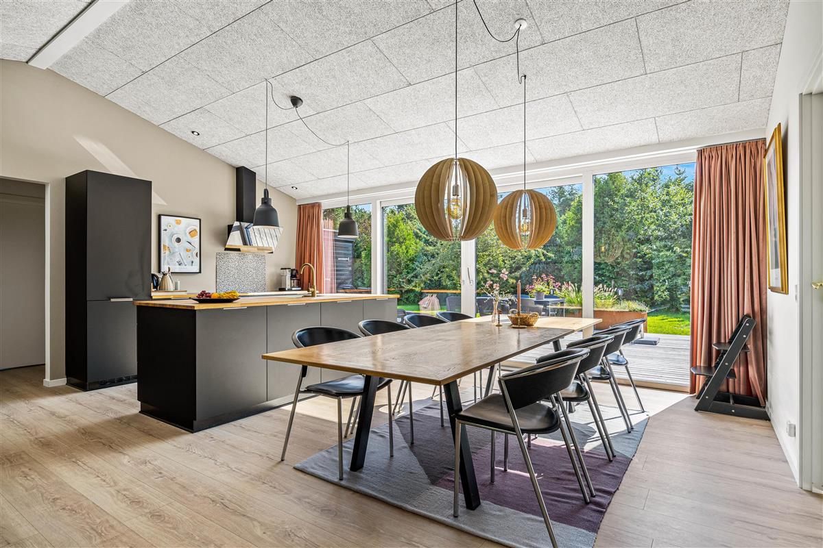 The living area flows openly into the modern, well-equipped kitchen and comfortable dining space. Whether you're preparing a delicious meal or watching your favourite programme on TV, you can enjoy time together. The living area leads onto the adjoining terrace, perfect for outdoor dining and relaxation, especially in summer.