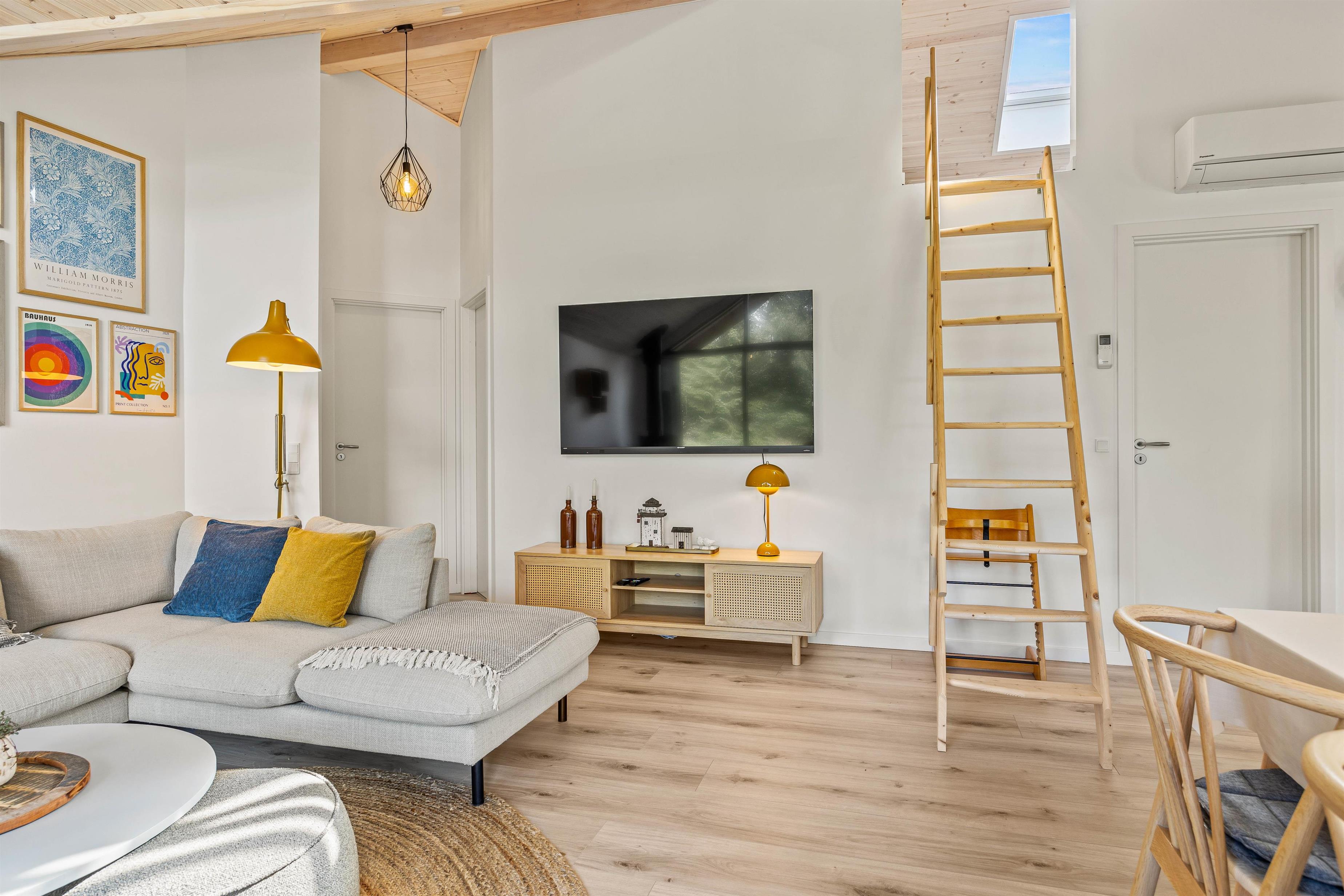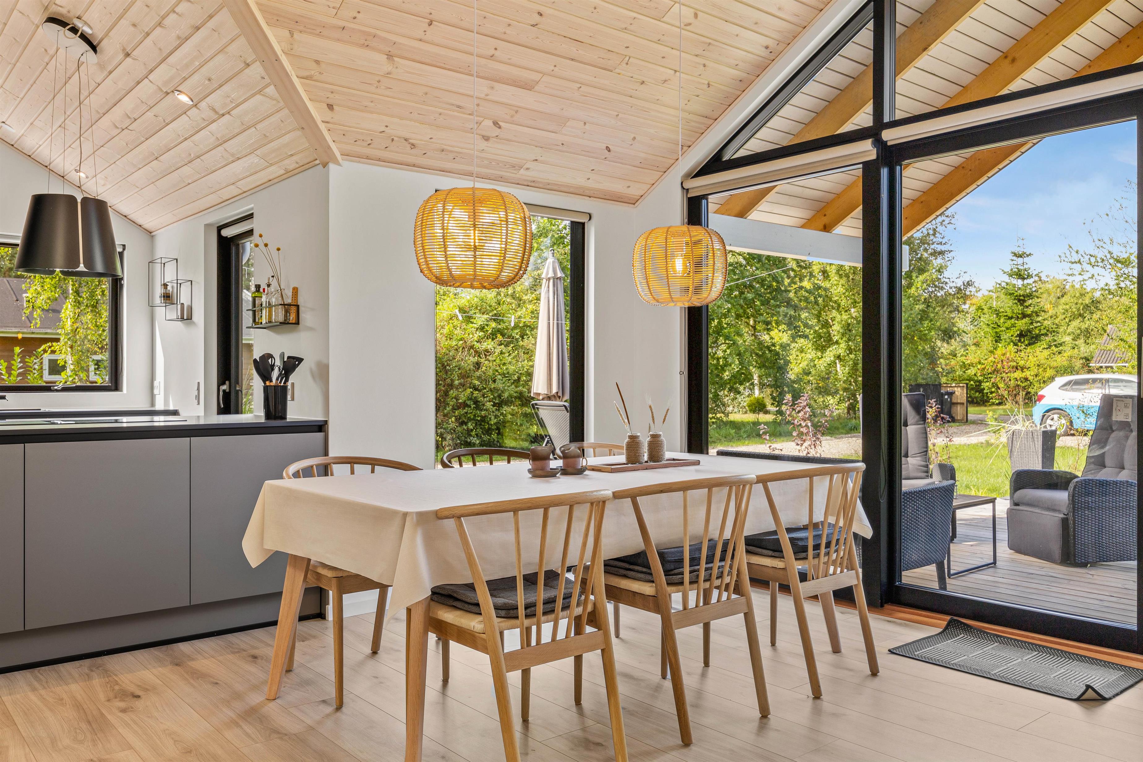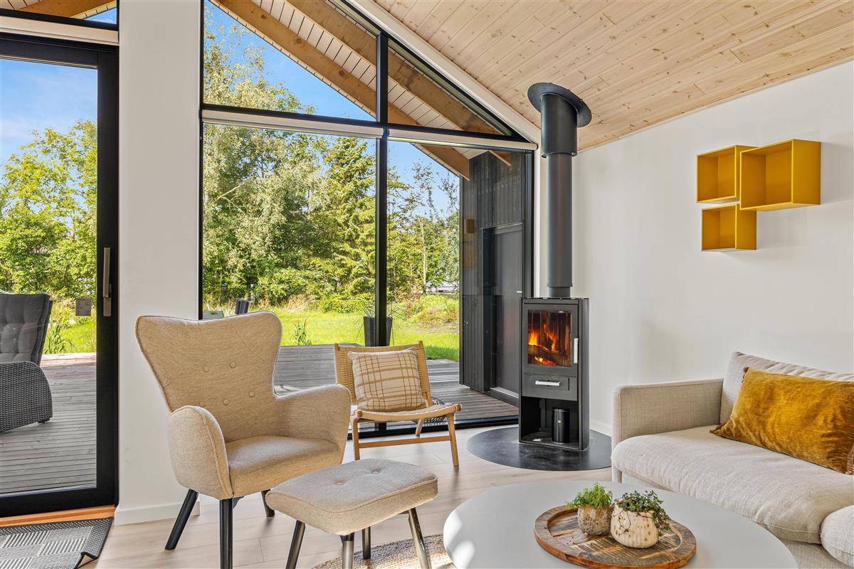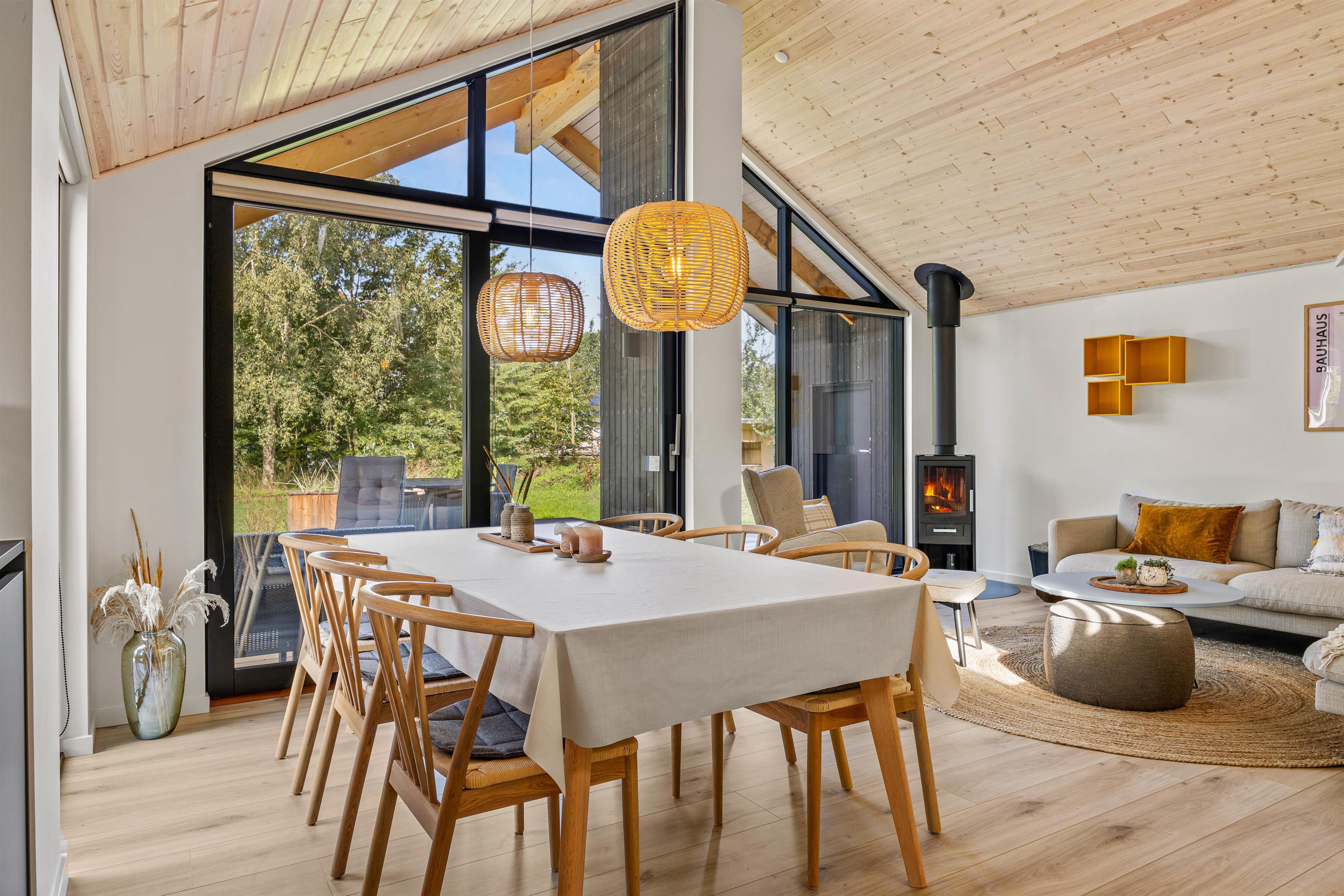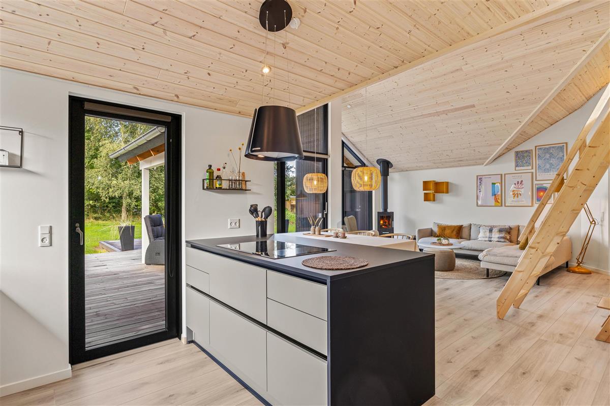 This holiday home accommodates up to 6 guests and 1 dog for an unforgettable holiday in stylish, modern surroundings - whatever the season. The subtle colours, numerous large windows and comfortable furniture create a beautiful spacious atmosphere. The large kitchen area allows you to spend time together, whether separately or sharing cosy moments. Prepare ingredients for a delicious barbecue, play board games at the dining table or settle down on the sofa with your favourite series, all while the warmth and comfort from the wood-burning stove spreads throughout the room. From the family room, you can access the loft where older children will love sleeping in their own little den. Here you'll find two single mattresses (90 x 200 cm).