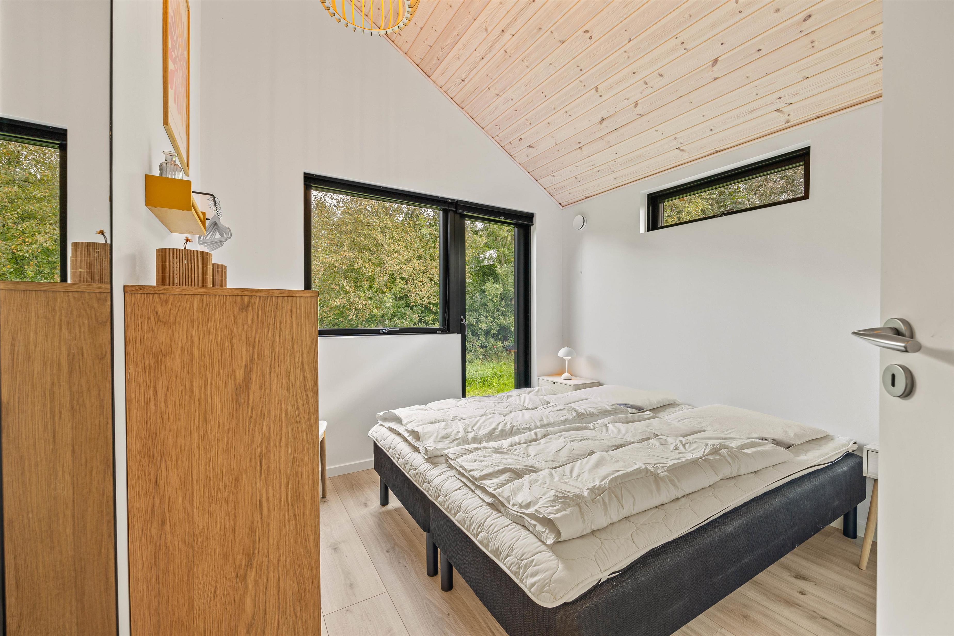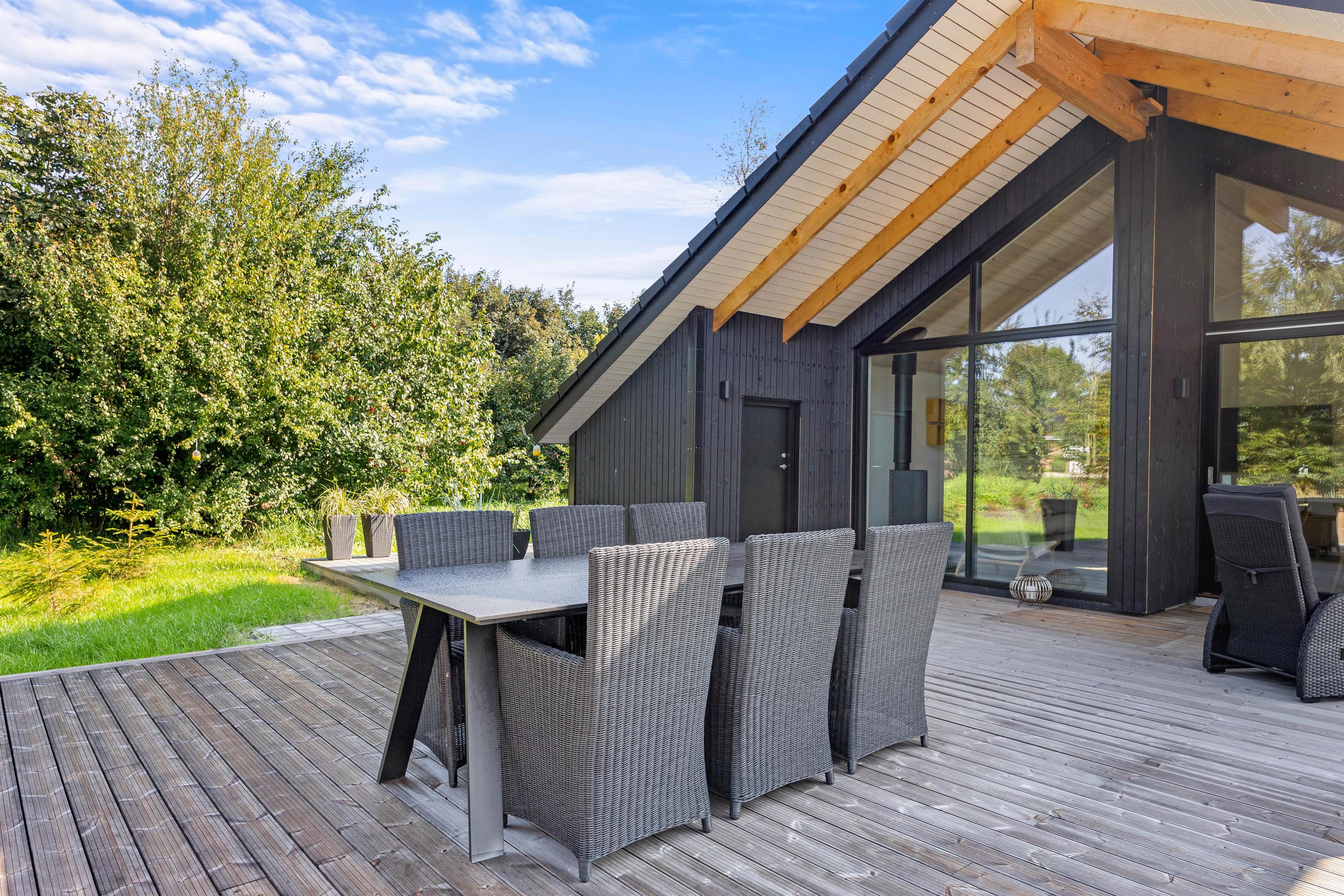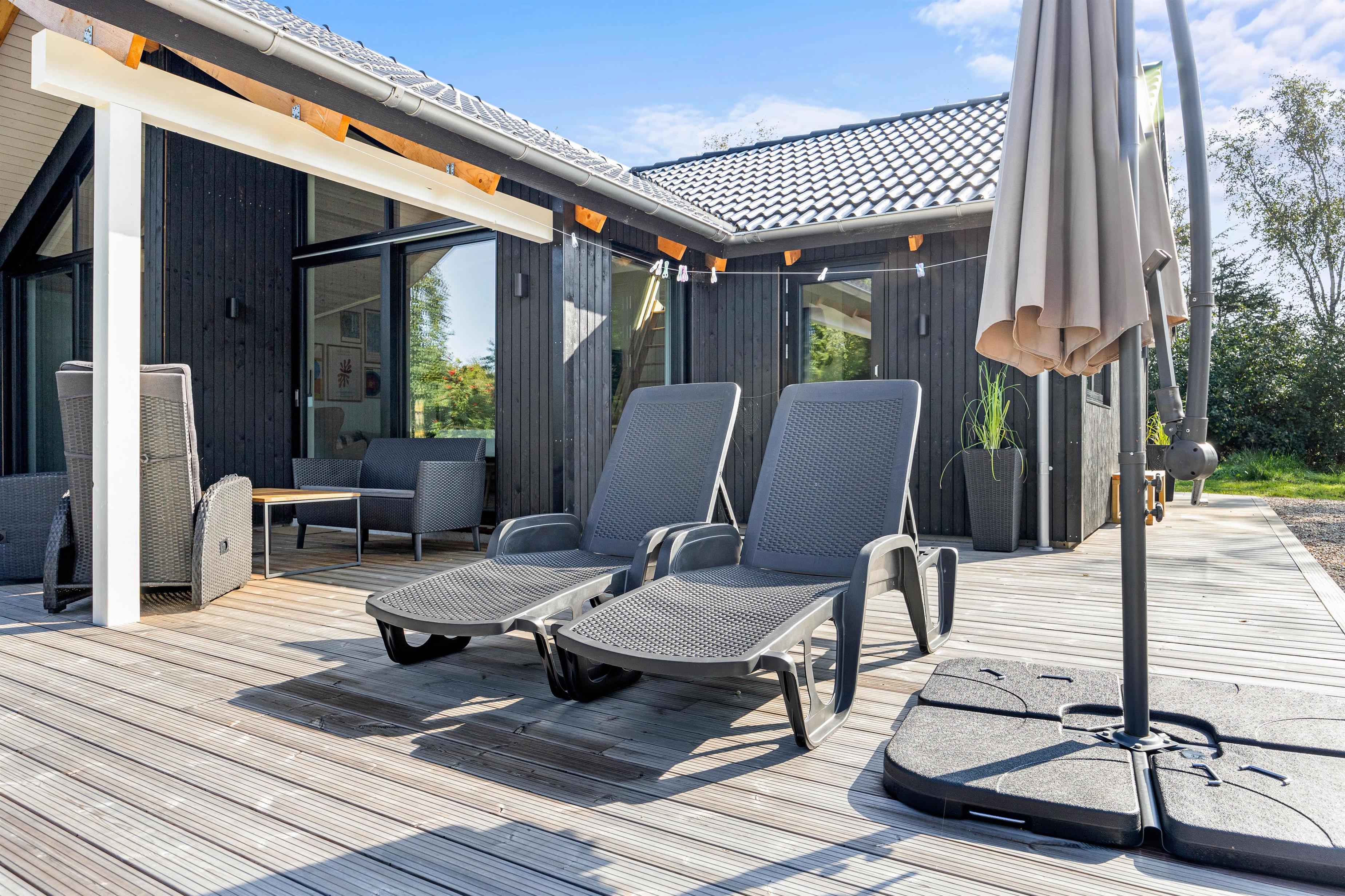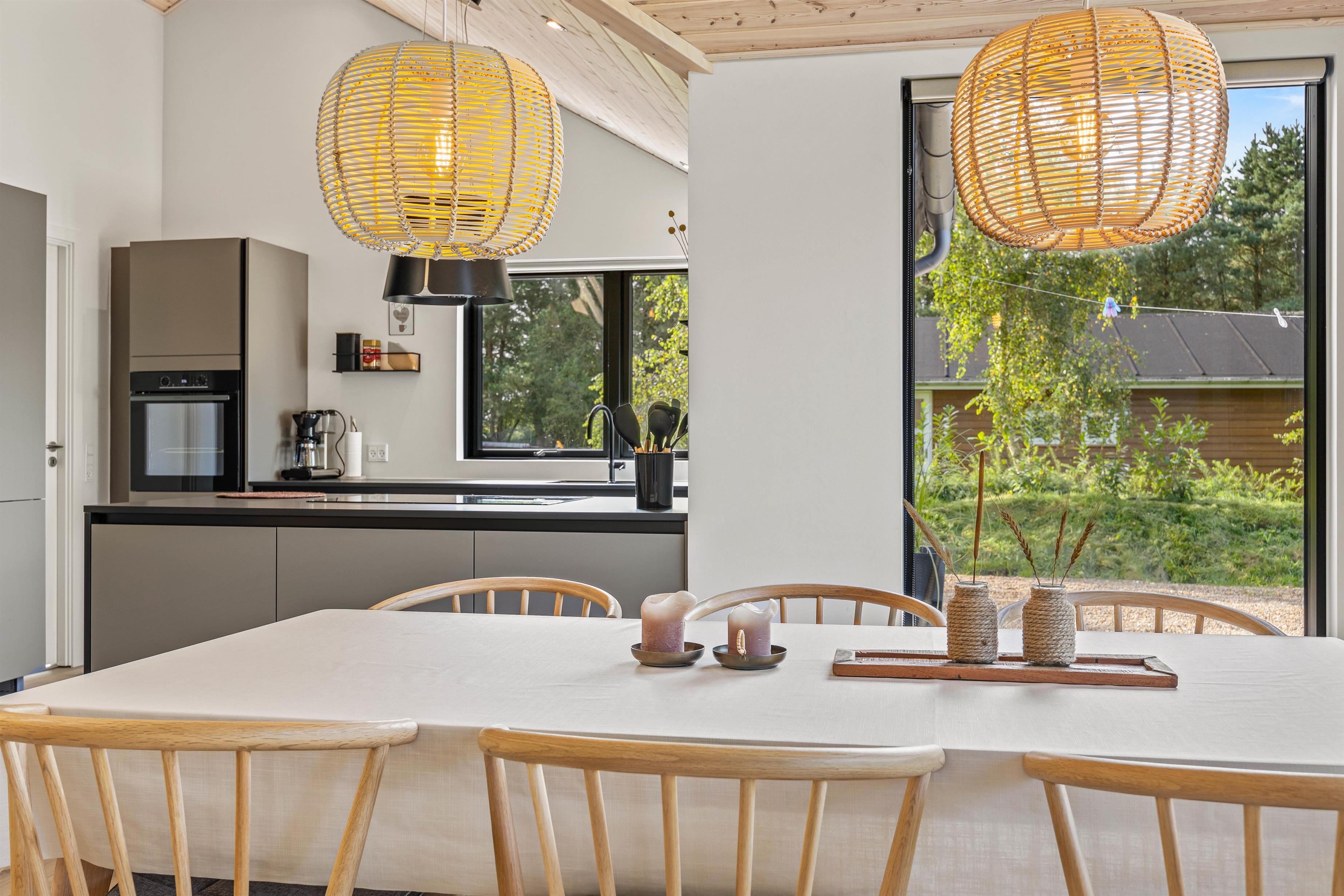 This holiday home accommodates up to 6 guests and 1 dog for an unforgettable holiday in stylish, modern surroundings - whatever the season. The subtle colours, numerous large windows and comfortable furniture create a beautiful spacious atmosphere. The large kitchen area allows you to spend time together, whether separately or sharing cosy moments. Prepare ingredients for a delicious barbecue, play board games at the dining table or settle down on the sofa with your favourite series, all while the warmth and comfort from the wood-burning stove spreads throughout the room. From the family room, you can access the loft where older children will love sleeping in their own little den. Here you'll find two single mattresses (90 x 200 cm).