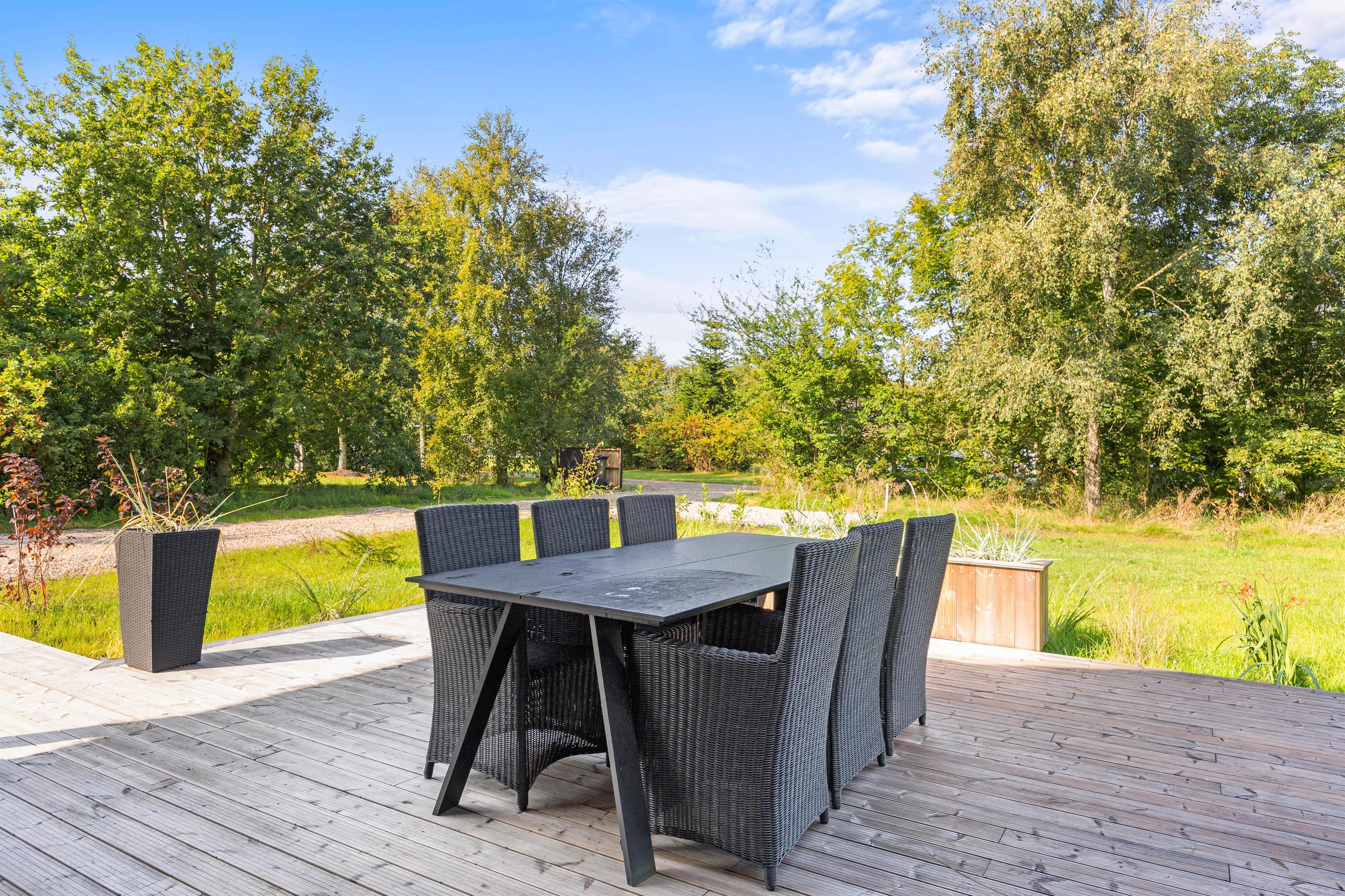 The large wooden terrace is beautiful and perfect for many pleasant hours in the sun. Part of the terrace is covered, offering shade and a lovely spot to enjoy your morning coffee whilst overlooking the large natural grounds where your dog can run freely.