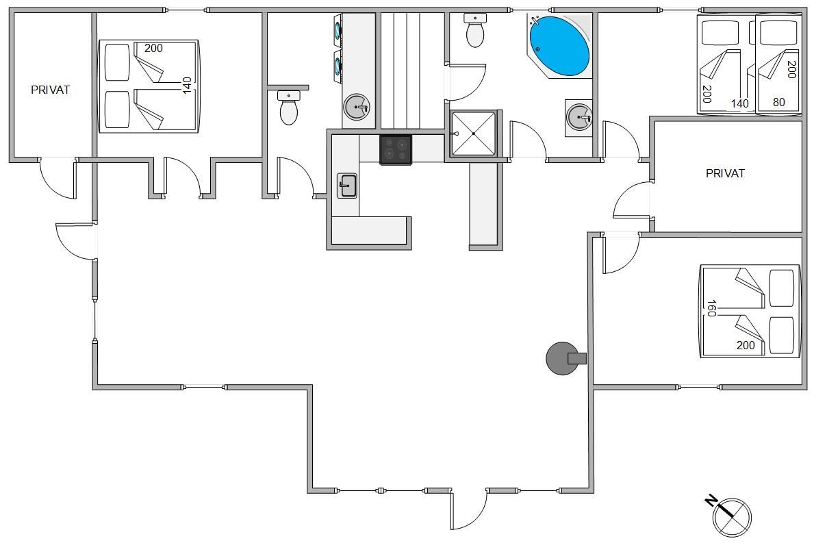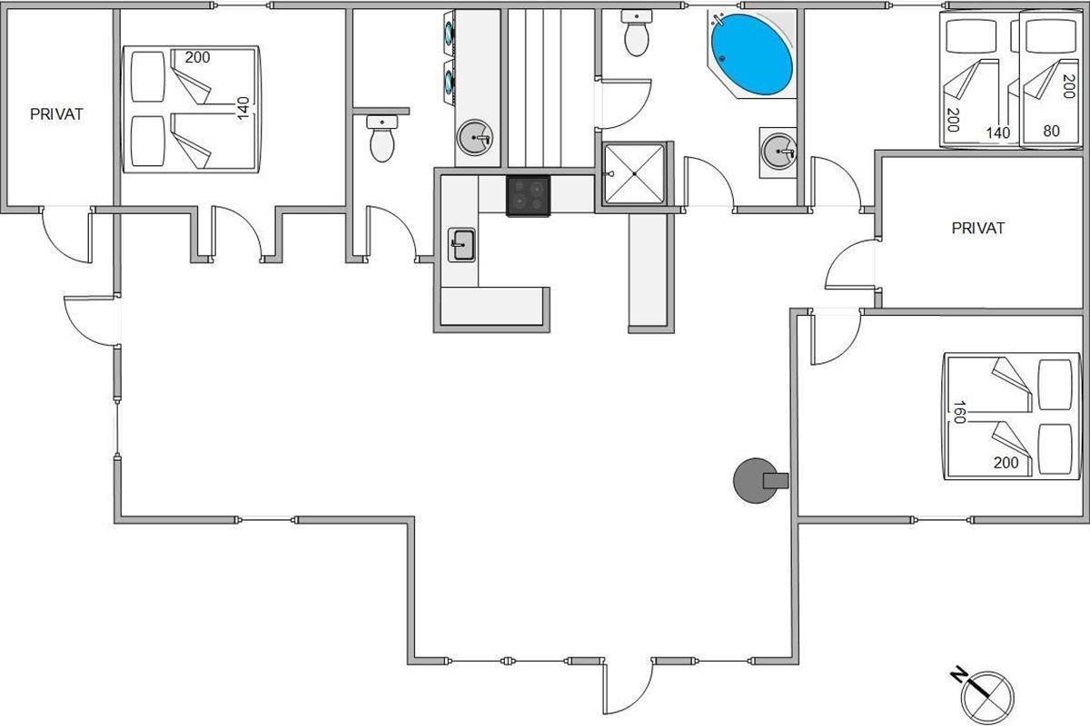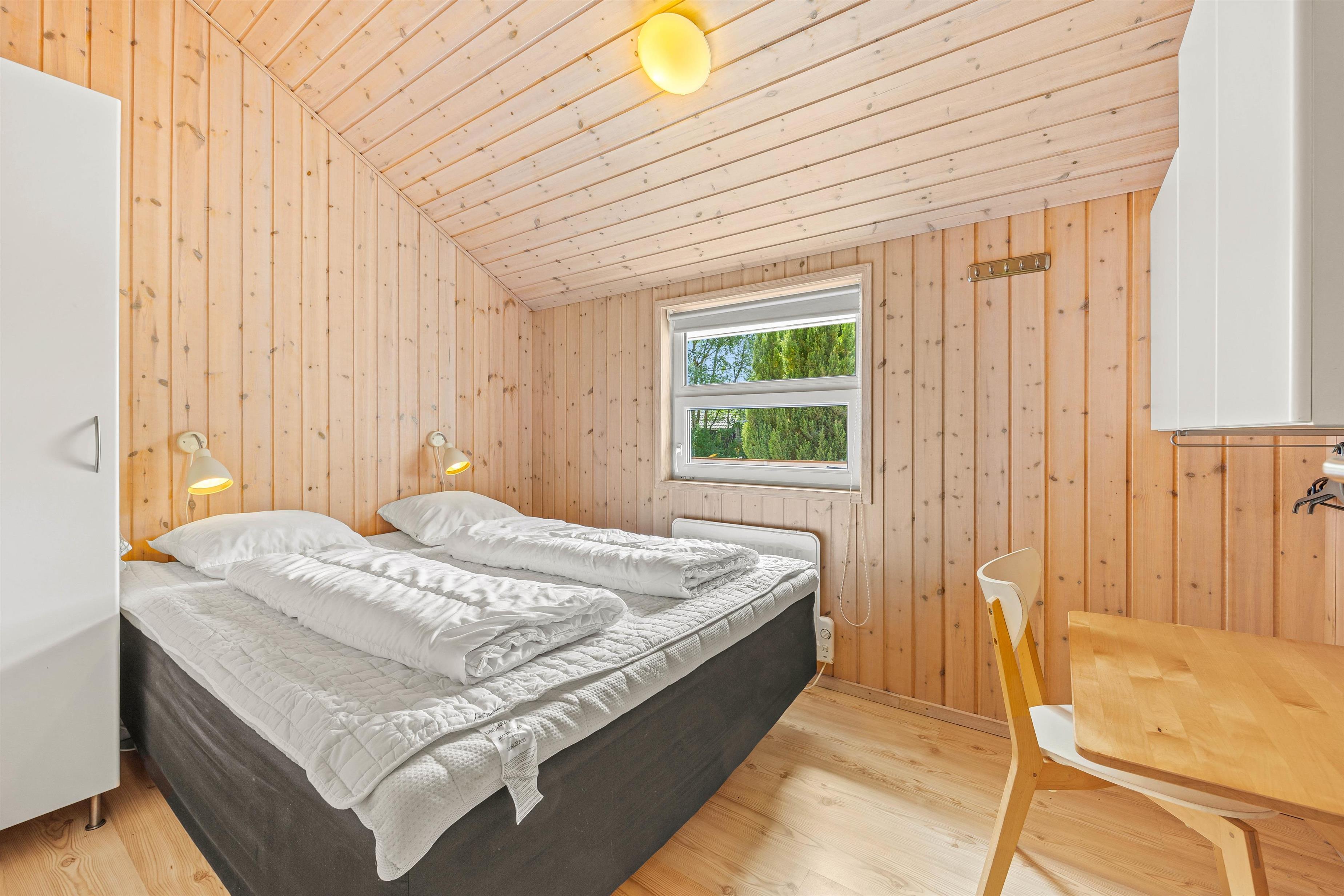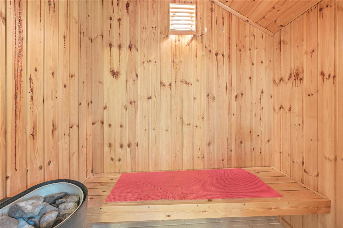 The holiday home's three bedrooms each feature a double bed. The bathroom includes underfloor heating, a sauna and a whirlpool where you can relax and unwind. The separate guest toilet is particularly convenient for quick hand washing or ensuring more privacy when the house is fully occupied, reducing pressure on the main bathroom.