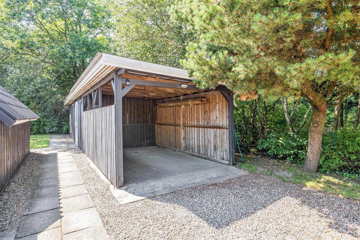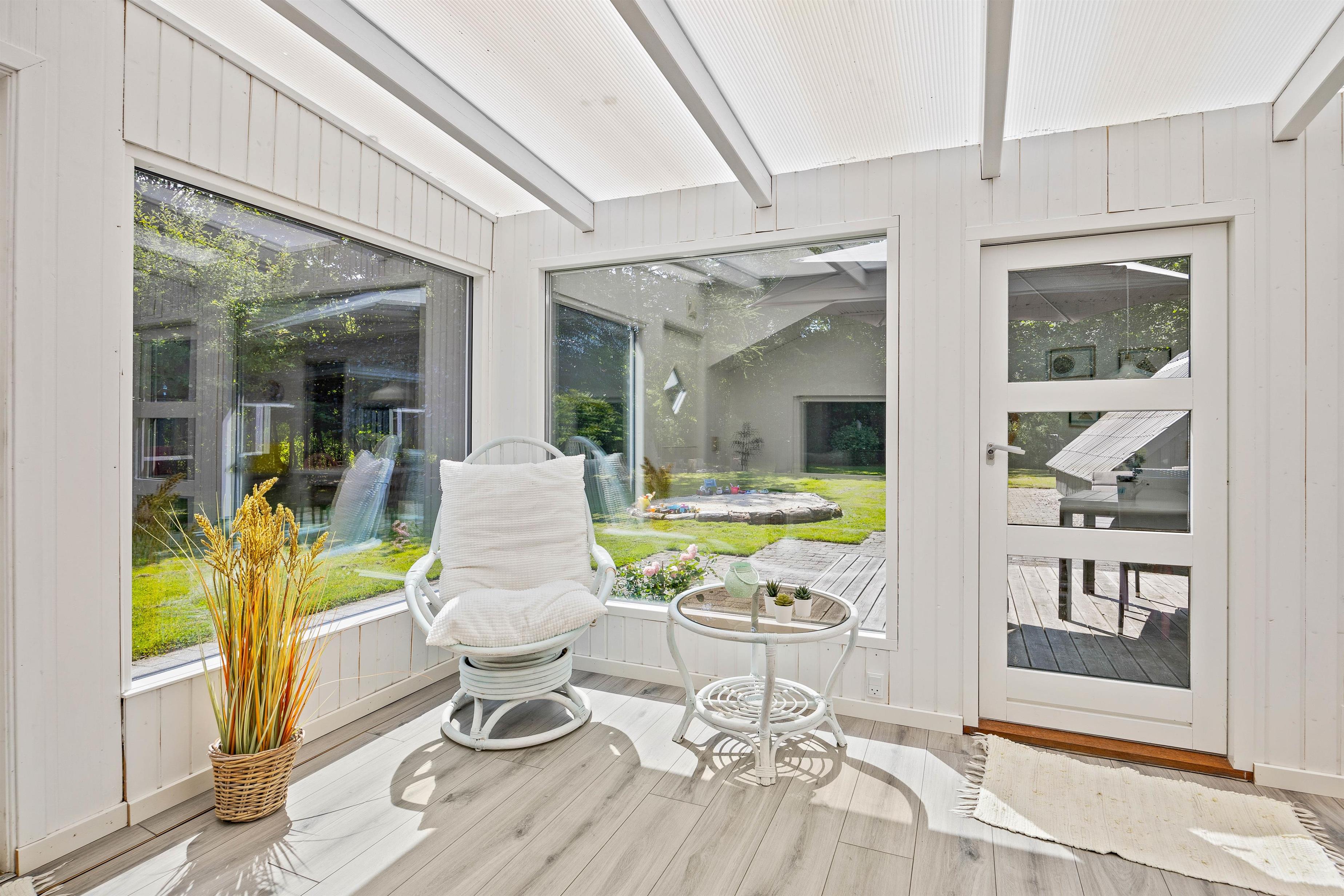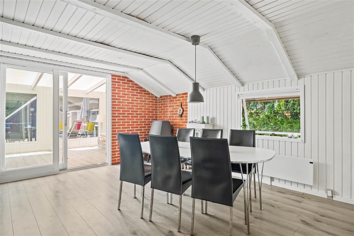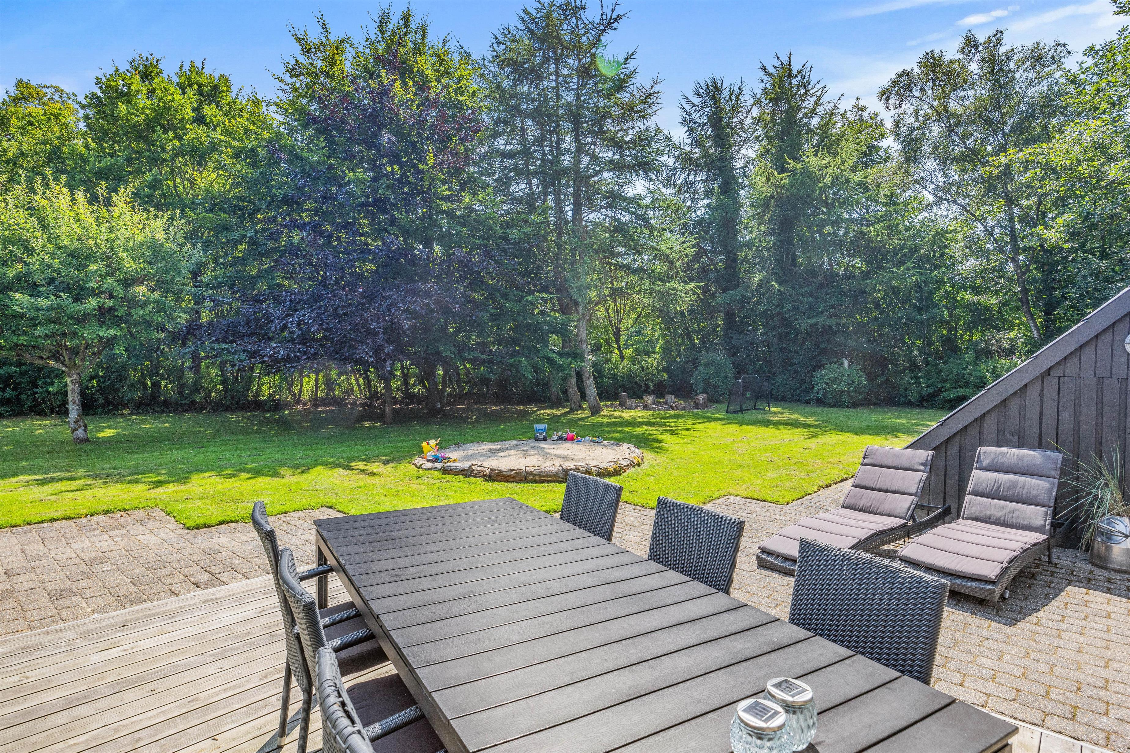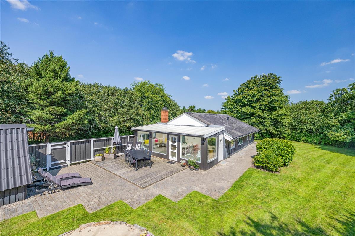 The outdoor area at Blomstervangen 8 in Jegum Ferieland is a nature lover's paradise, offering numerous opportunities to spend time outdoors. The generous lawn provides plenty of space for children and dogs to play, while you can relax on either the open terrace or the sheltered and enclosed terraces. Whether sunbathing, enjoying a BBQ evening, or having a peaceful breakfast outdoors - everyone will find their favourite spot.