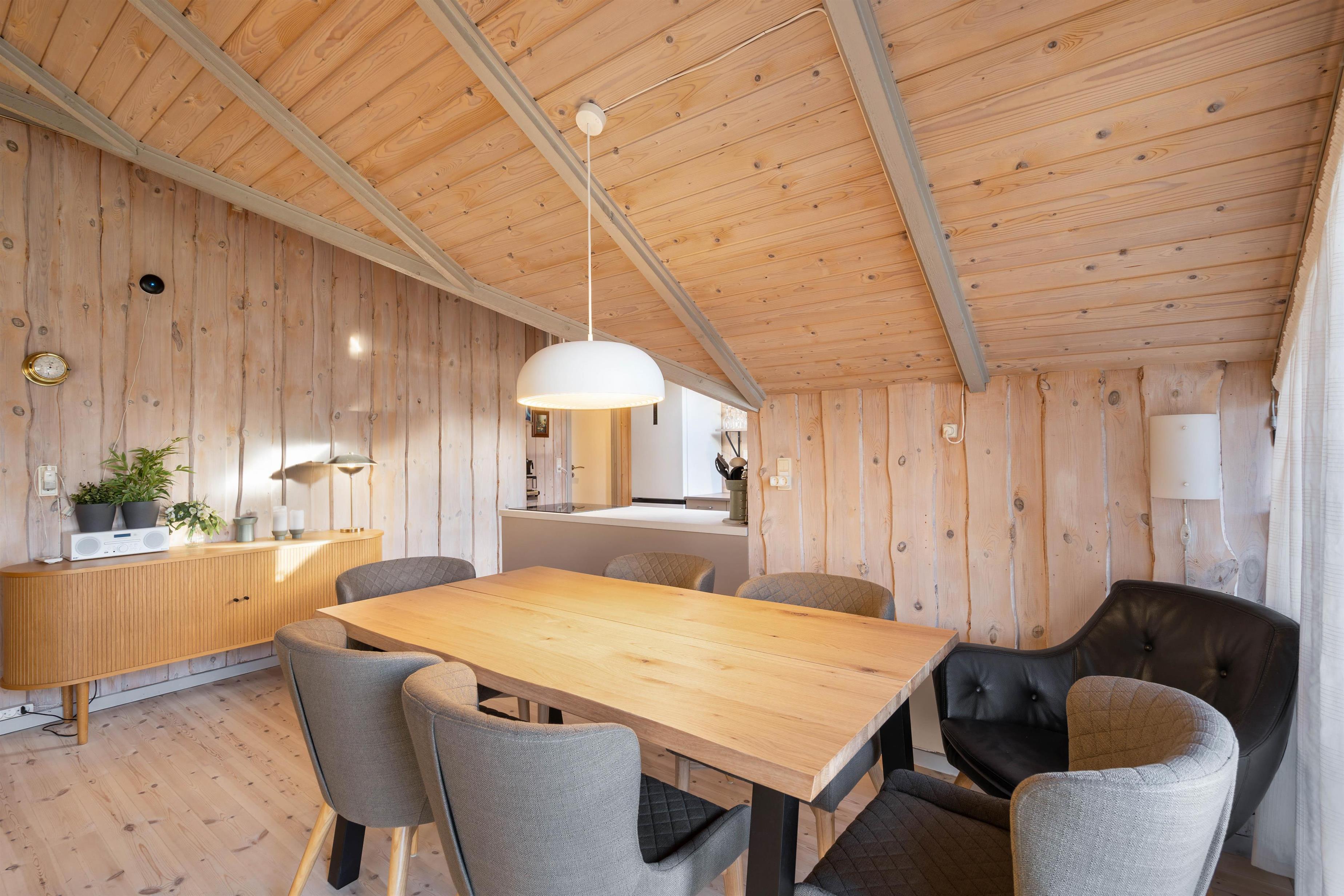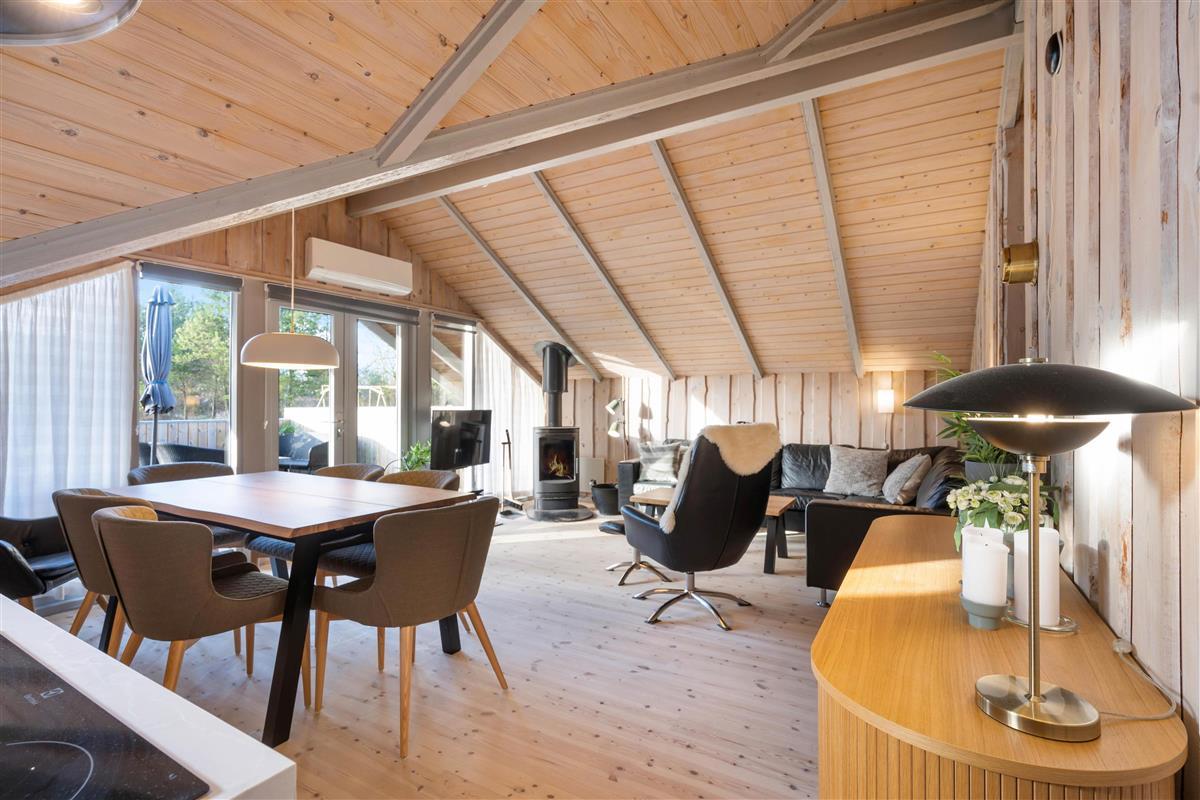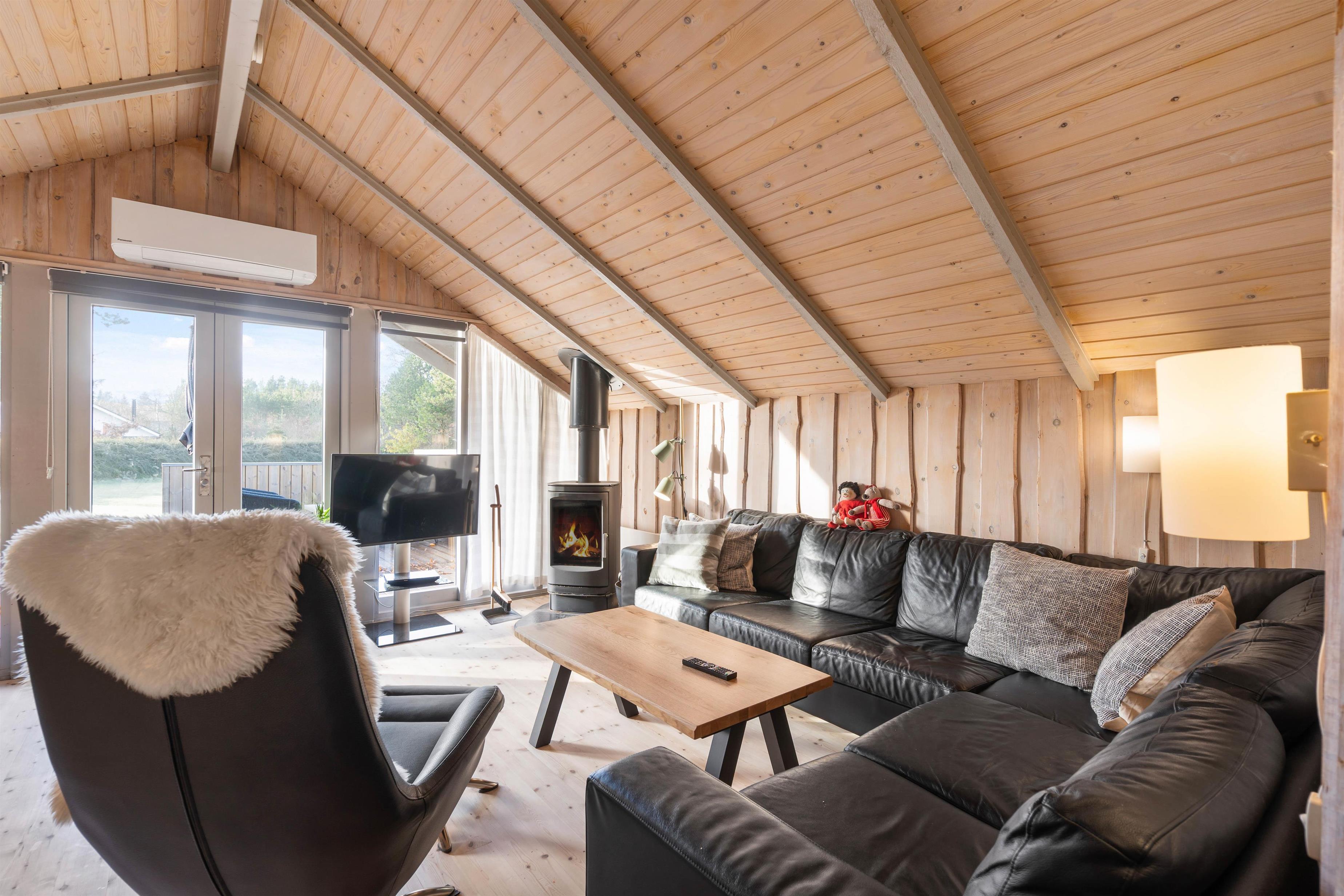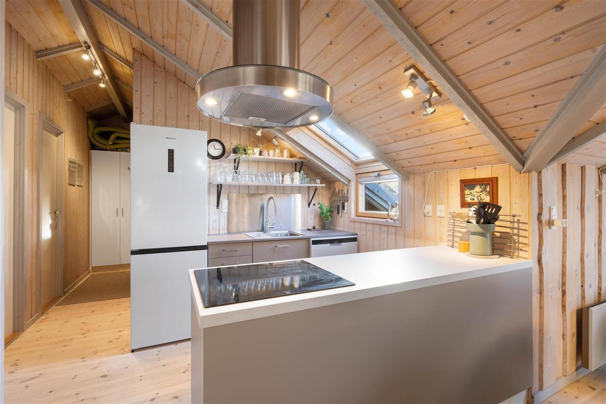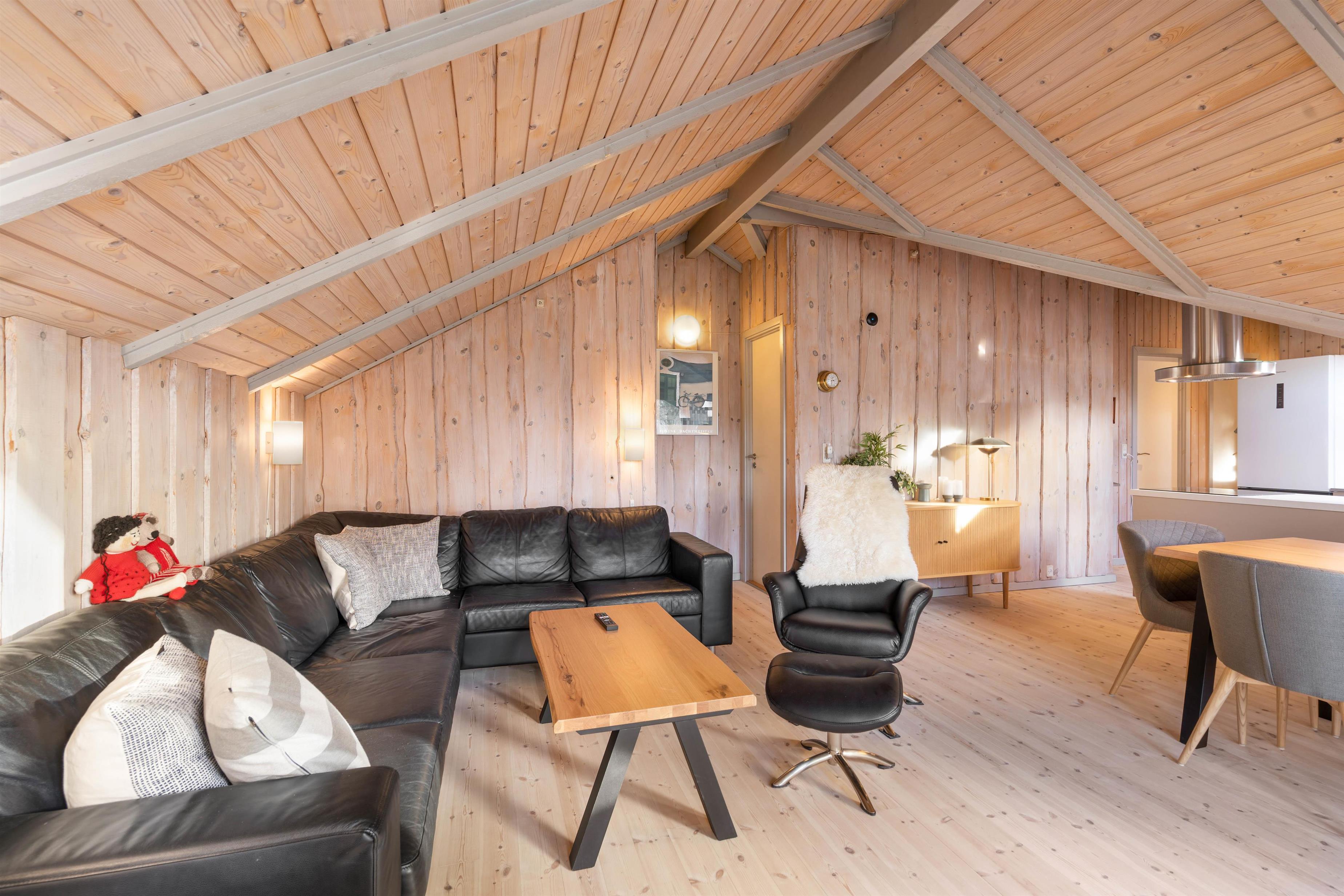 At Nordskrænten 28, you'll find a cosy atmosphere that invites you to linger. A wood-burning stove provides welcome warmth and a comfortable ambiance on cooler evenings. Here you can spend relaxing hours reading a book, watching television, or enjoying sociable game nights with family or friends. The kitchen seamlessly integrates into the living and dining area and features a dishwasher to make cleaning up after cooking easier.