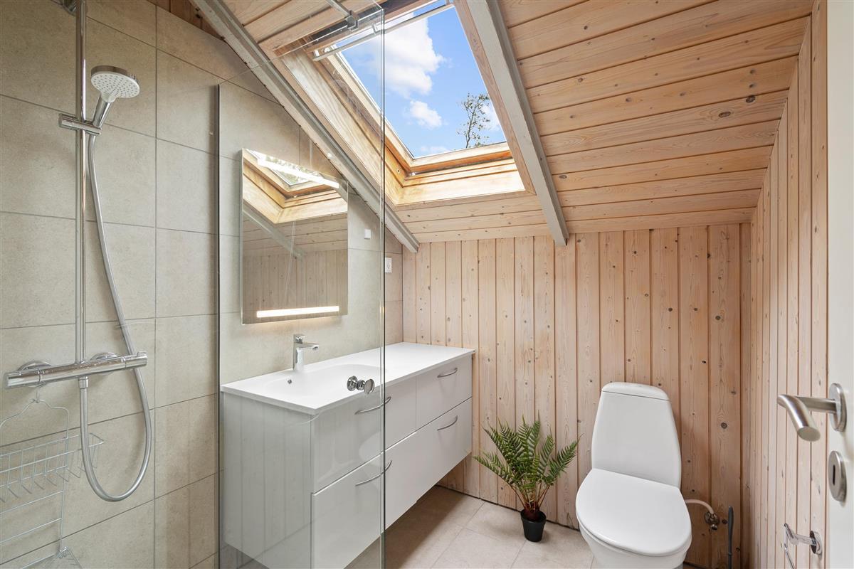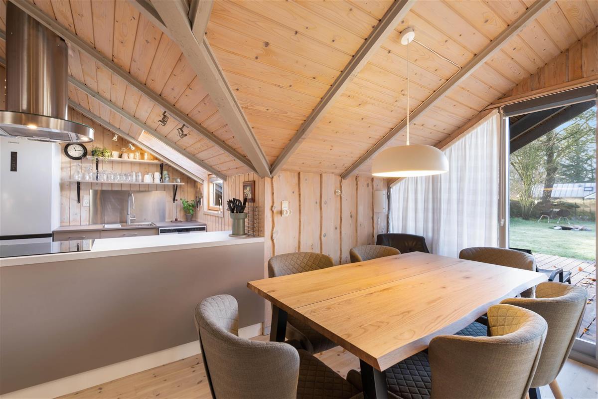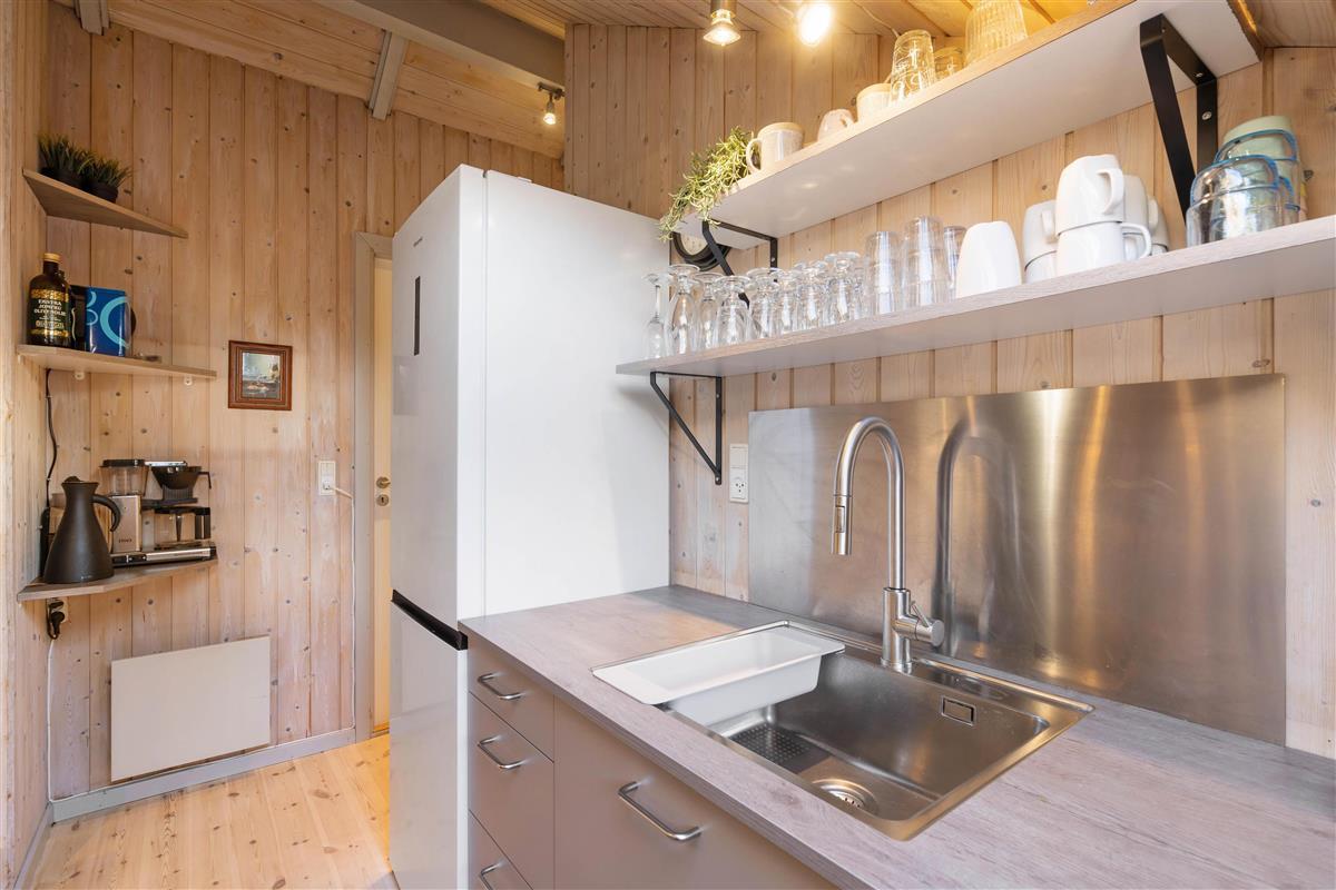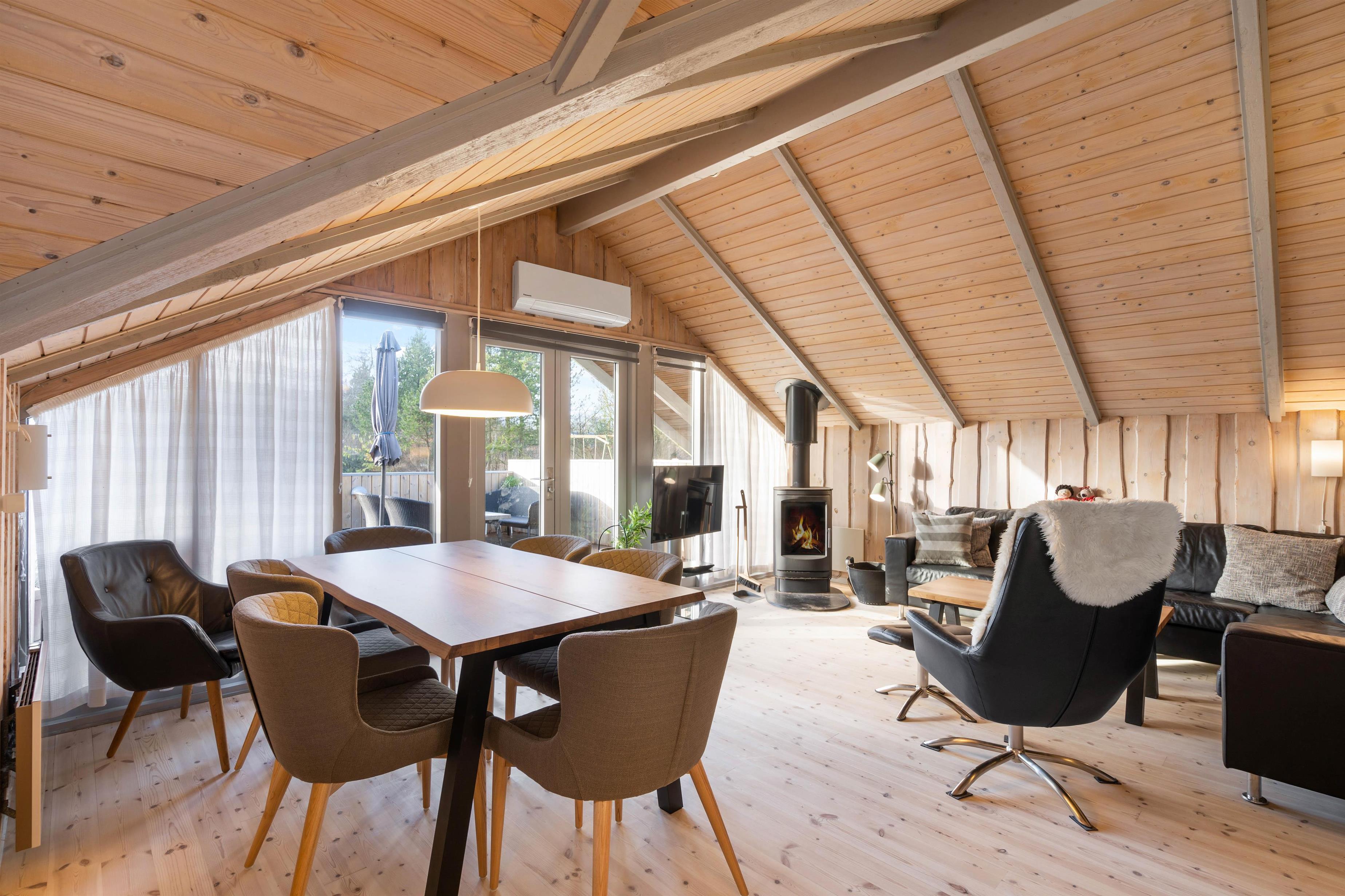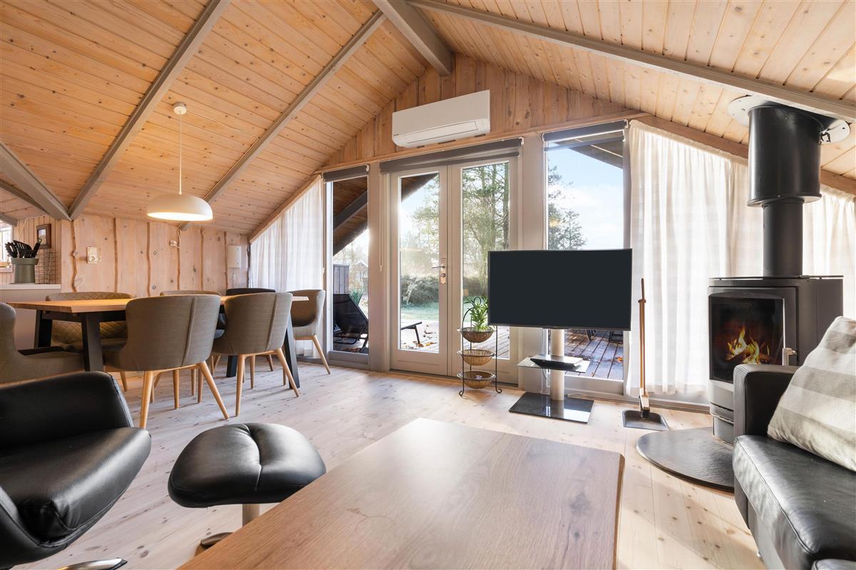 At Nordskrænten 28, you'll find a cosy atmosphere that invites you to linger. A wood-burning stove provides welcome warmth and a comfortable ambiance on cooler evenings. Here you can spend relaxing hours reading a book, watching television, or enjoying sociable game nights with family or friends. The kitchen seamlessly integrates into the living and dining area and features a dishwasher to make cleaning up after cooking easier.