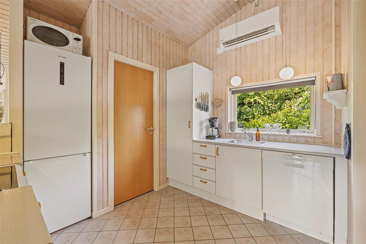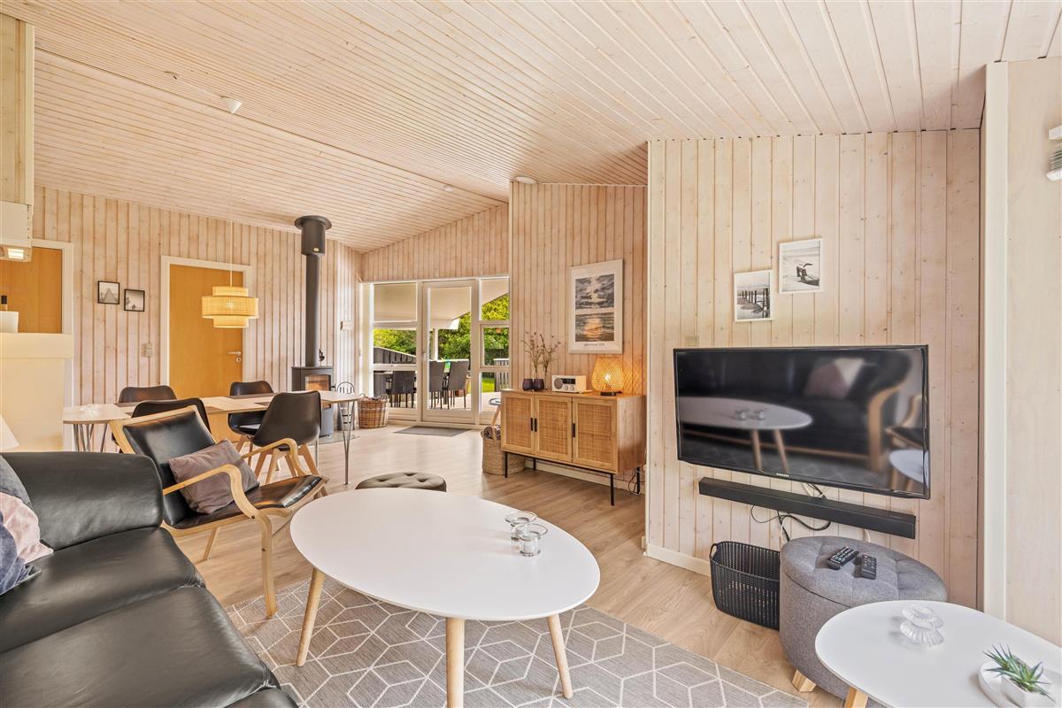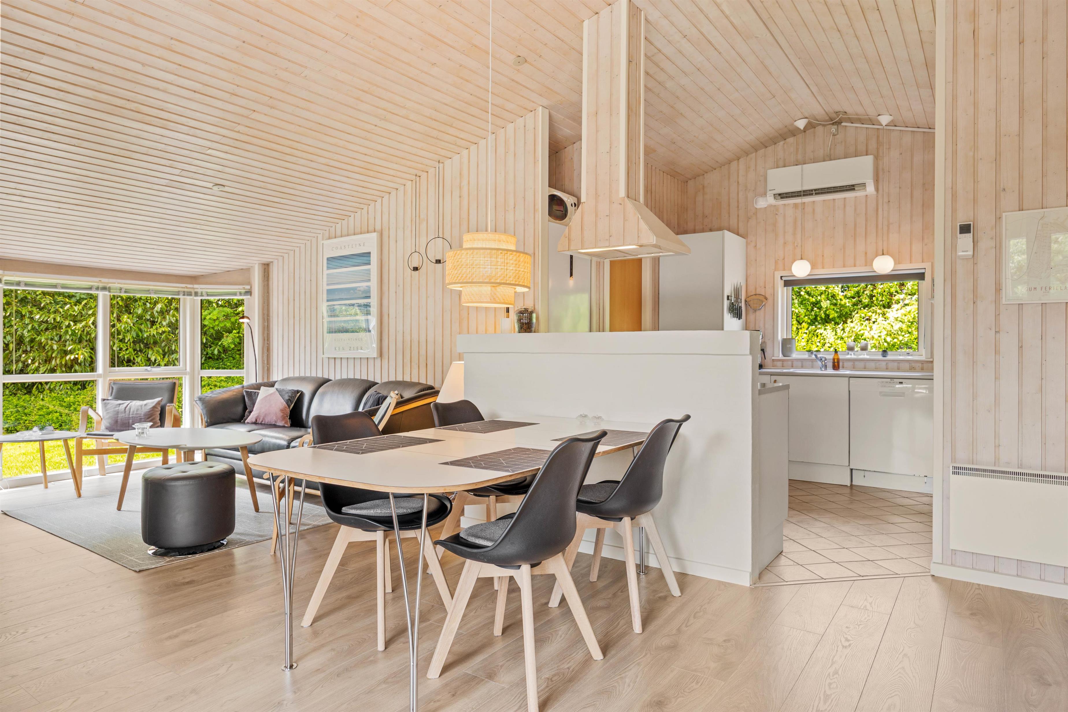 The wood-burning stove forms the heart of the holiday home, providing cosy warmth on cool evenings. Alternatively, you can use the energy-efficient air-to-air heat pump. The well-equipped kitchen with dishwasher invites you to prepare delicious meals with your loved ones. The open-plan living, dining and kitchen area creates a sociable and welcoming atmosphere with seamless transitions between spaces, allowing you to cook, dine and relax together without feeling separated.
