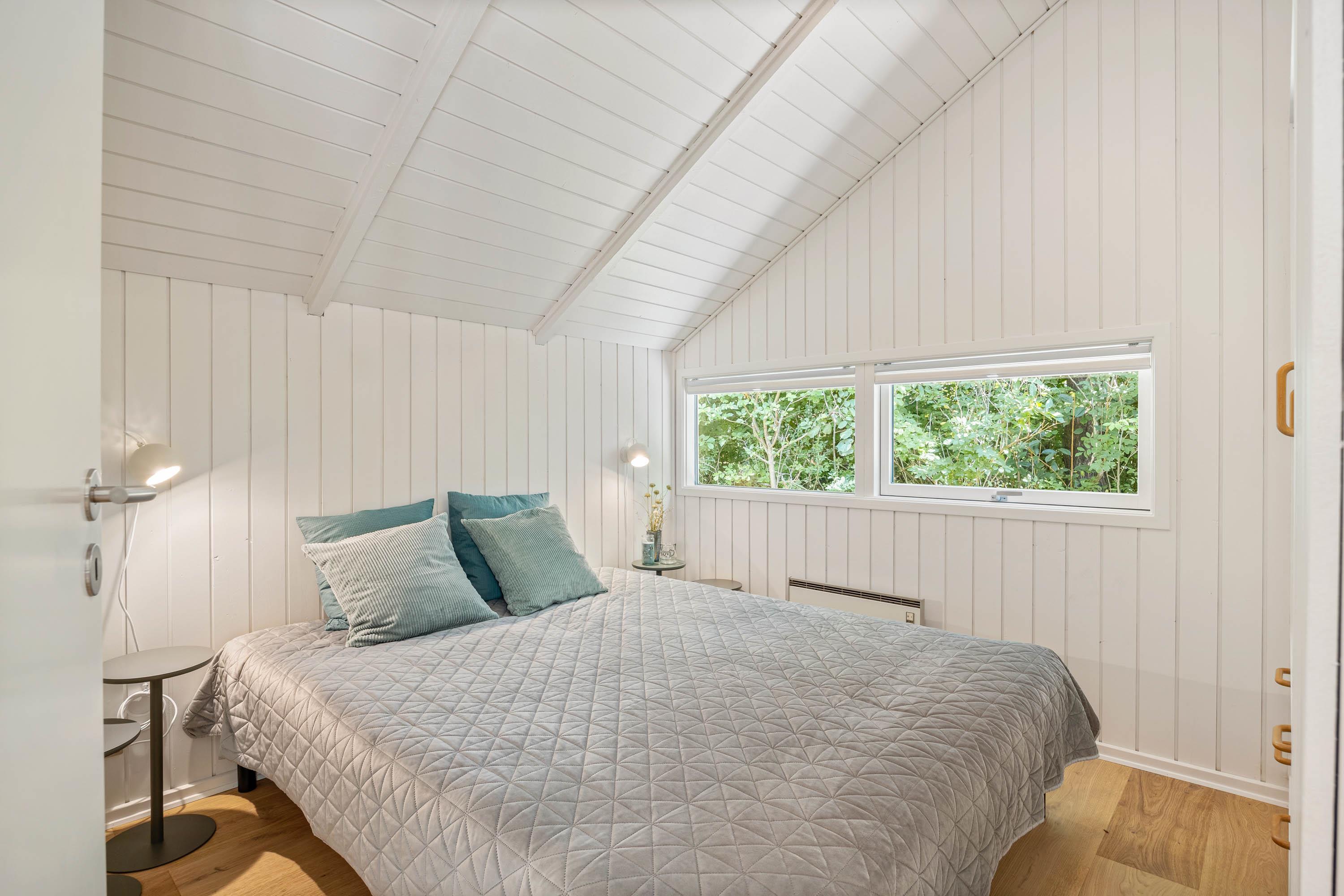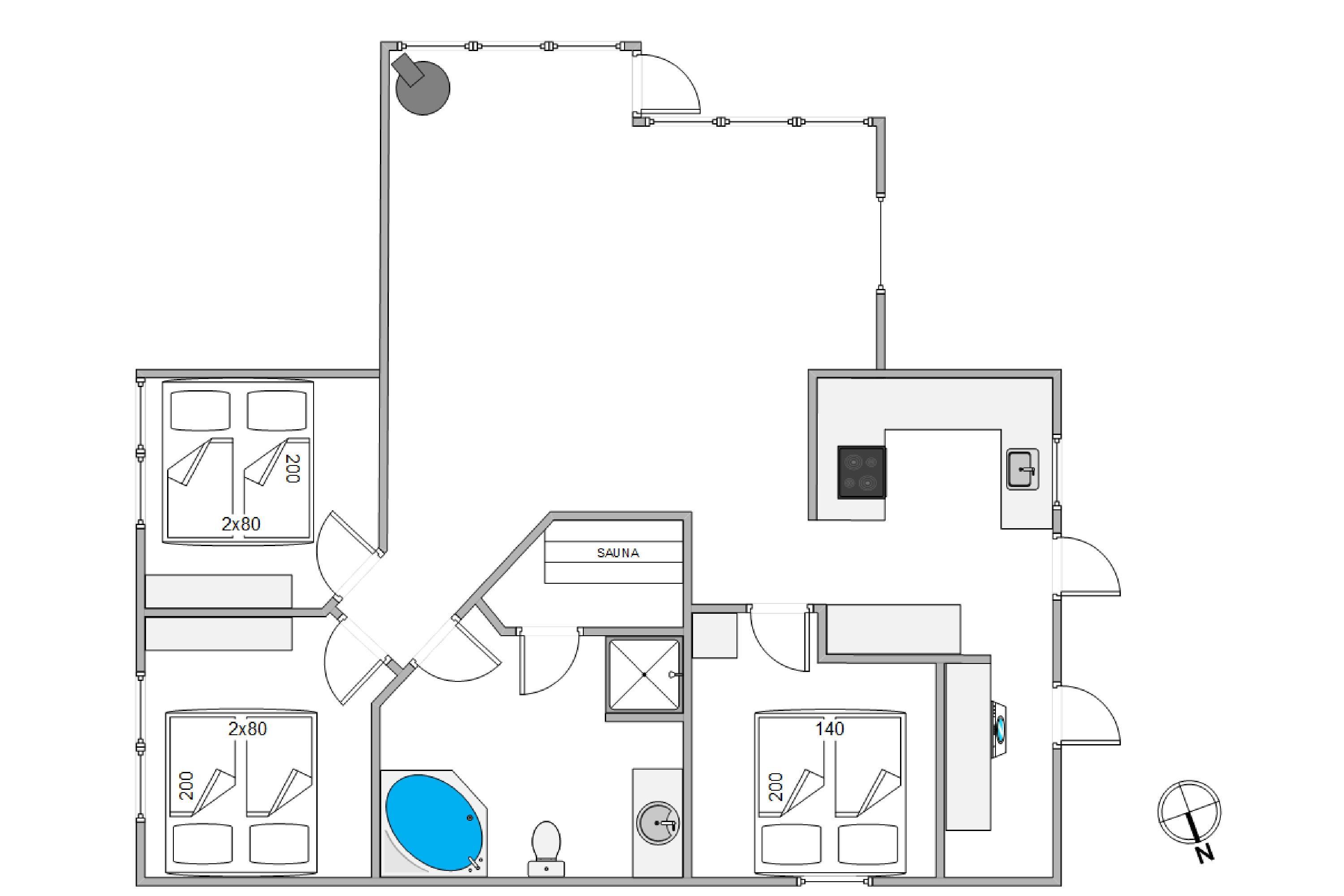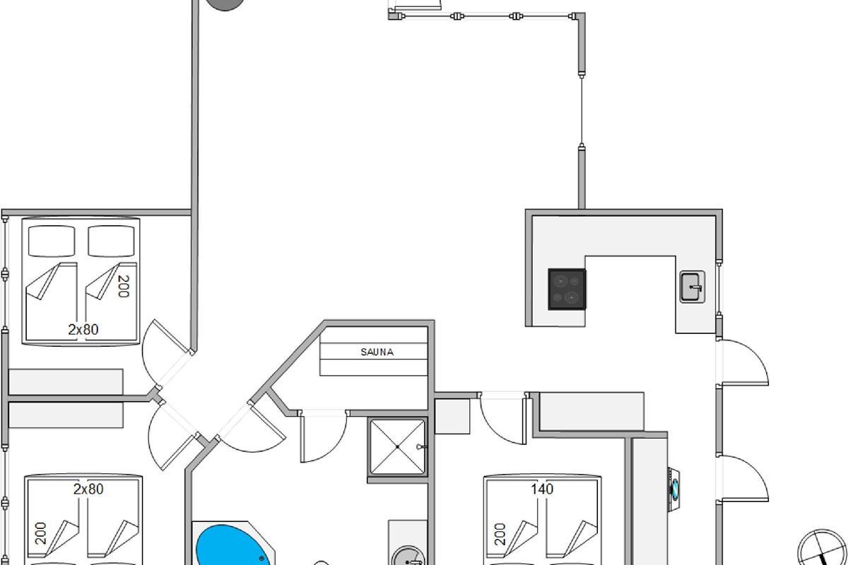 The holiday home at Fyrrelunden 40 features three bedrooms: two with double beds and a third with twin beds. For added comfort, the bathroom is equipped with underfloor heating, and after a long day of activities, there's nothing better than relaxing in the private sauna or unwinding in the two-person hot tub.