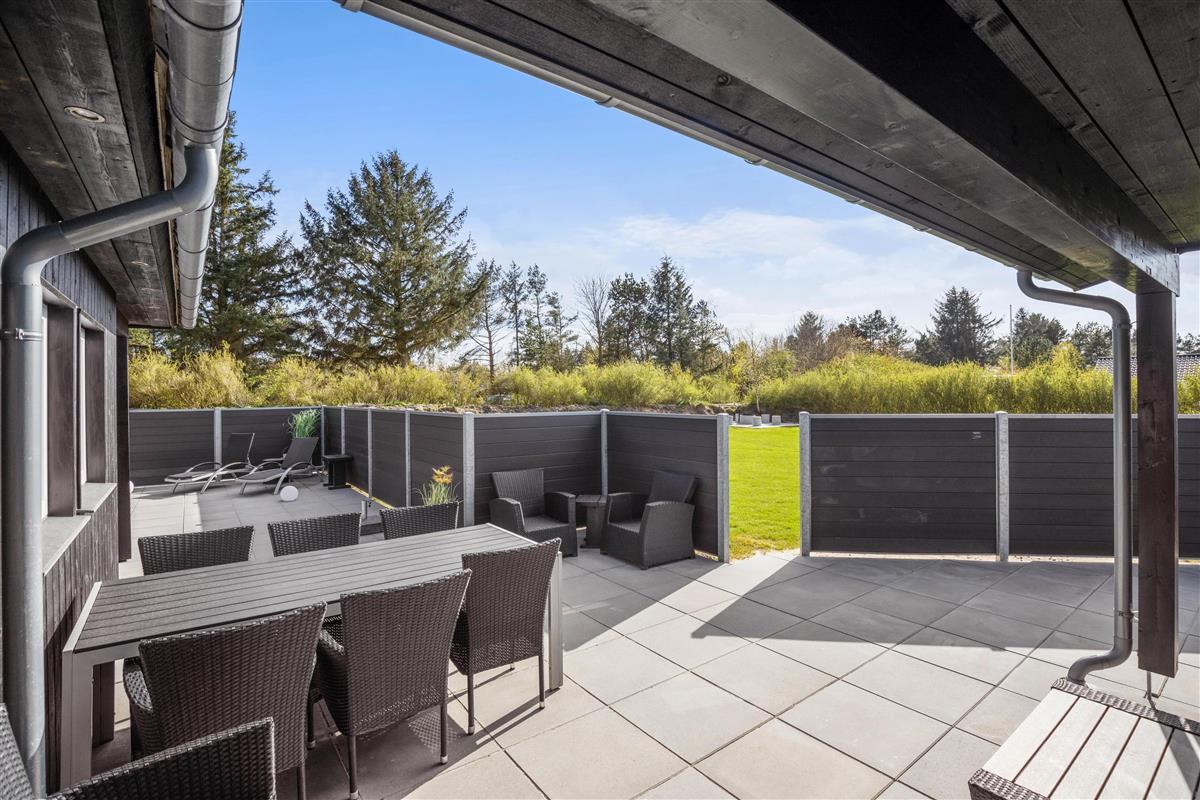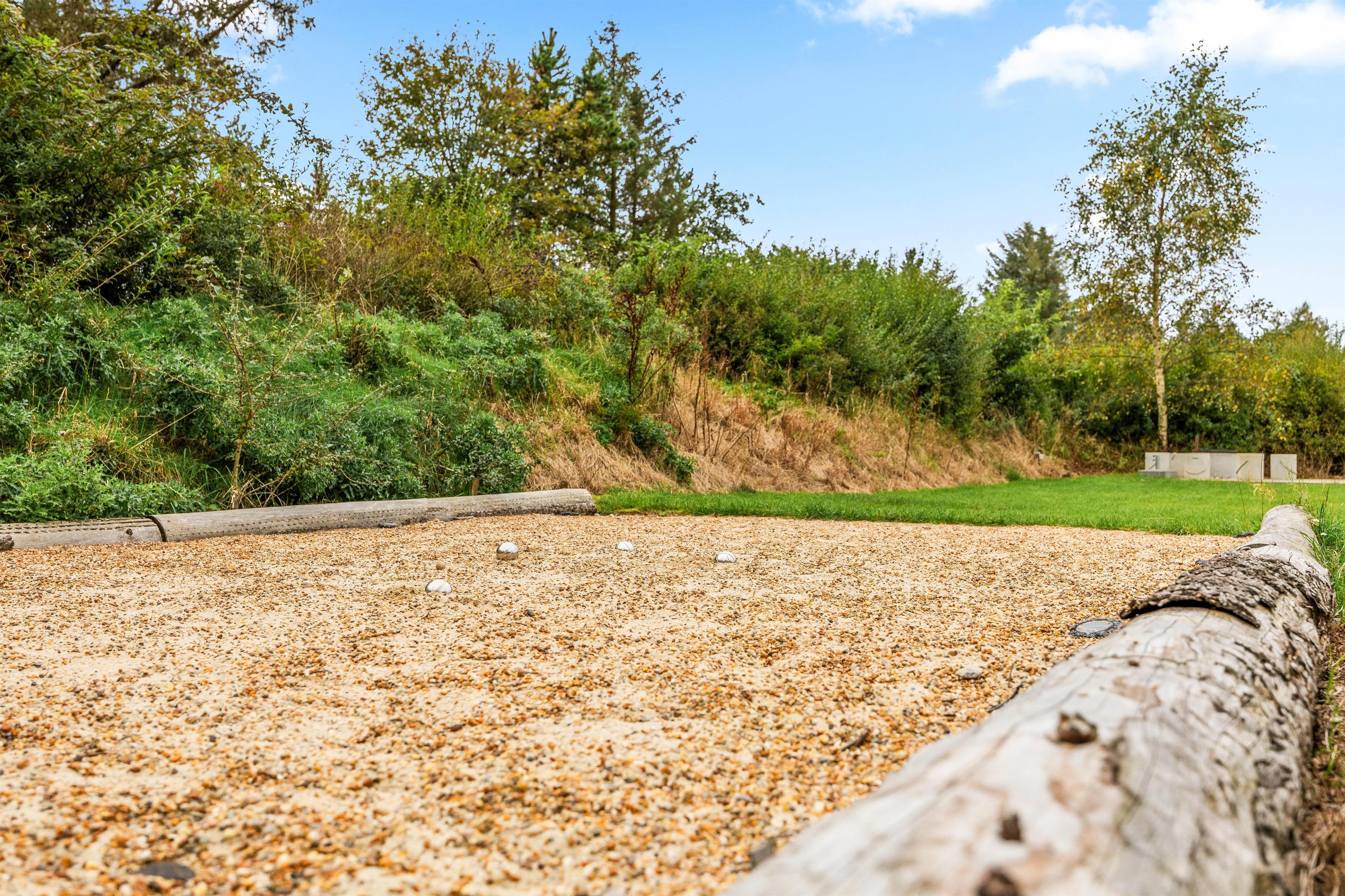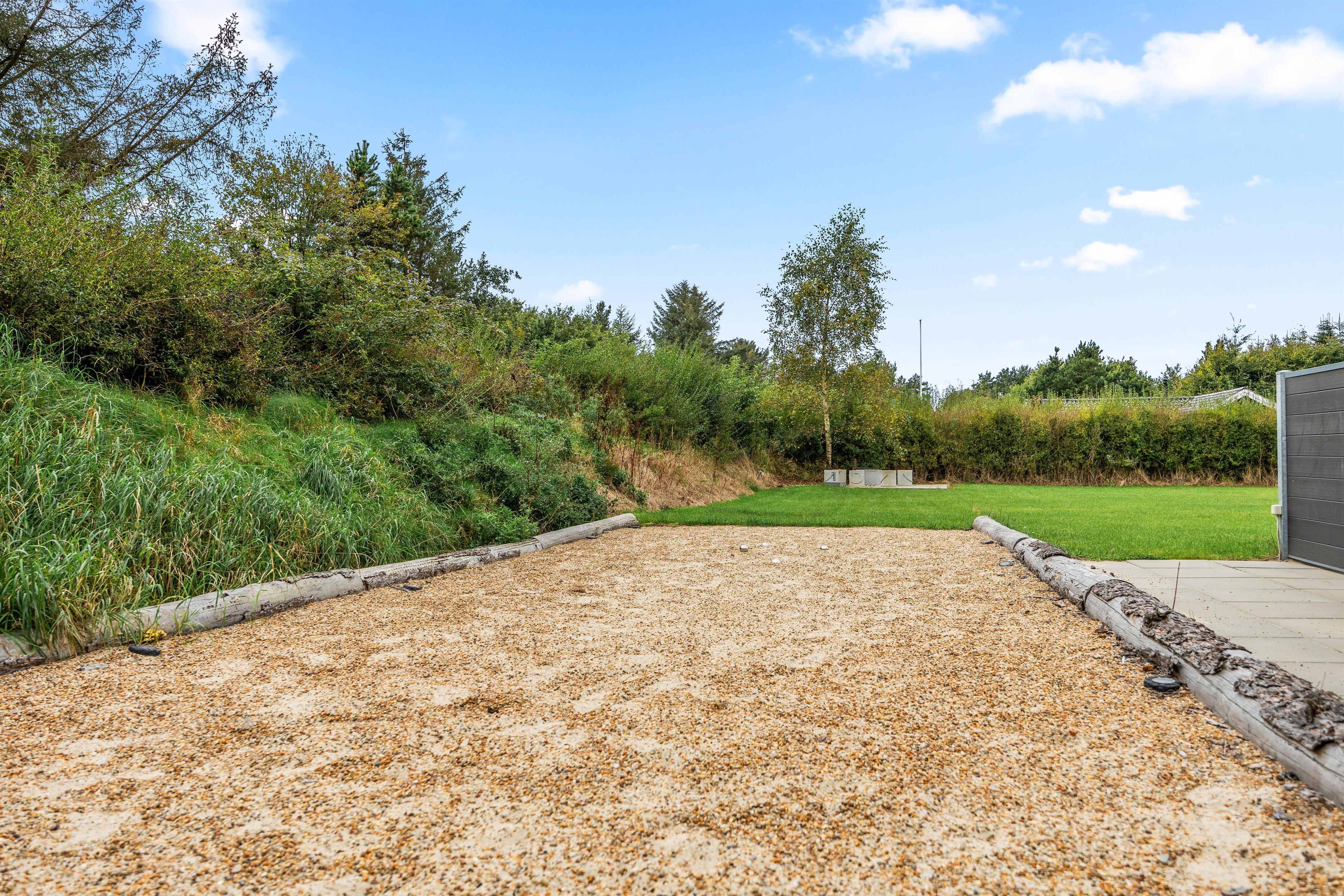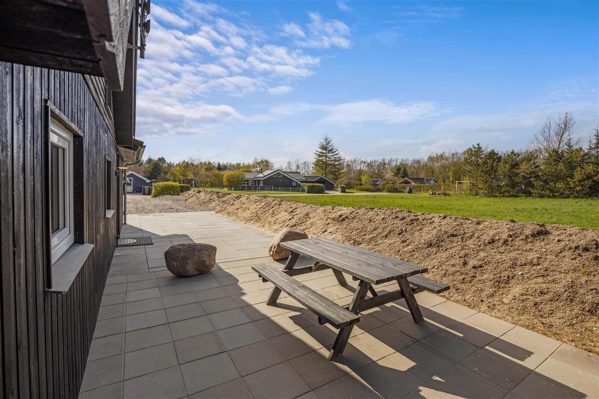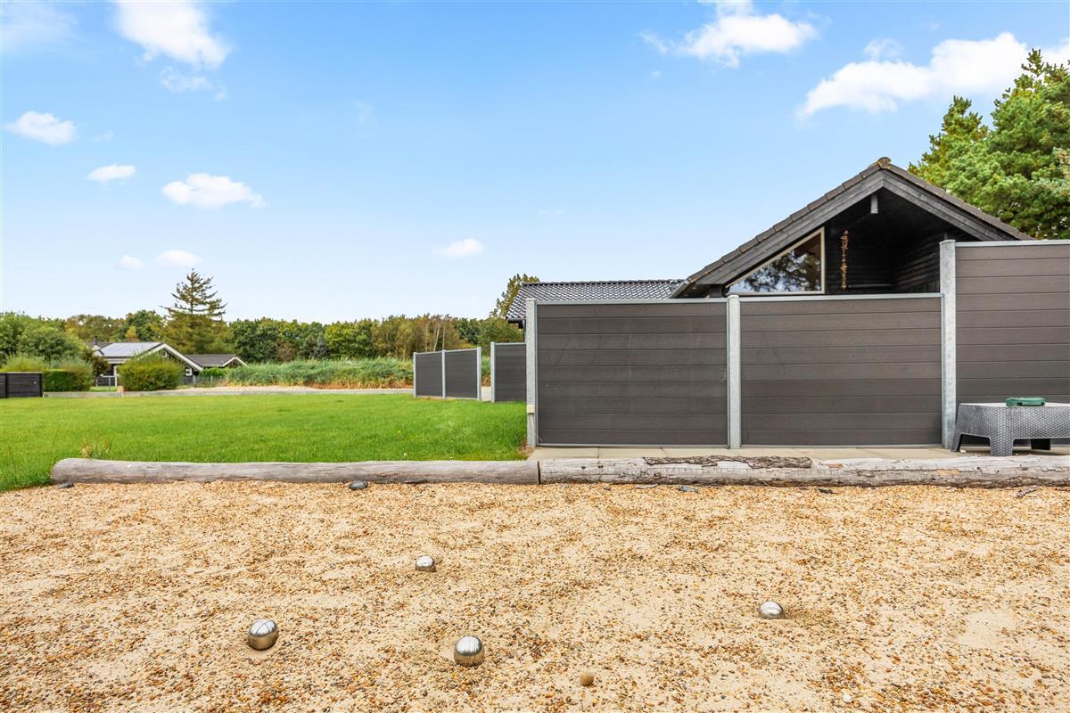 The natural grounds of the holiday home at Blomstervangen 70 provide plenty of space for children to play and adults to relax. The boccia court is ready for one game or another. On the private terrace, which offers undisturbed outdoor moments, you can enjoy your morning coffee or end the day with a lovely barbecue. During changeable weather, you can retreat to the covered terrace section.