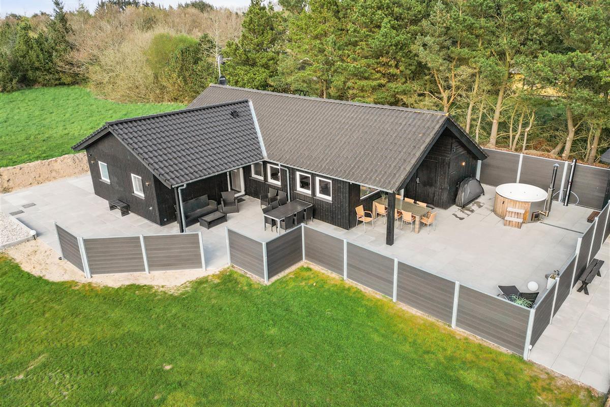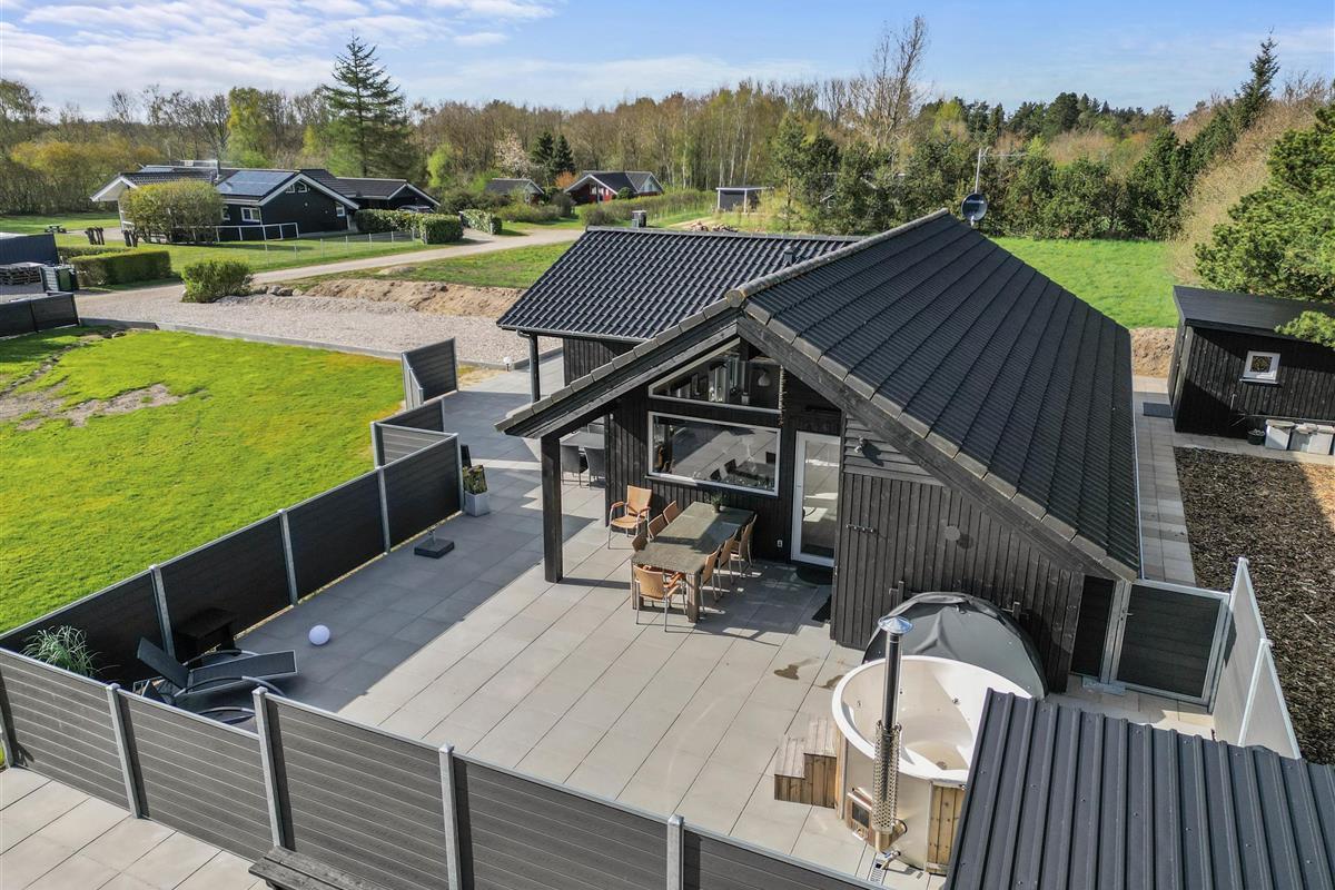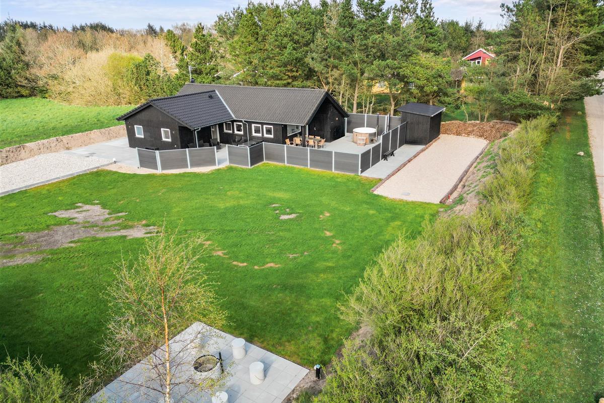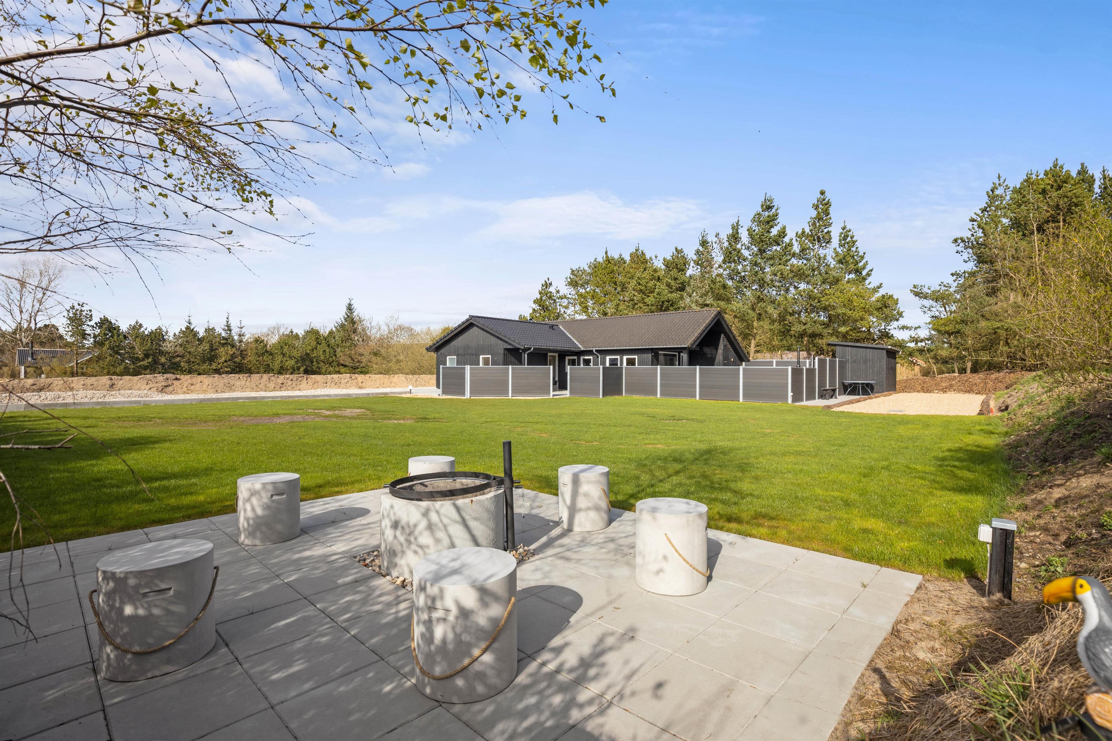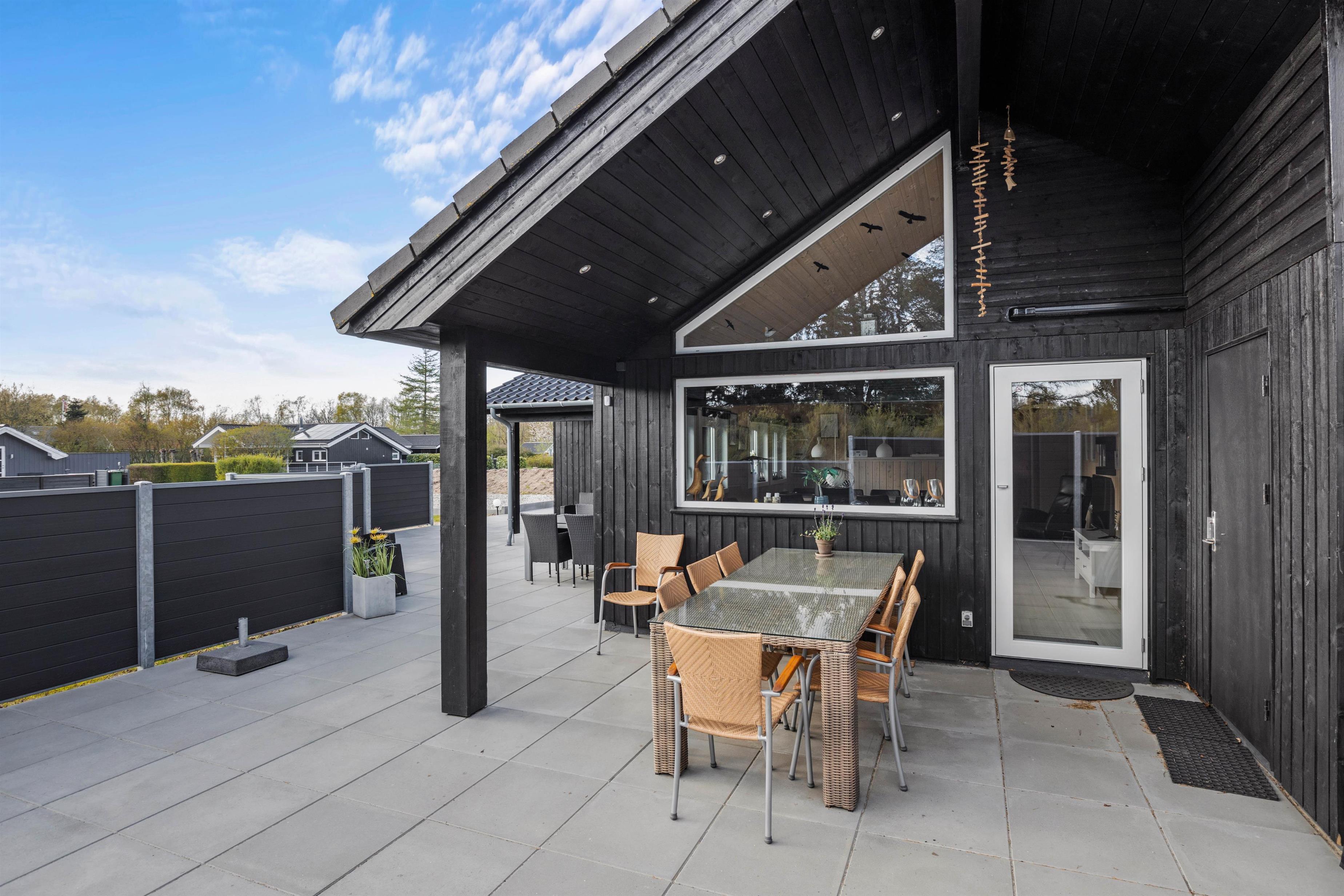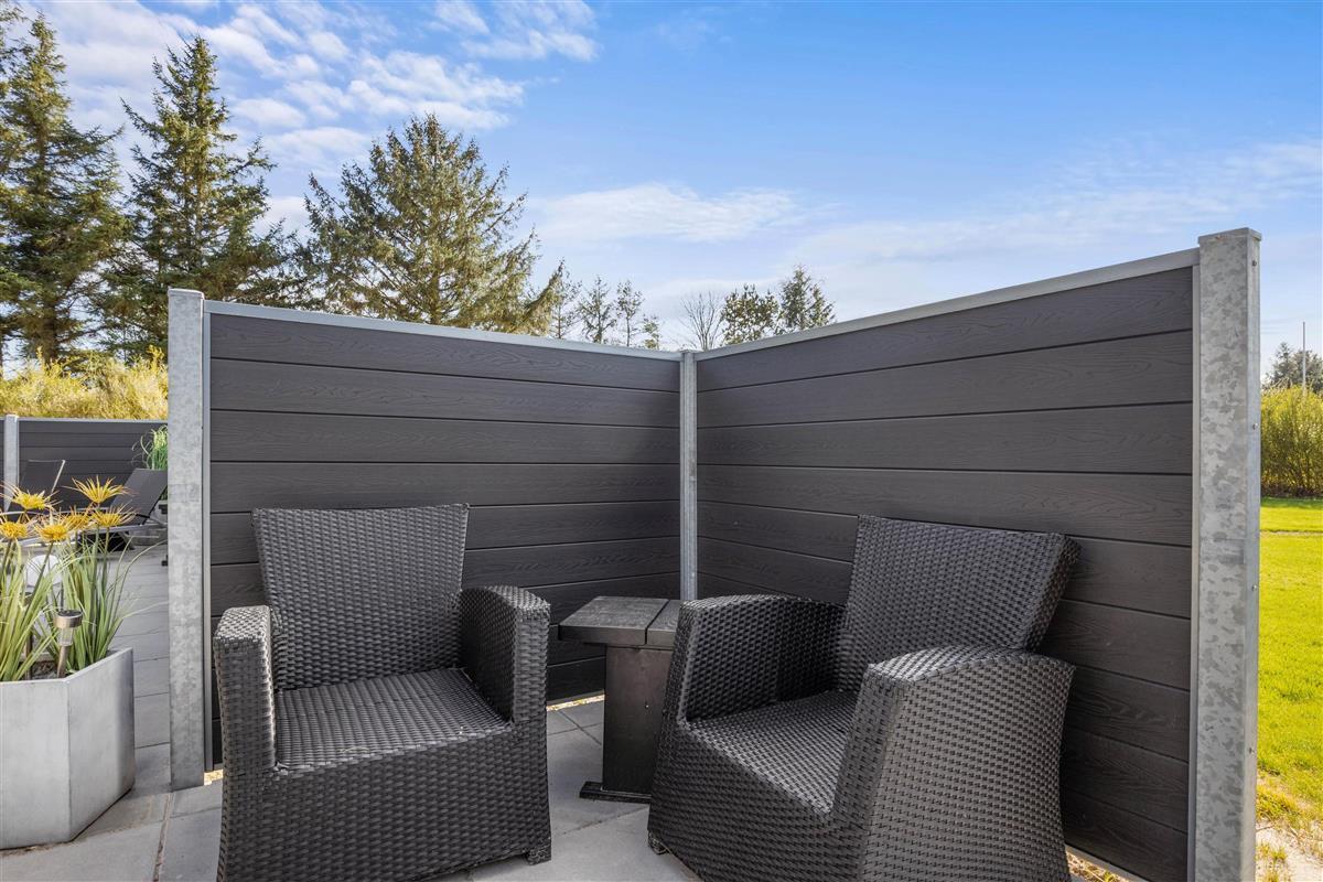 The natural grounds of the holiday home at Blomstervangen 70 provide plenty of space for children to play and adults to relax. The boccia court is ready for one game or another. On the private terrace, which offers undisturbed outdoor moments, you can enjoy your morning coffee or end the day with a lovely barbecue. During changeable weather, you can retreat to the covered terrace section.