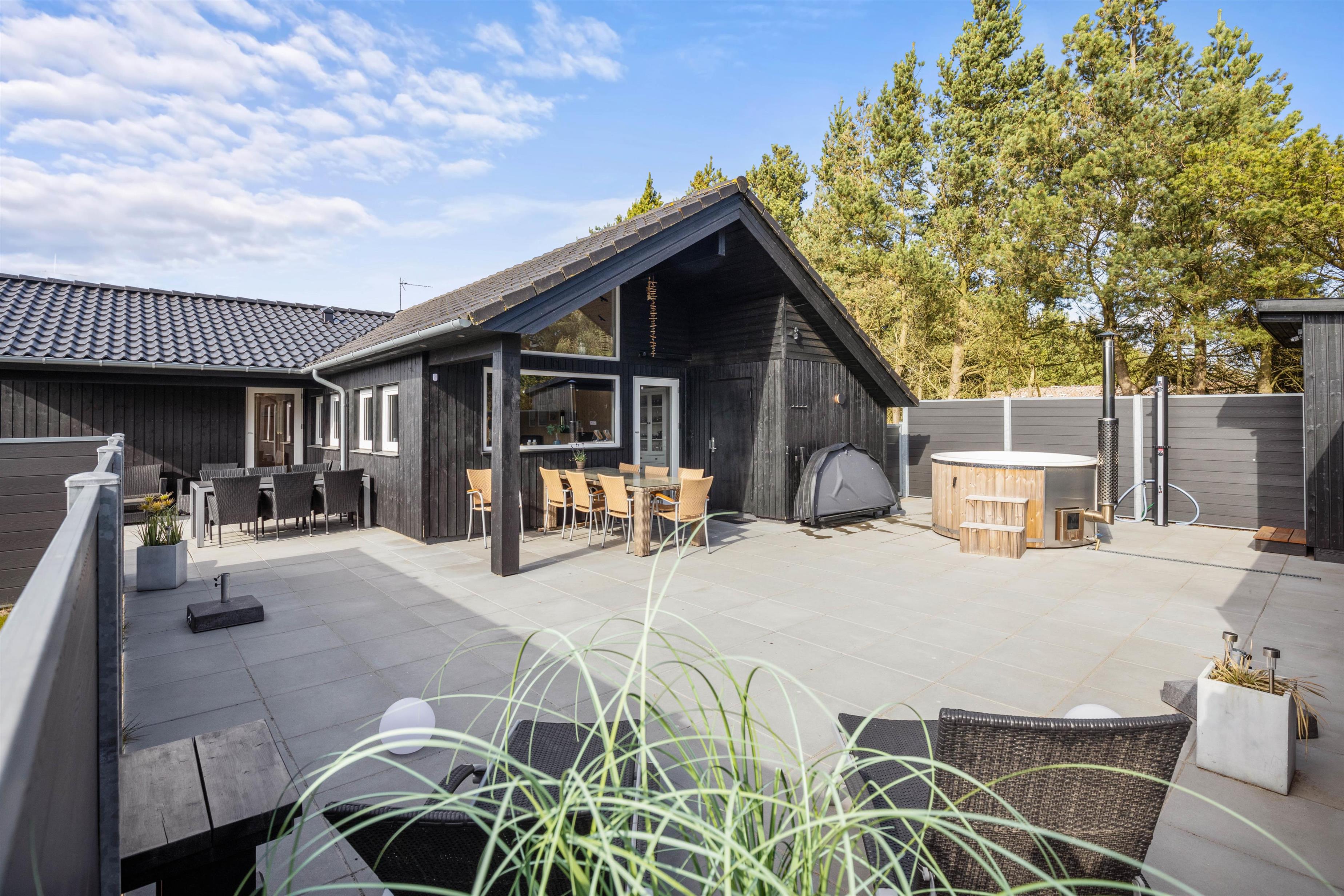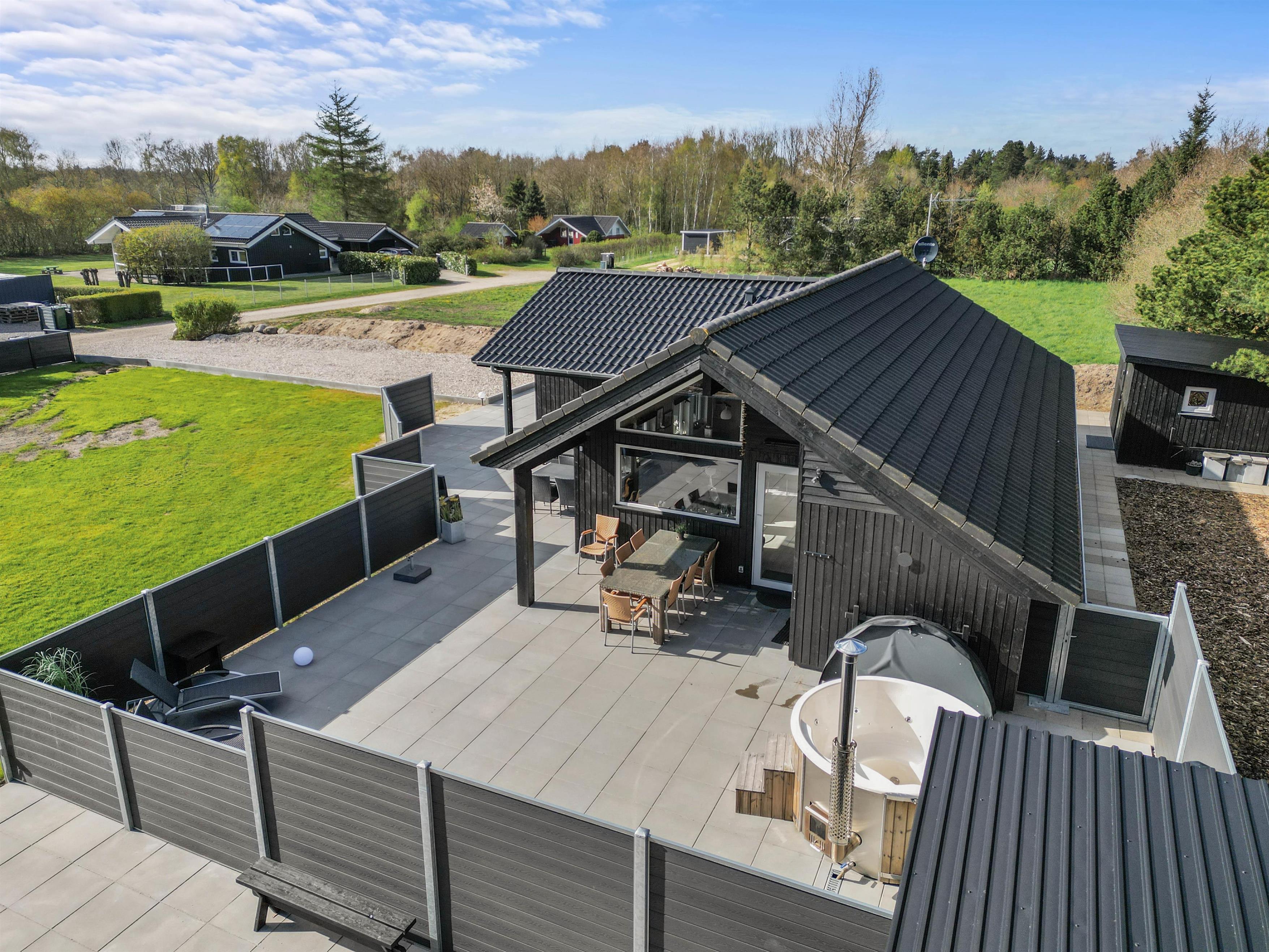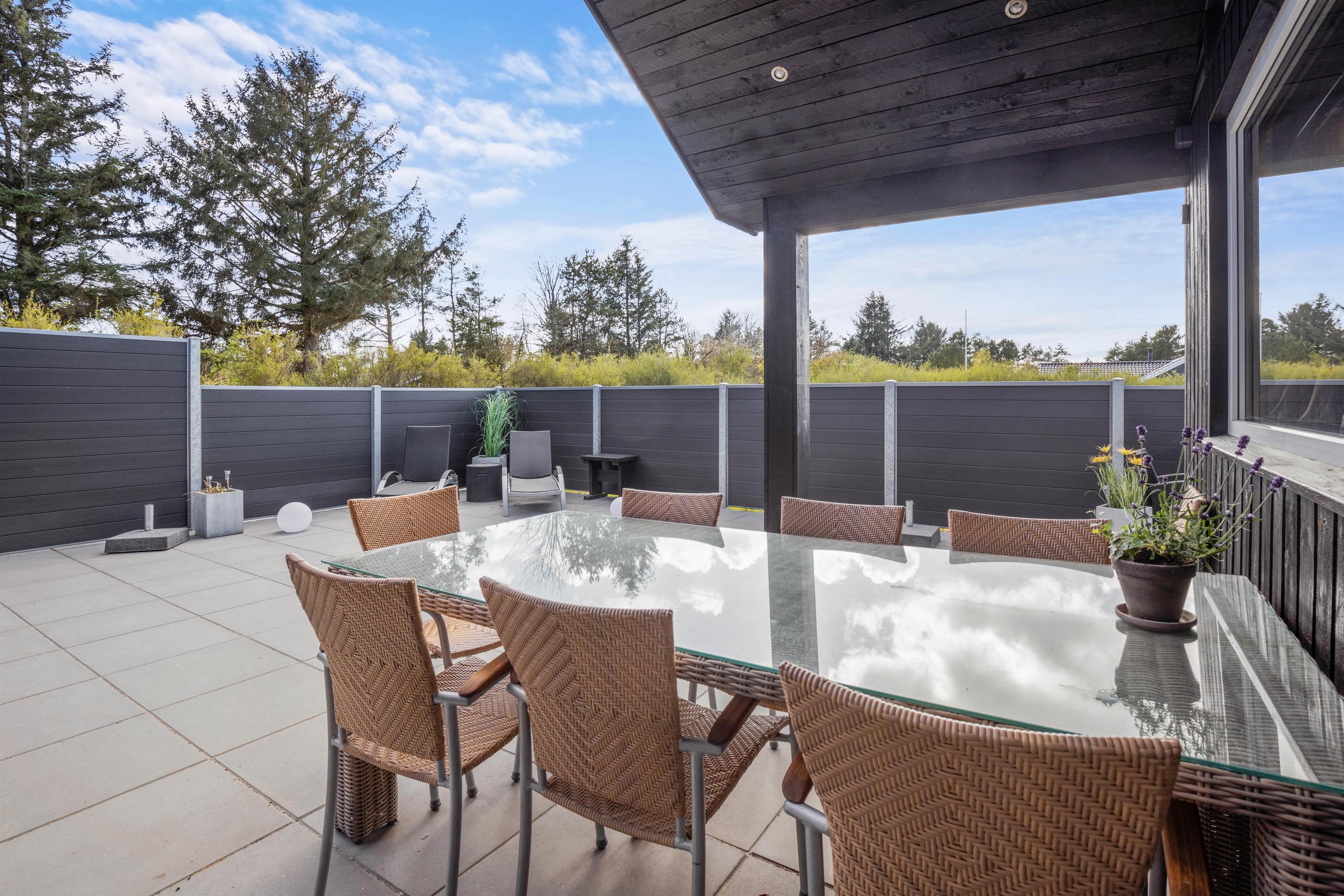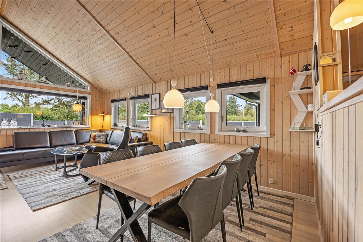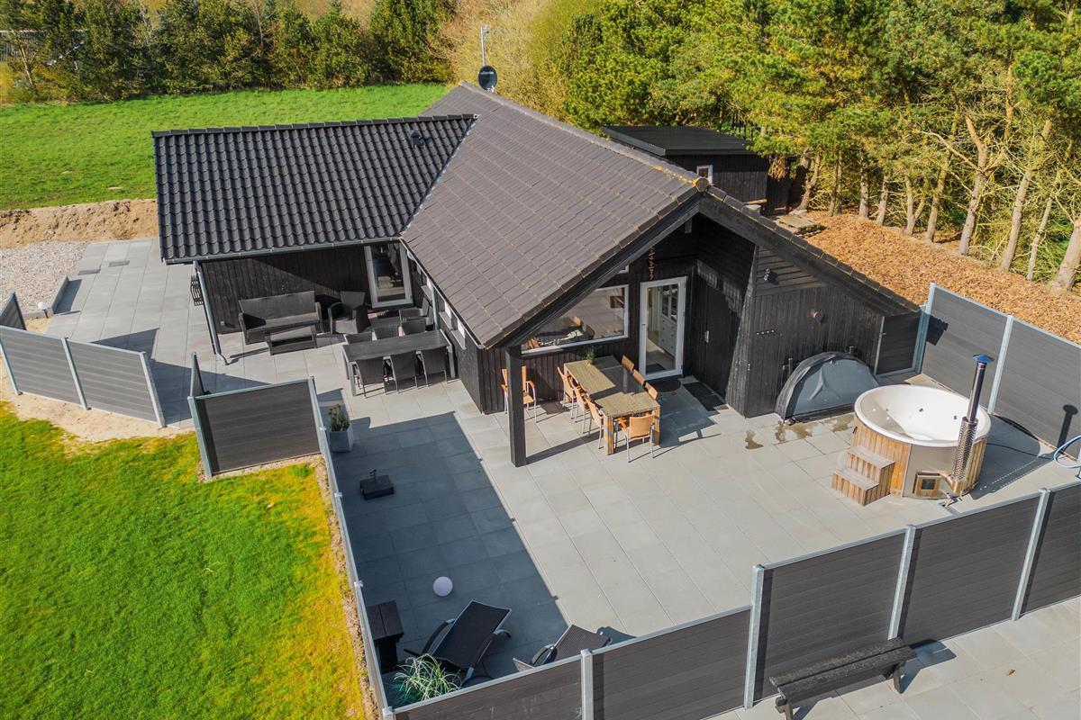 The natural grounds of the holiday home at Blomstervangen 70 provide plenty of space for children to play and adults to relax. The boccia court is ready for one game or another. On the private terrace, which offers undisturbed outdoor moments, you can enjoy your morning coffee or end the day with a lovely barbecue. During changeable weather, you can retreat to the covered terrace section.