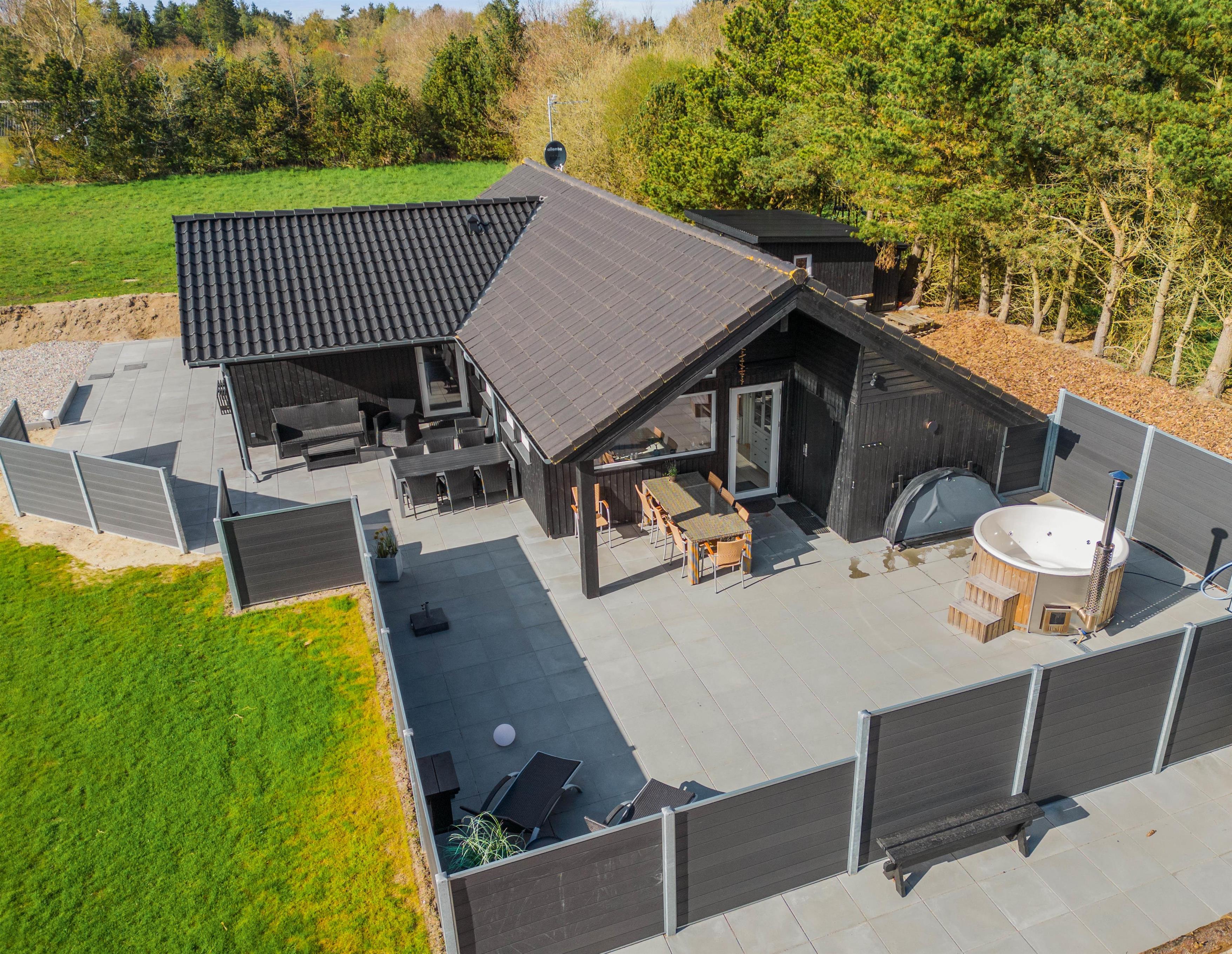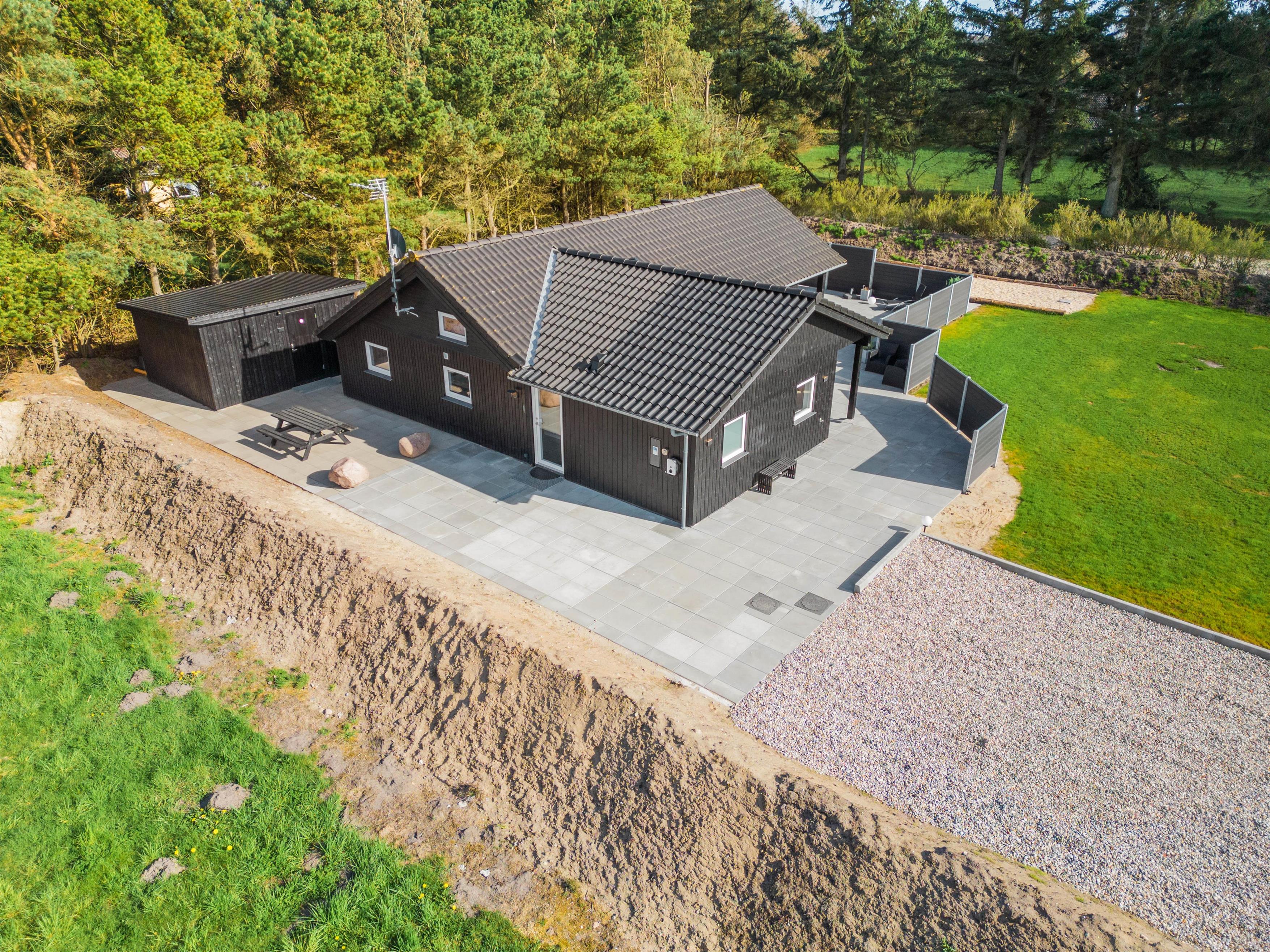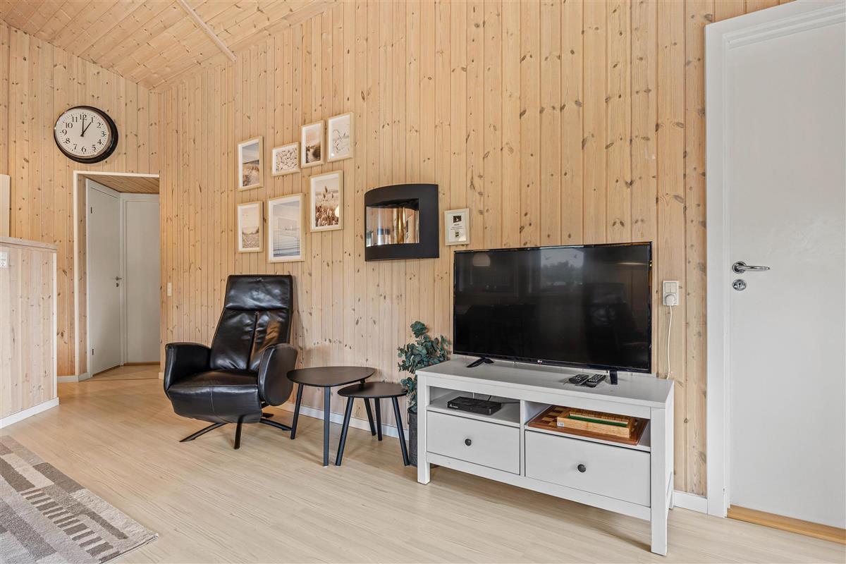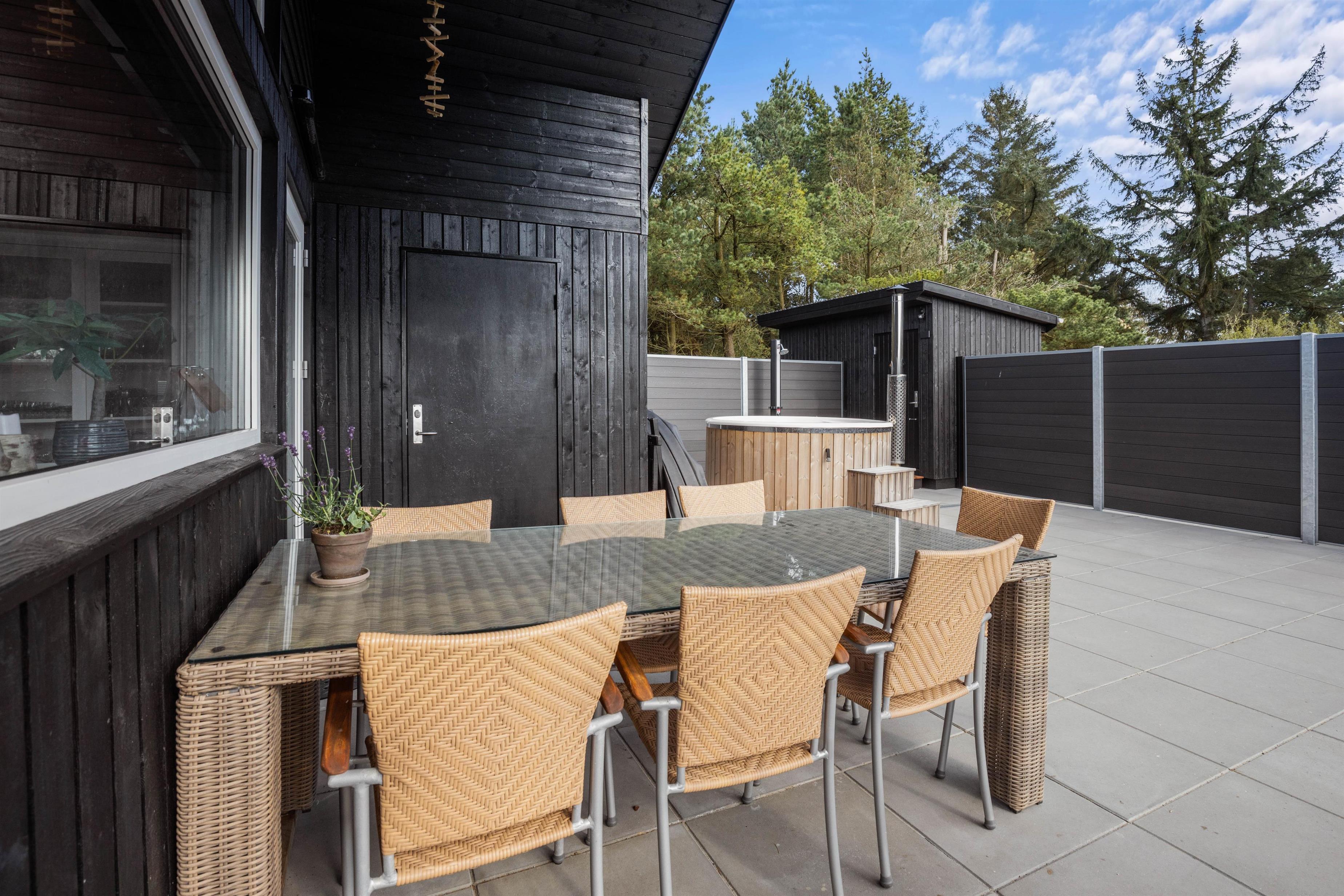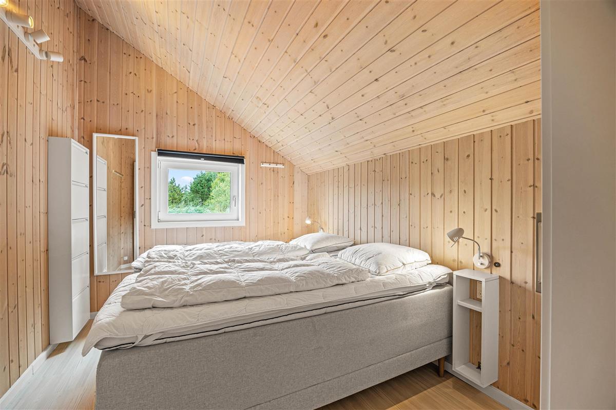 The natural grounds of the holiday home at Blomstervangen 70 provide plenty of space for children to play and adults to relax. The boccia court is ready for one game or another. On the private terrace, which offers undisturbed outdoor moments, you can enjoy your morning coffee or end the day with a lovely barbecue. During changeable weather, you can retreat to the covered terrace section.