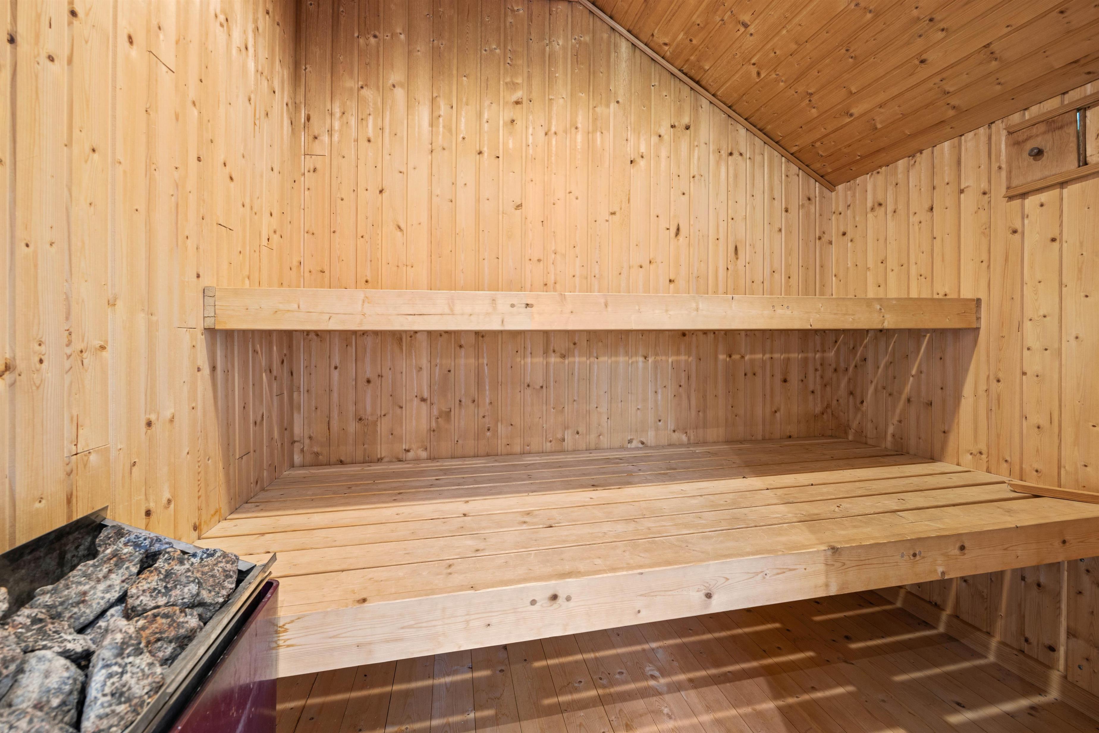 Premium amenities including sauna, whirlpool + pellet stove