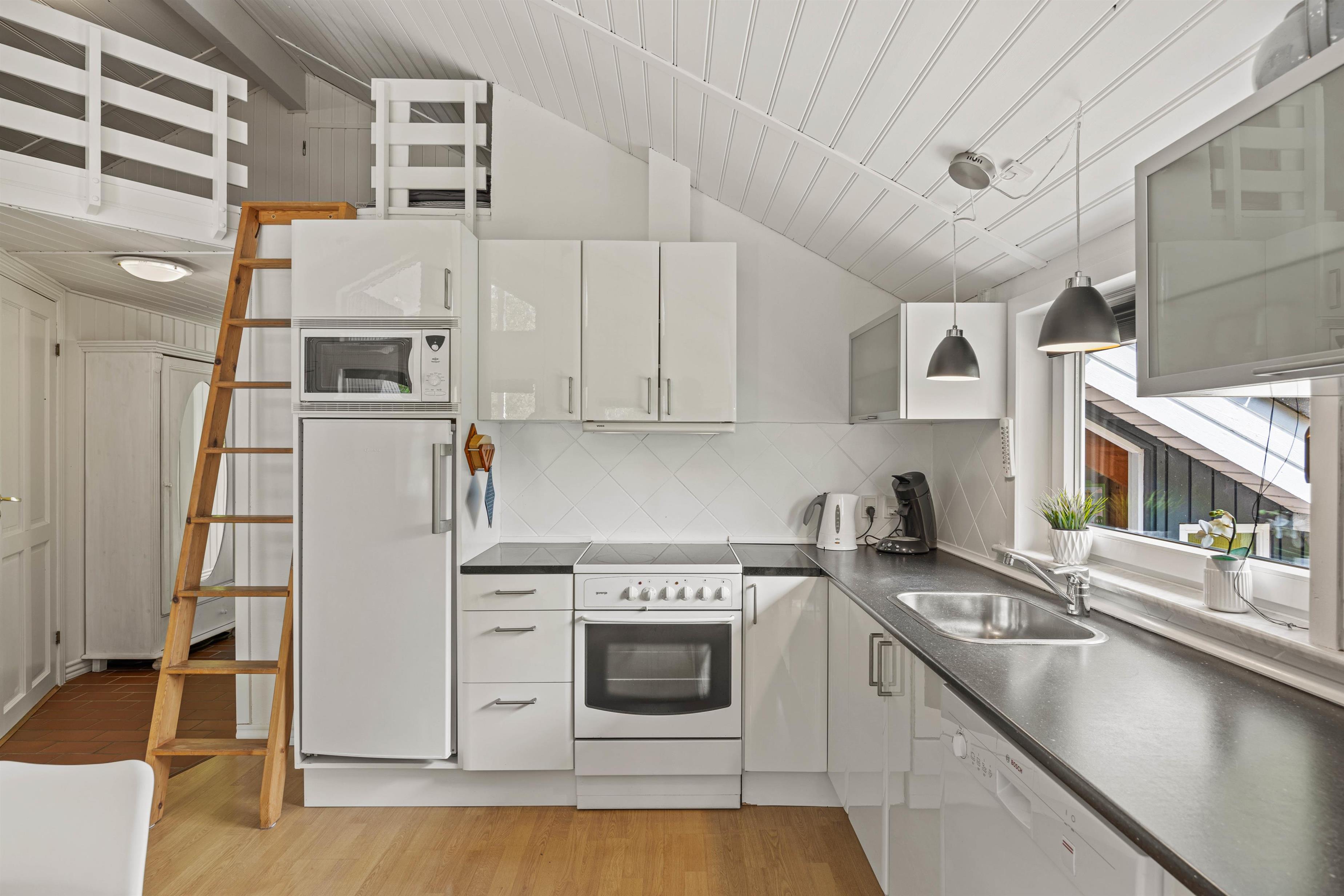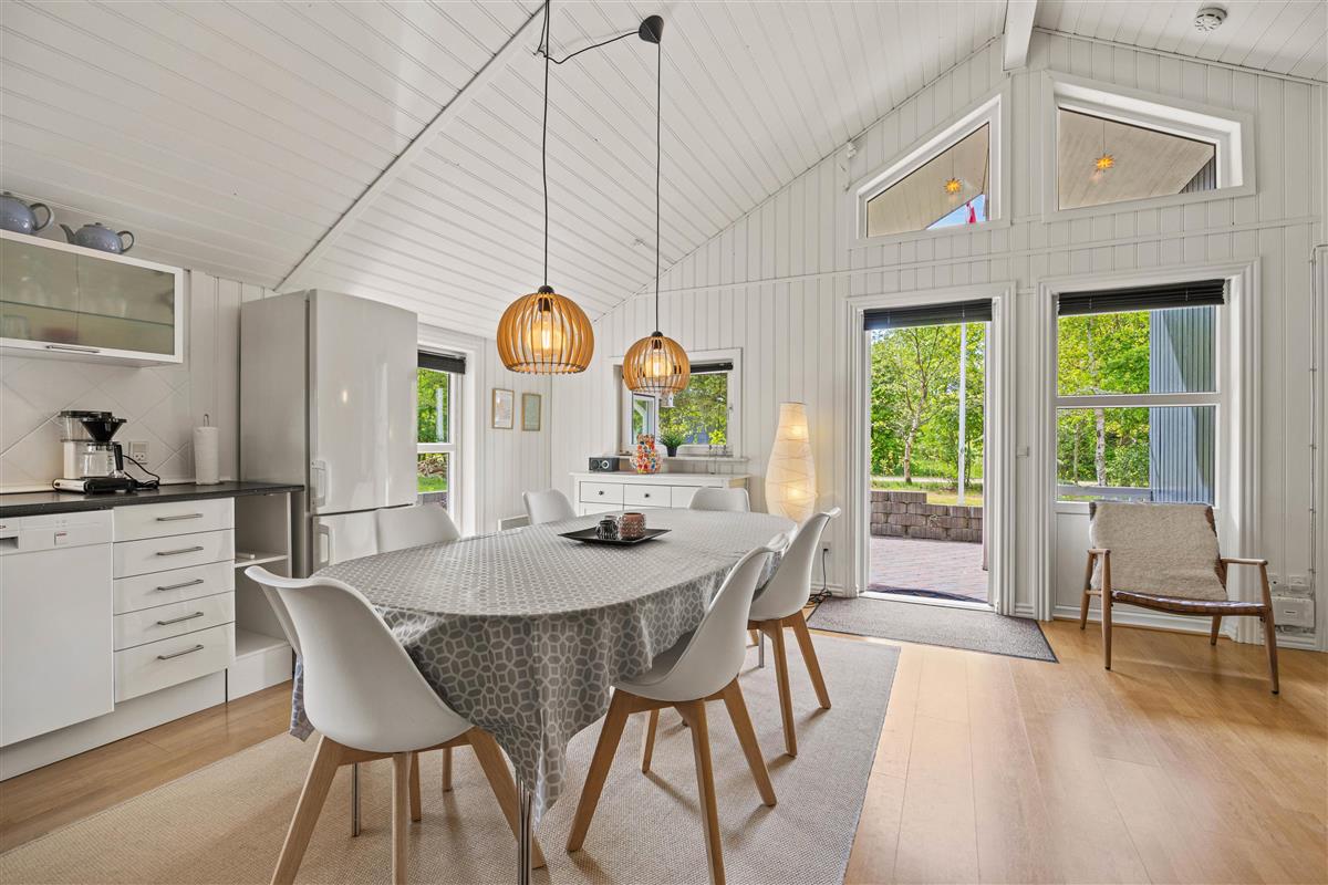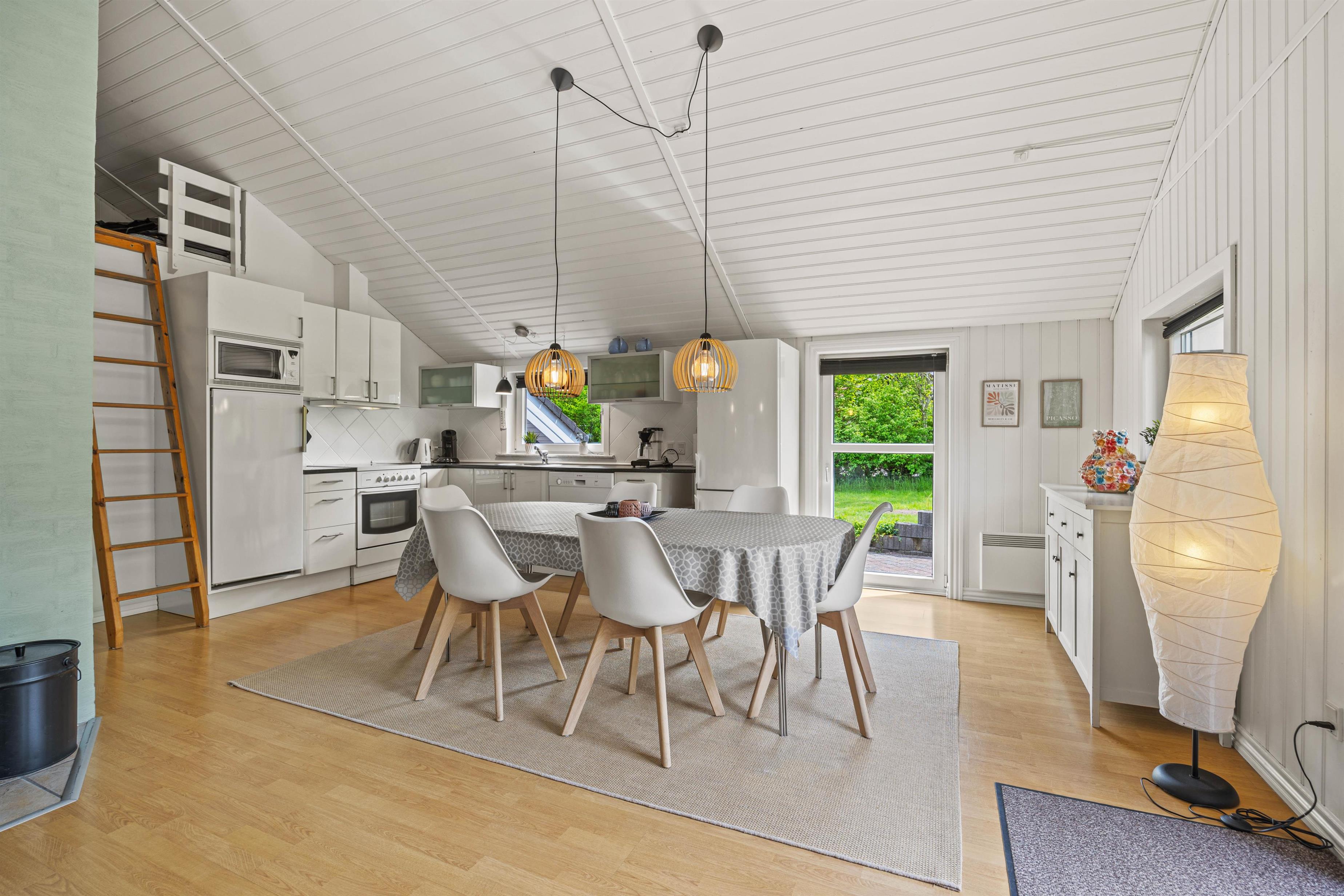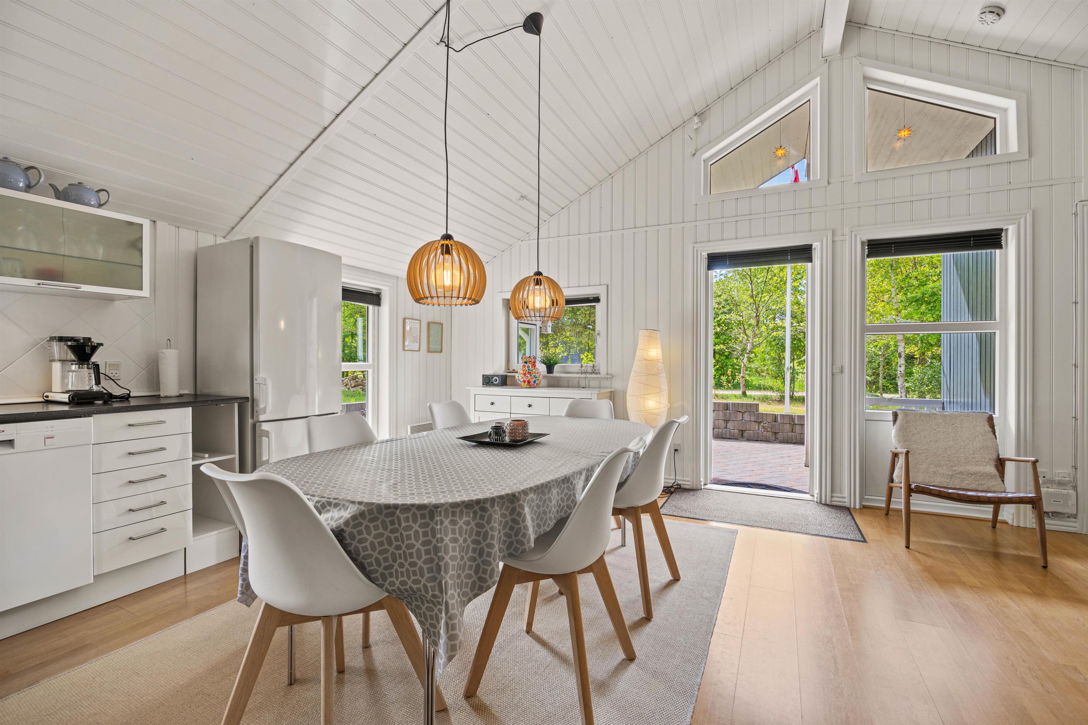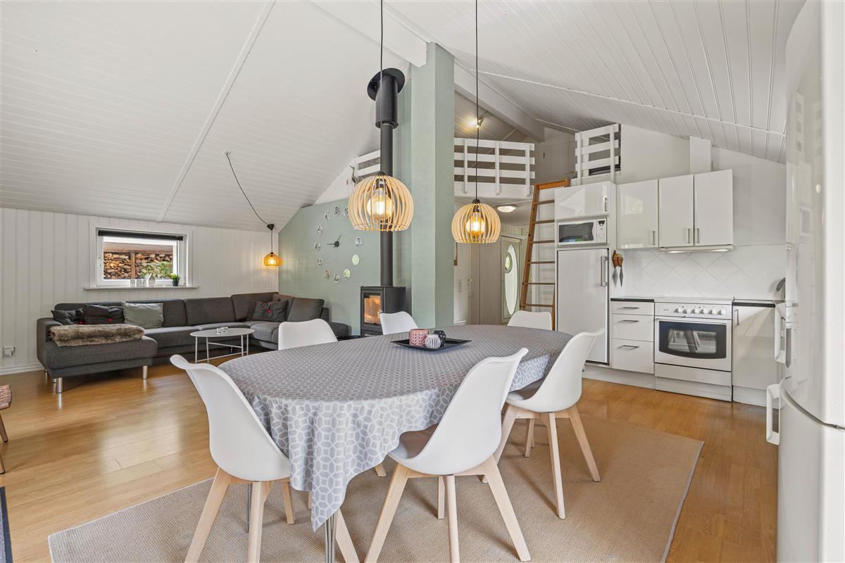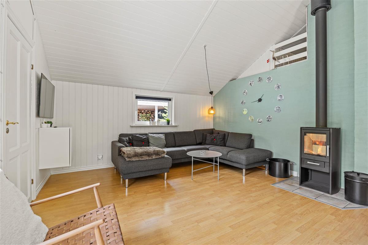 Moving further inside, you’ll find the spacious kitchen-living area, where a conversation-friendly kitchen and dishwasher make cooking a pleasure. The living room is equipped with a wood-burning stove, adding a cozy ambiance and warmth on cooler evenings.