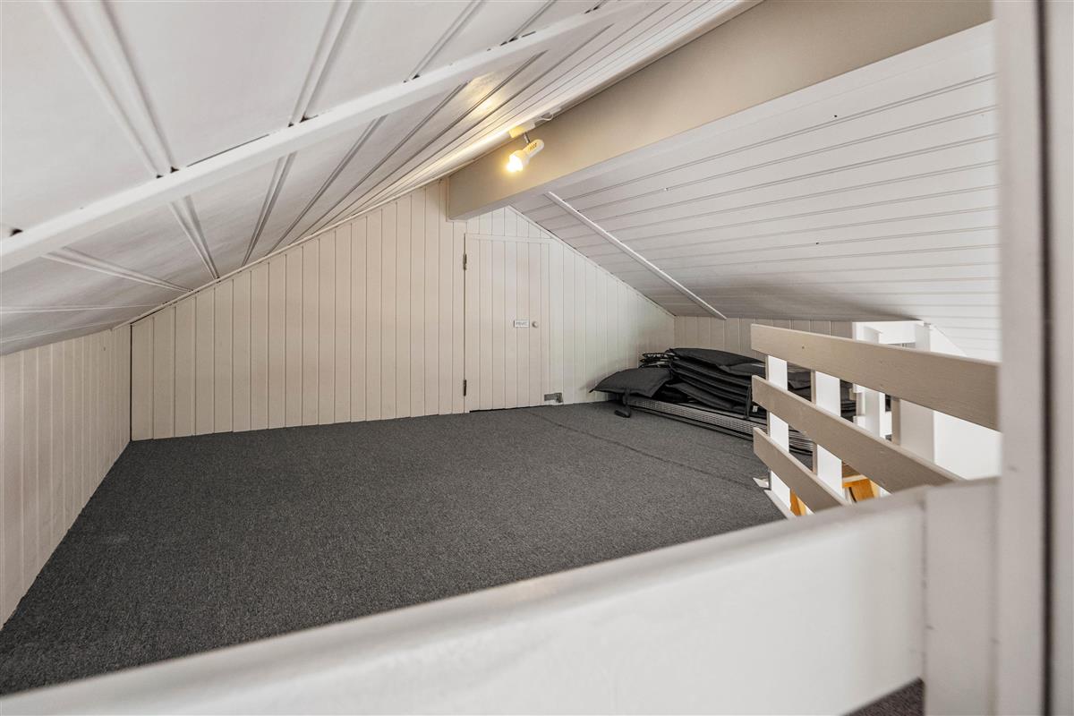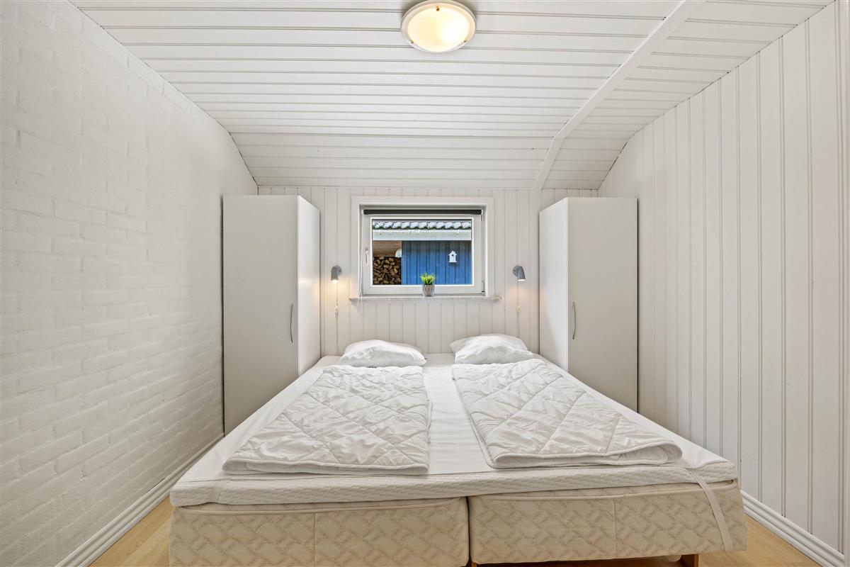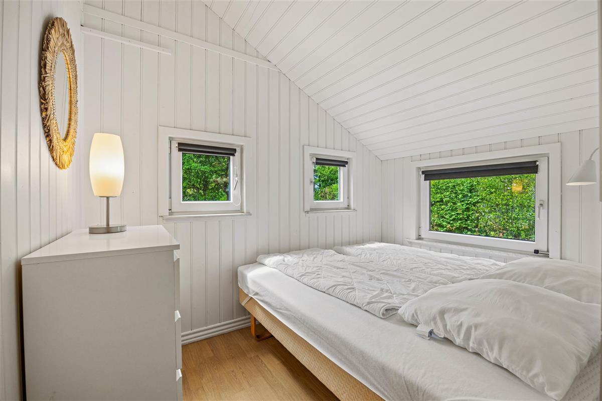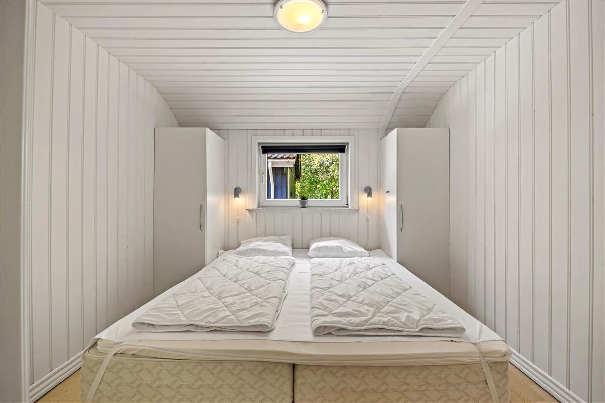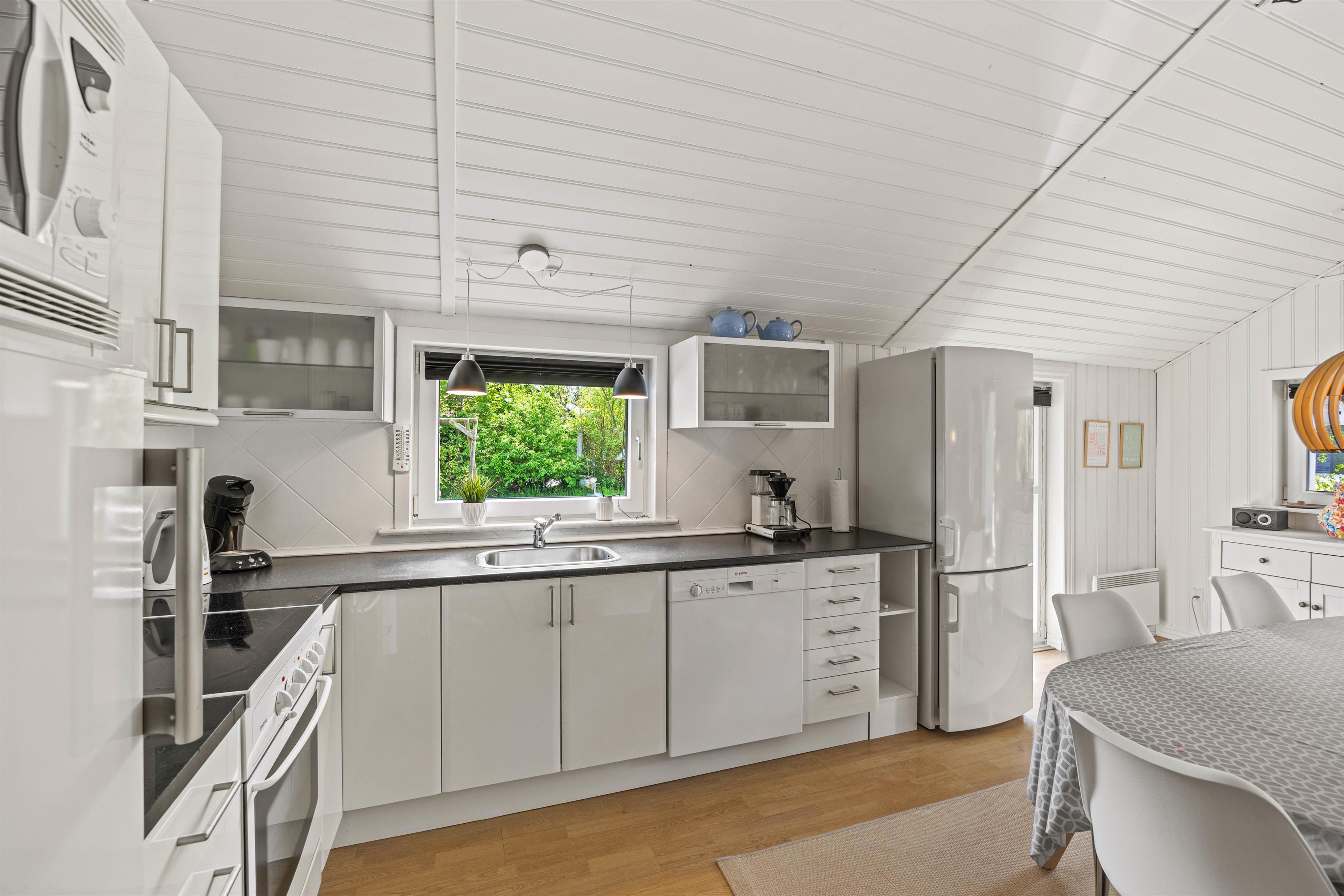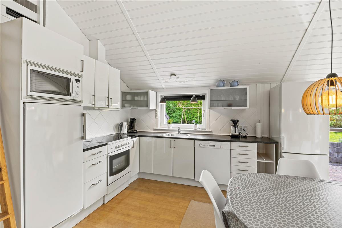 Moving further inside, you’ll find the spacious kitchen-living area, where a conversation-friendly kitchen and dishwasher make cooking a pleasure. The living room is equipped with a wood-burning stove, adding a cozy ambiance and warmth on cooler evenings.