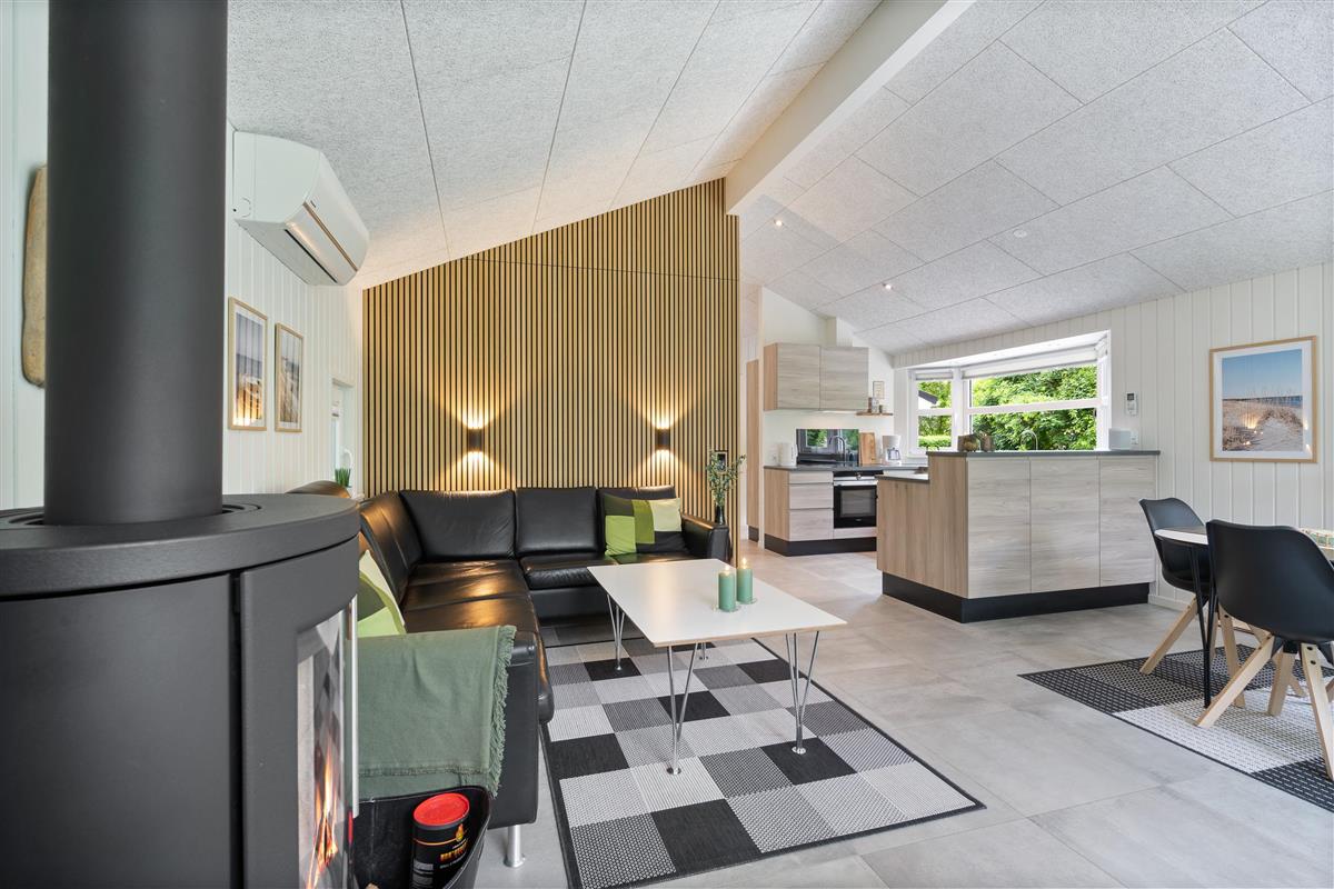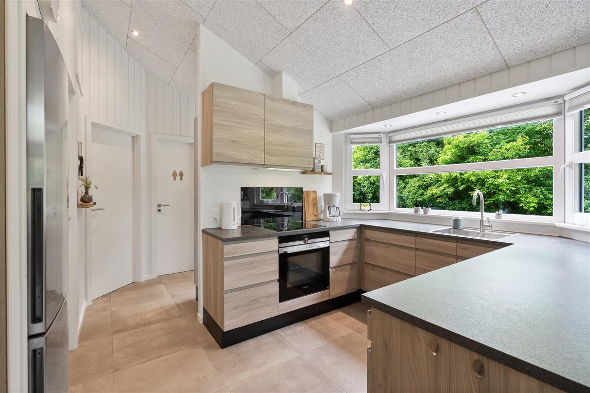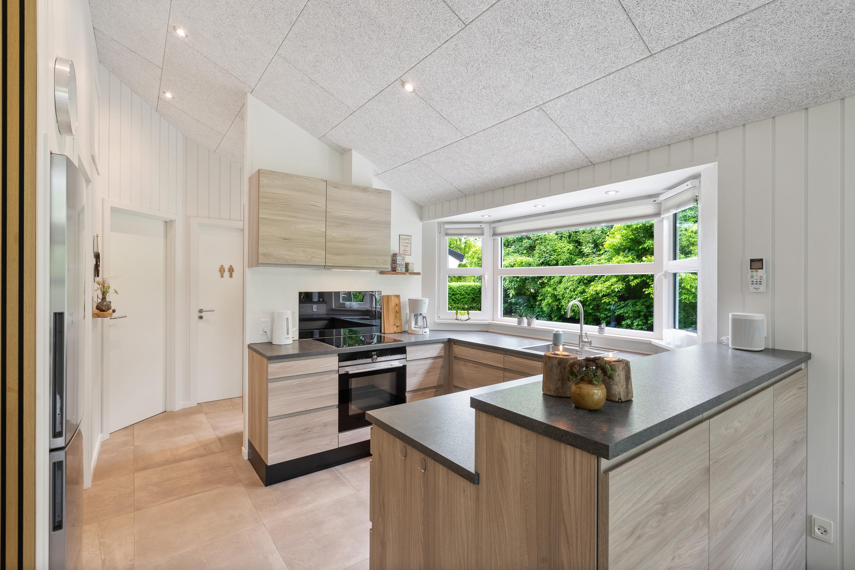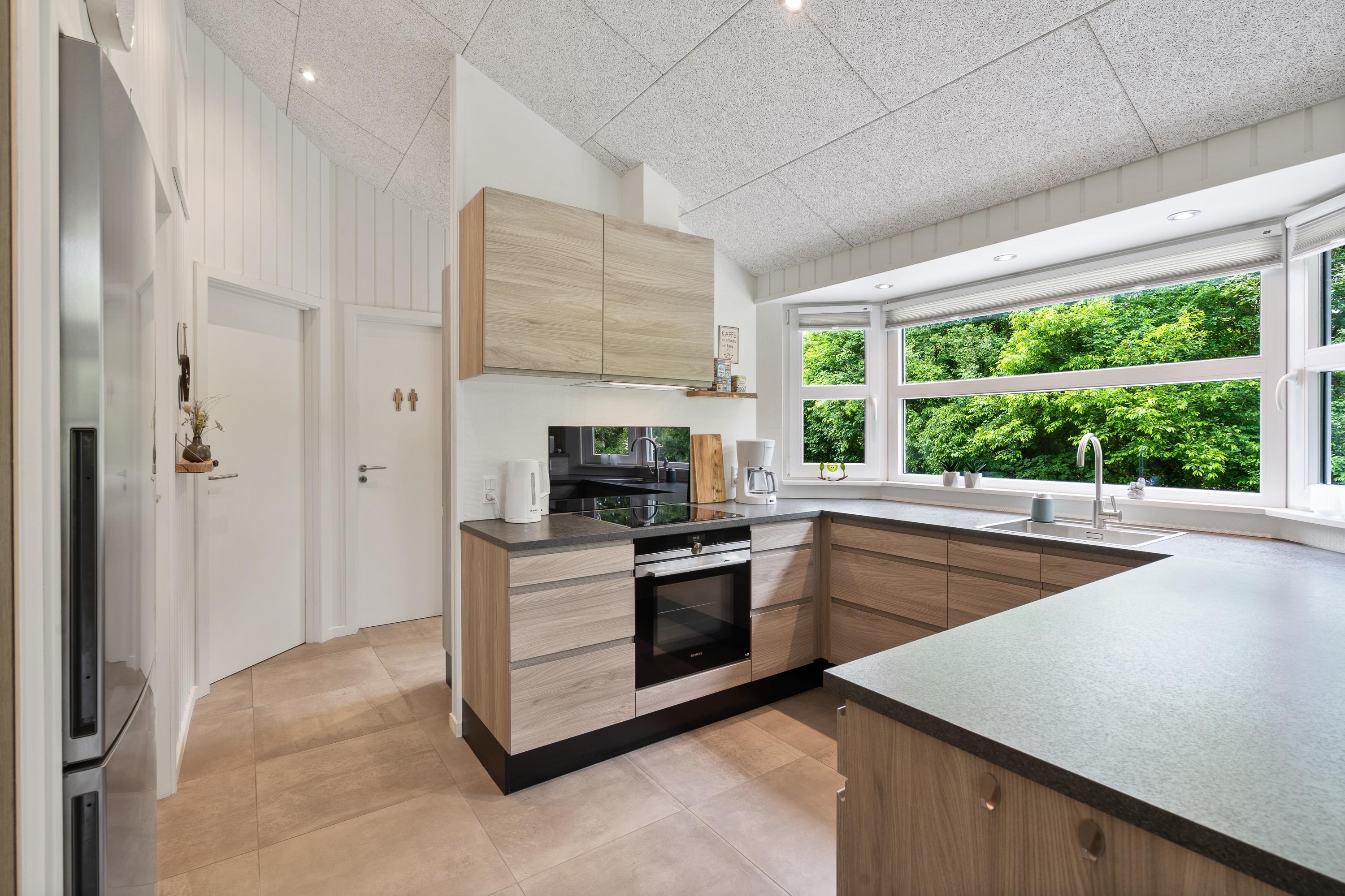 The wood-burning stove in the living room ensures cosy evenings, while the large sofa invites you to unwind. The large windows provide beautiful views of the natural surroundings and allow plenty of natural daylight. It's the perfect spot for reading, playing games or simply enjoying the peace and quiet. The kitchen offers all modern conveniences, including a practical dishwasher that makes cleaning up effortless. There's ample space for cooking family meals, and the open-plan layout ensures that whoever's cooking can still participate in conversations and shared moments.