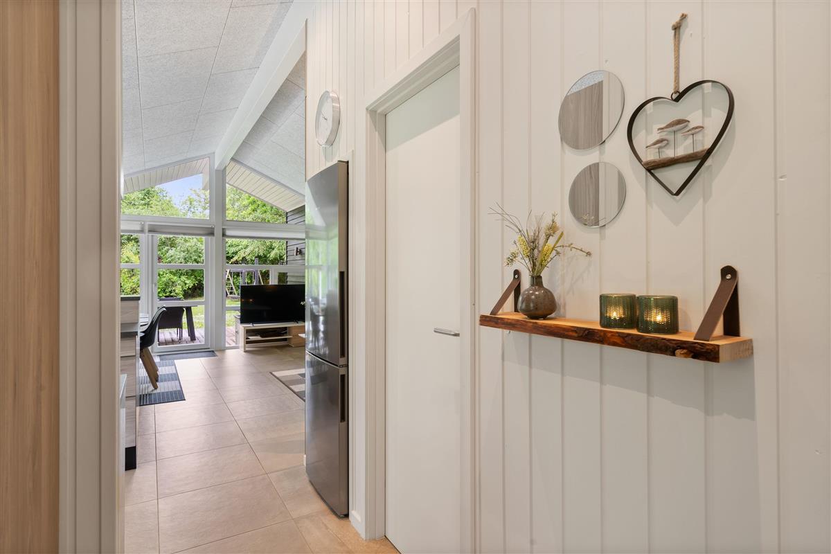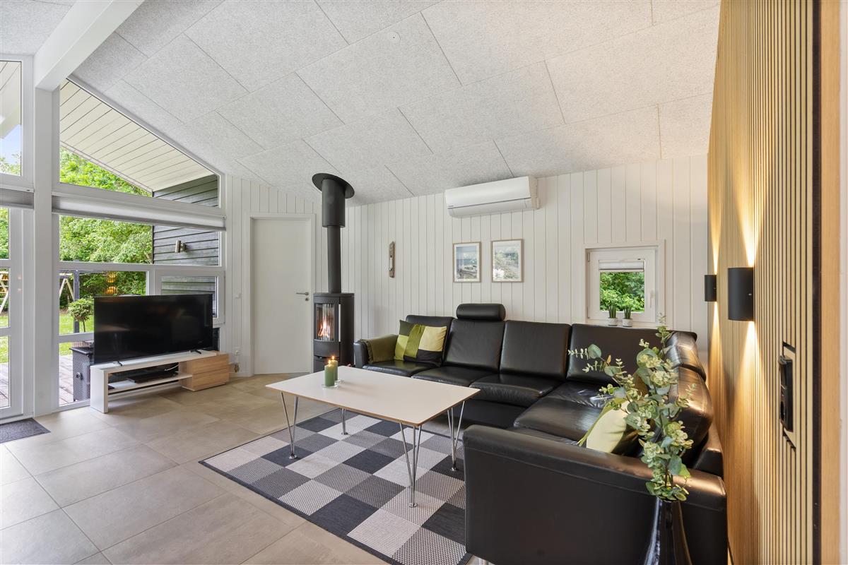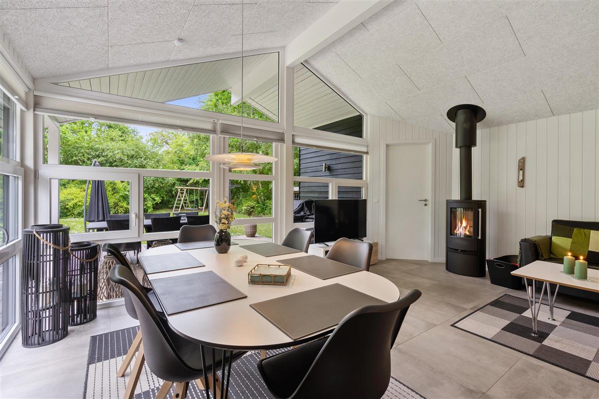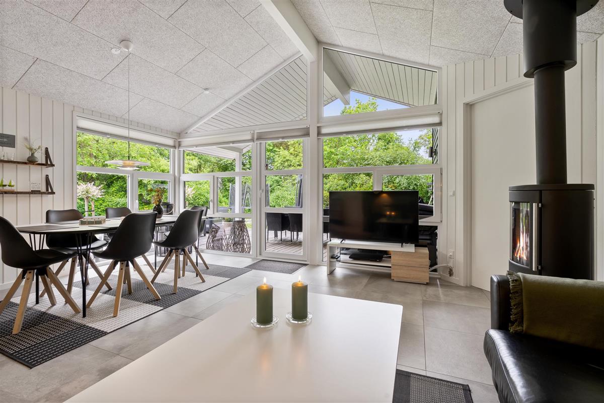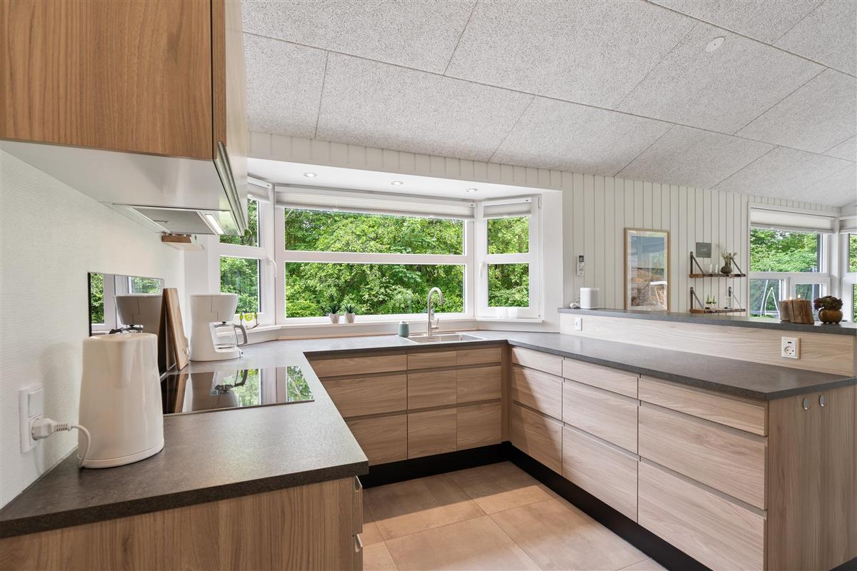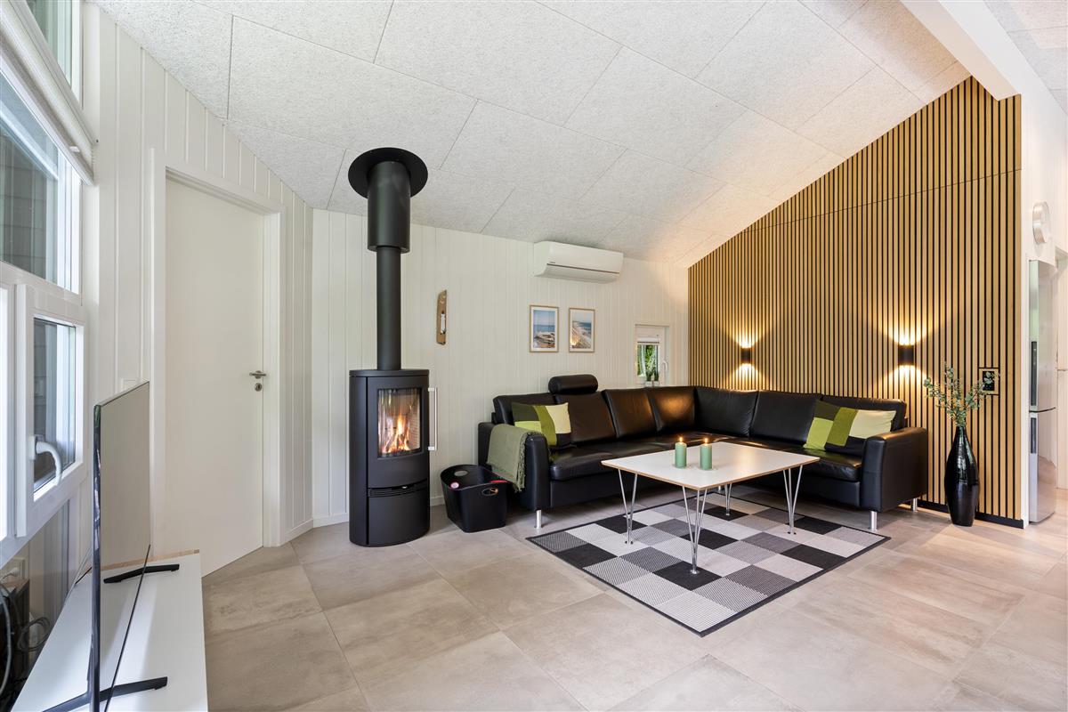 The wood-burning stove in the living room ensures cosy evenings, while the large sofa invites you to unwind. The large windows provide beautiful views of the natural surroundings and allow plenty of natural daylight. It's the perfect spot for reading, playing games or simply enjoying the peace and quiet. The kitchen offers all modern conveniences, including a practical dishwasher that makes cleaning up effortless. There's ample space for cooking family meals, and the open-plan layout ensures that whoever's cooking can still participate in conversations and shared moments.