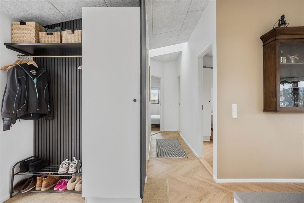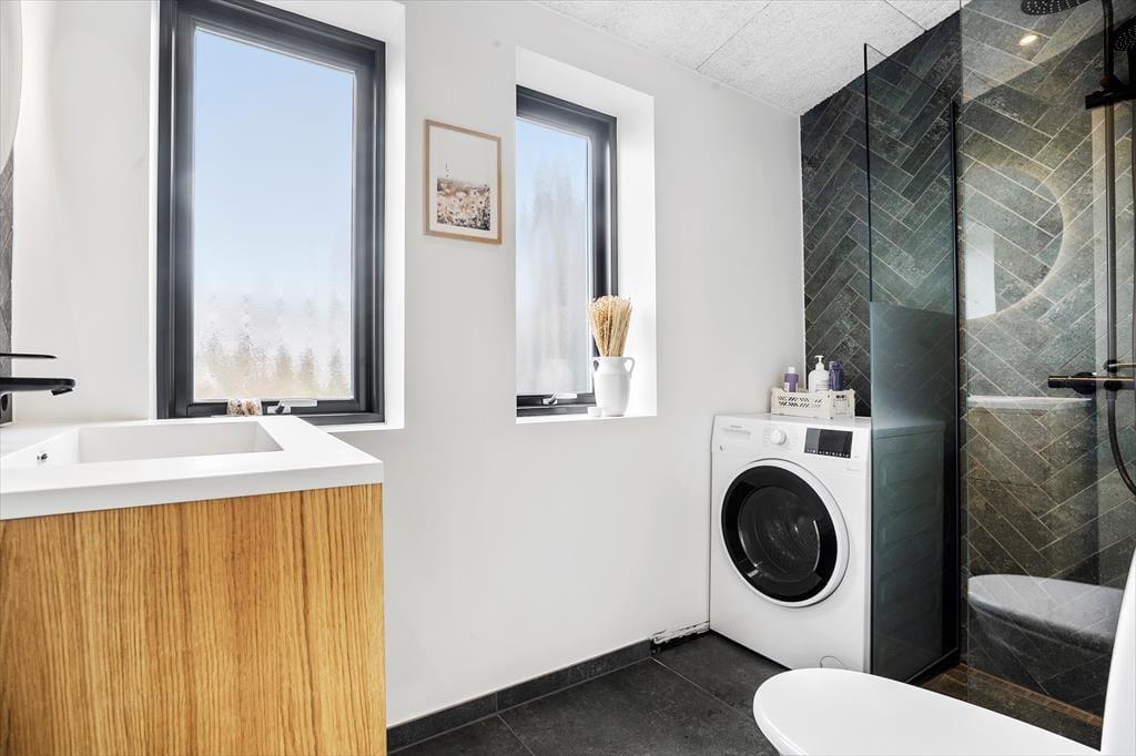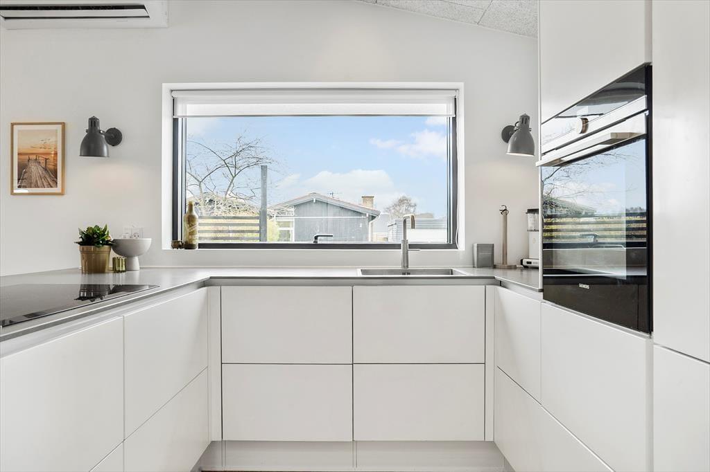 Das Ferienhaus ist mit einer Eingangshalle ausgestattet, in der Sie Ihre Jacke aufhängen und Ihre Schuhe zur Seite stellen können. Von der Eingangshalle aus gelangt man in das Herzstück des Ferienhauses, die helle Essküche, die offen mit dem Wohnzimmer verbunden ist. Hier ist Platz, um die Familie zu versammeln, um gemeinsam zu essen, Brettspiele zu spielen und sich auf der Sofalandschaft zu entspannen. Von hier aus haben Sie Zugang zum schönen Badezimmer des Hauses mit Waschmaschine und zu 3 guten Schlafzimmern mit insgesamt 5 Betten.