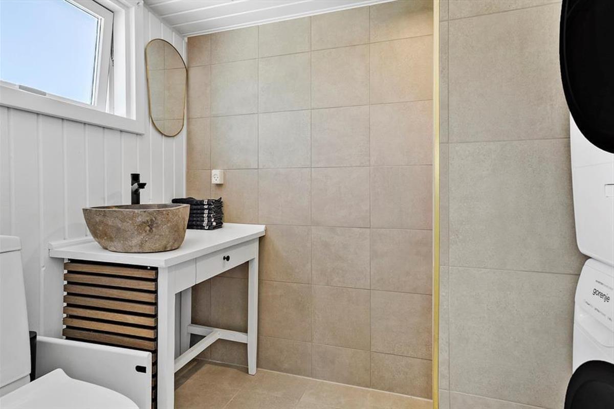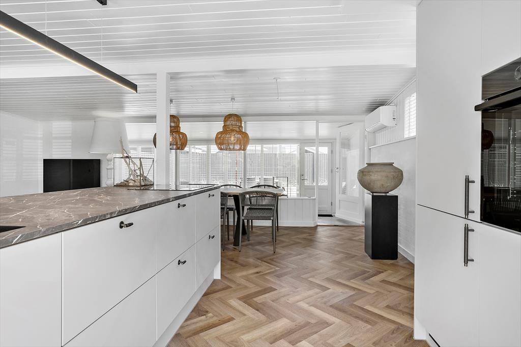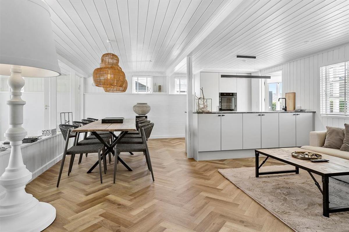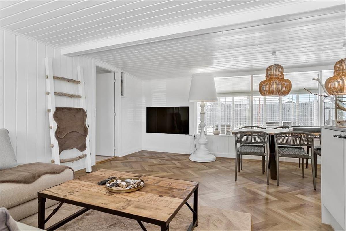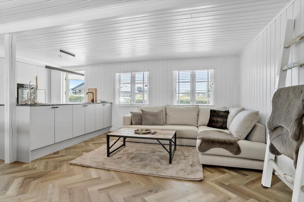 Das Ferienhaus verfügt über eine helle, offene Wohnküche, die nahtlos in das gemütliche Wohnzimmer übergeht. Hier ist Platz für gemeinsame Mahlzeiten, Spieleabende und entspannte Stunden auf dem Sofa. Vom Wohnbereich aus gelangt man ins Badezimmer mit Waschmaschine sowie in drei schöne Schlafzimmer mit insgesamt fünf Schlafplätzen. Zwei der Schlafzimmer sind mit Doppelbetten ausgestattet, das dritte mit einem Einzelbett.