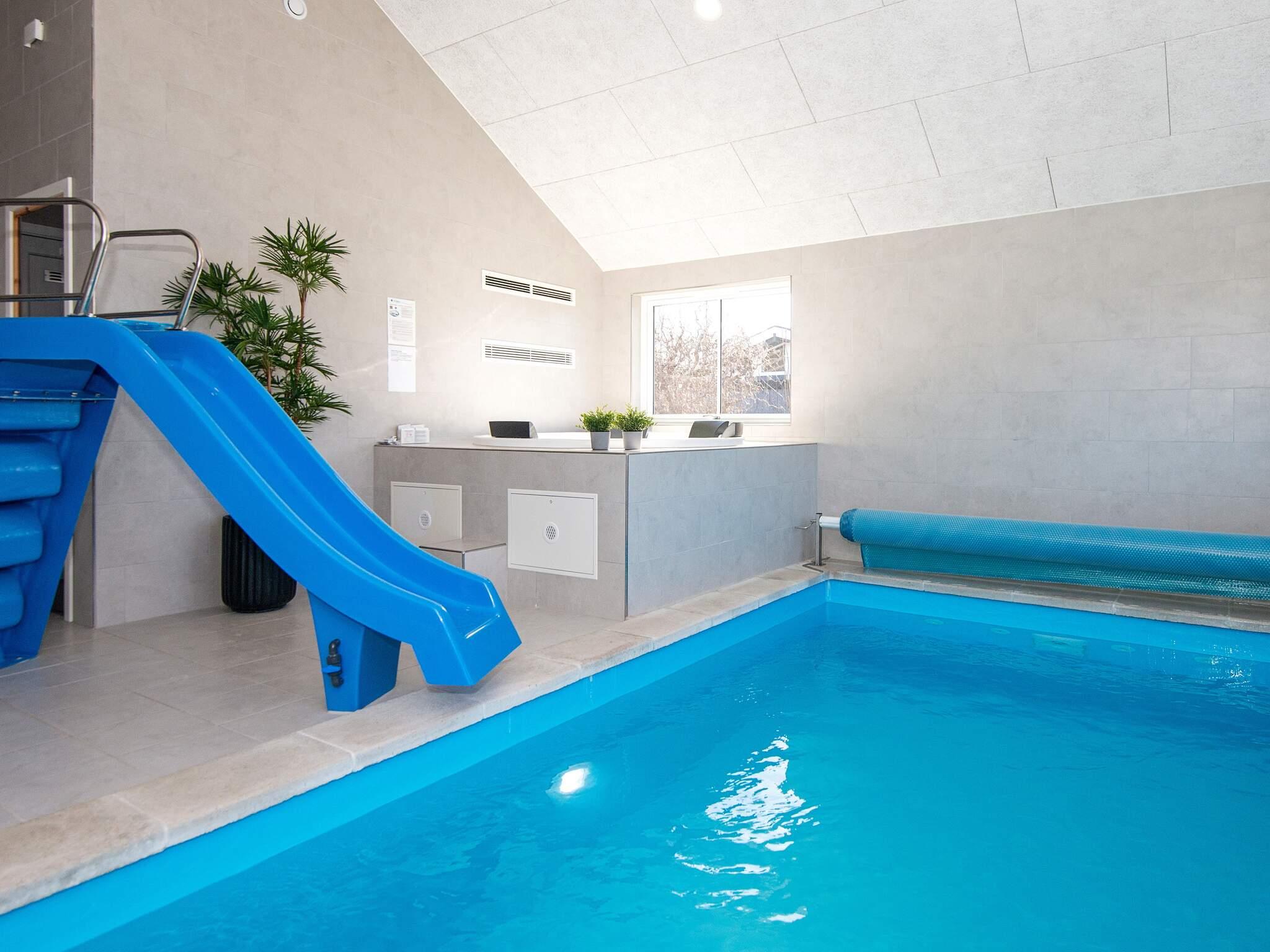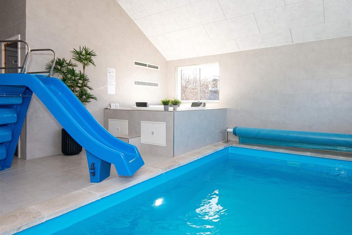 Besonders gut ausgestattetes Ferienhaus in unmittelbarer Strandnähe, mit u.a. einem 18 m² großen Pool mit Rutsche für Kinder und Schwimmtrainer für die Fitness der Erwachsenen zur Verfügung. Zudem stehen zur Entspannung ein Whirlpool und eine Sauna im Poolbereich bereit.